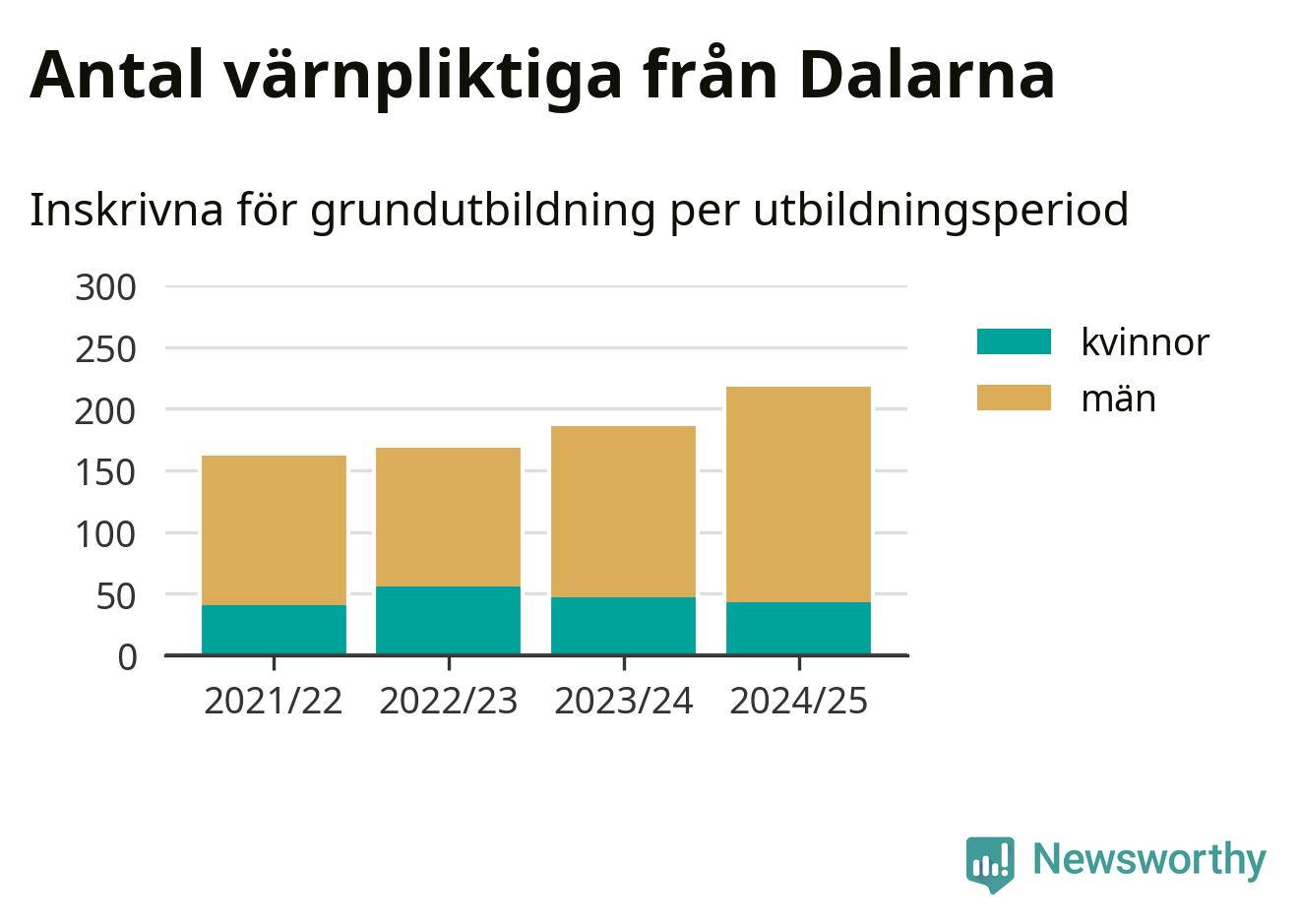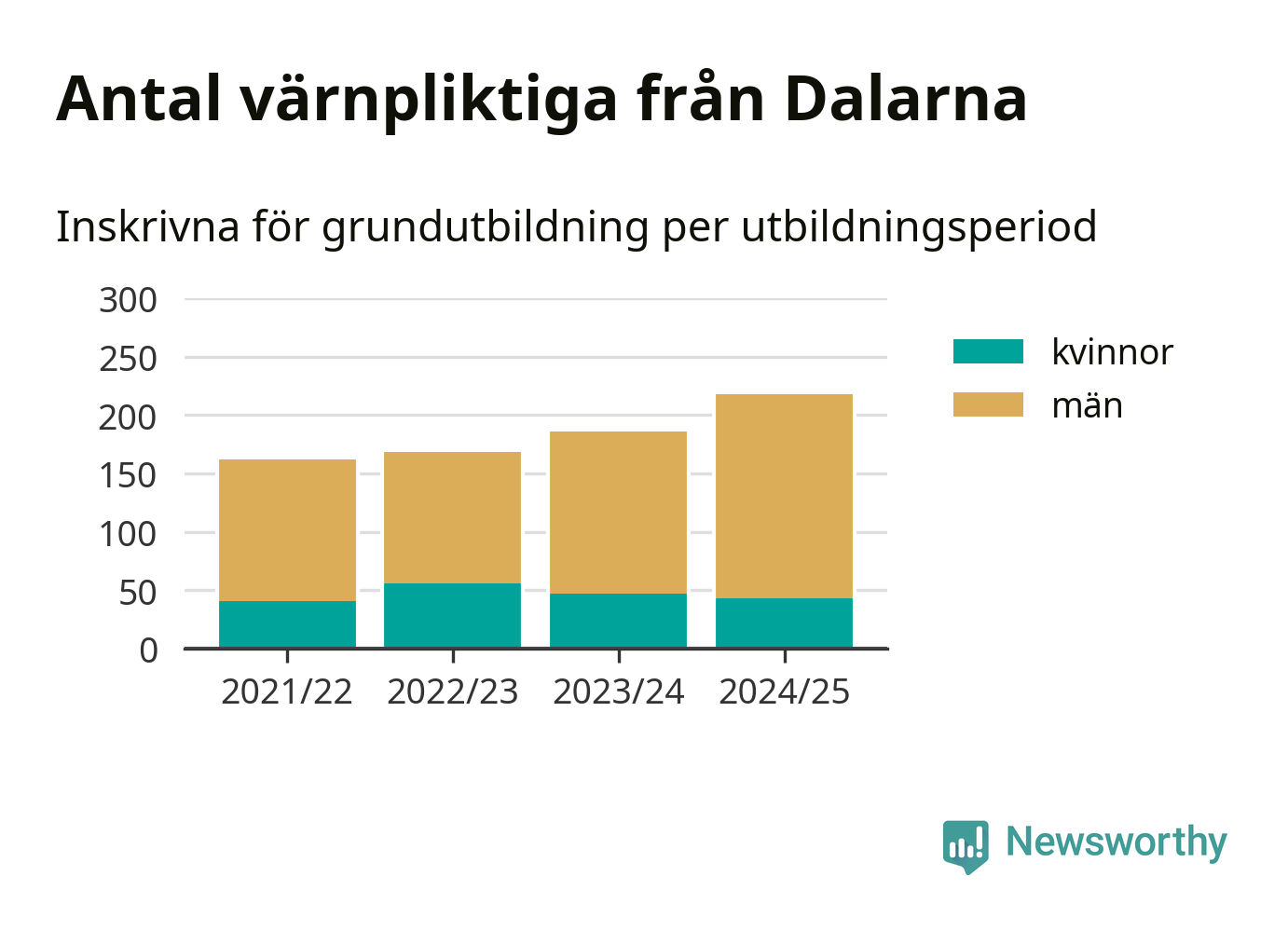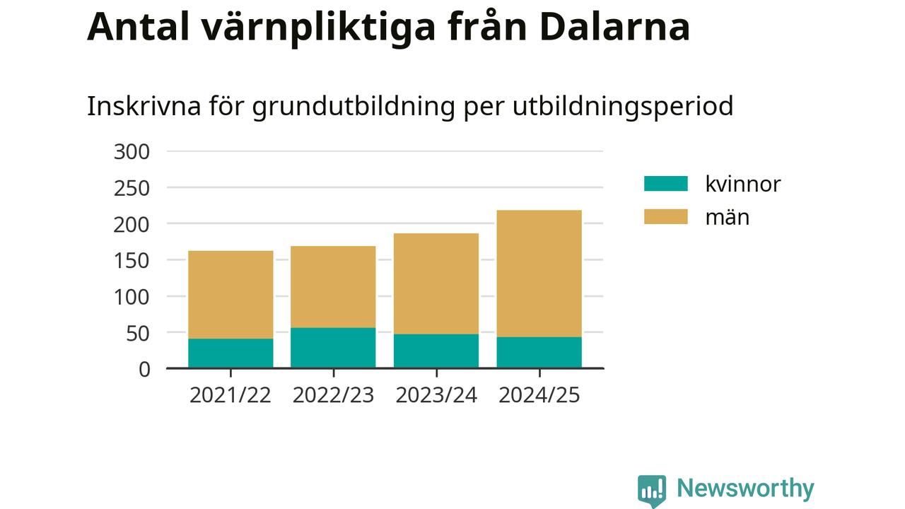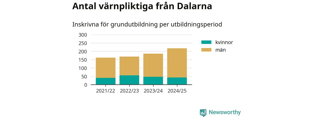 Antalet värnpliktiga från Dalarna ökar stadigt, visar siffror från Plikt- och prövningsverket. Under det här värnpliktsåret, med utbildningsstart från juni 2024 till början av 2025, är 218 värnpliktiga inskrivna för att påbörja sin grundutbildning. Det är den högsta siffran åtminstone sedan 2021/22, vilket är så långt bakåt vi har siffror på länsnivå. Den allmänna värnplikten återinfördes 2018.