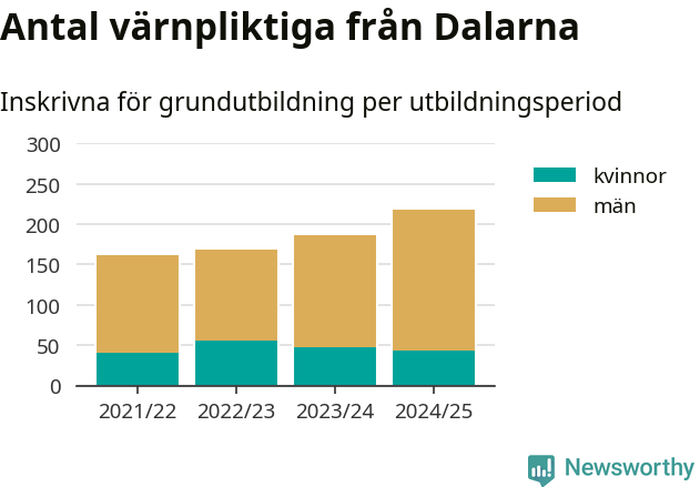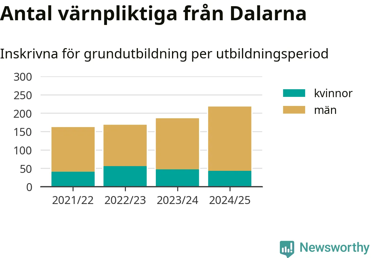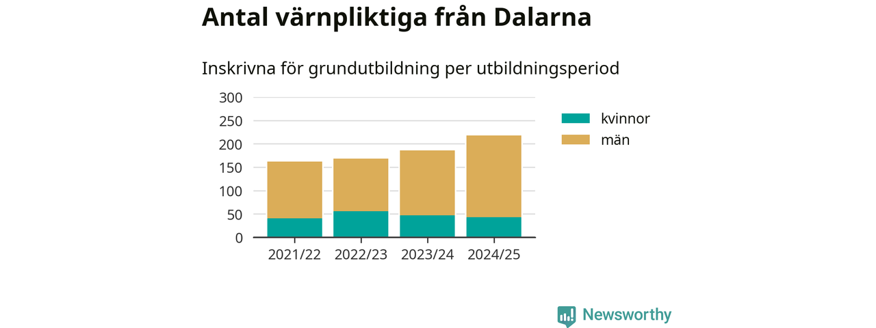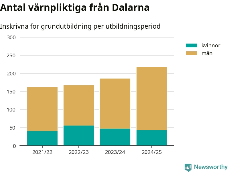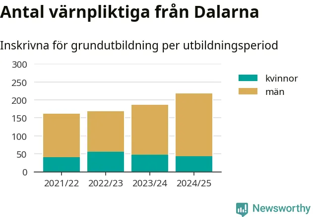 Antalet värnpliktiga från Dalarna ökar stadigt, visar siffror från Plikt- och prövningsverket. Under det här värnpliktsåret, med utbildningsstart från juni 2024 till början av 2025, är 218 värnpliktiga inskrivna för att påbörja sin grundutbildning. Det är den högsta siffran åtminstone sedan 2021/22, vilket är så långt bakåt vi har siffror på länsnivå. Den allmänna värnplikten återinfördes 2018.