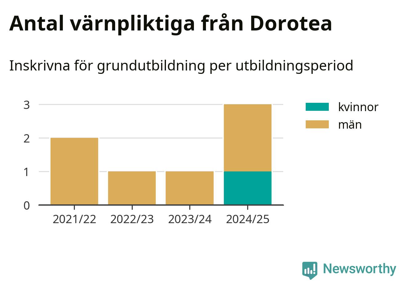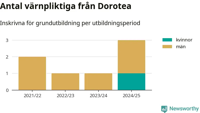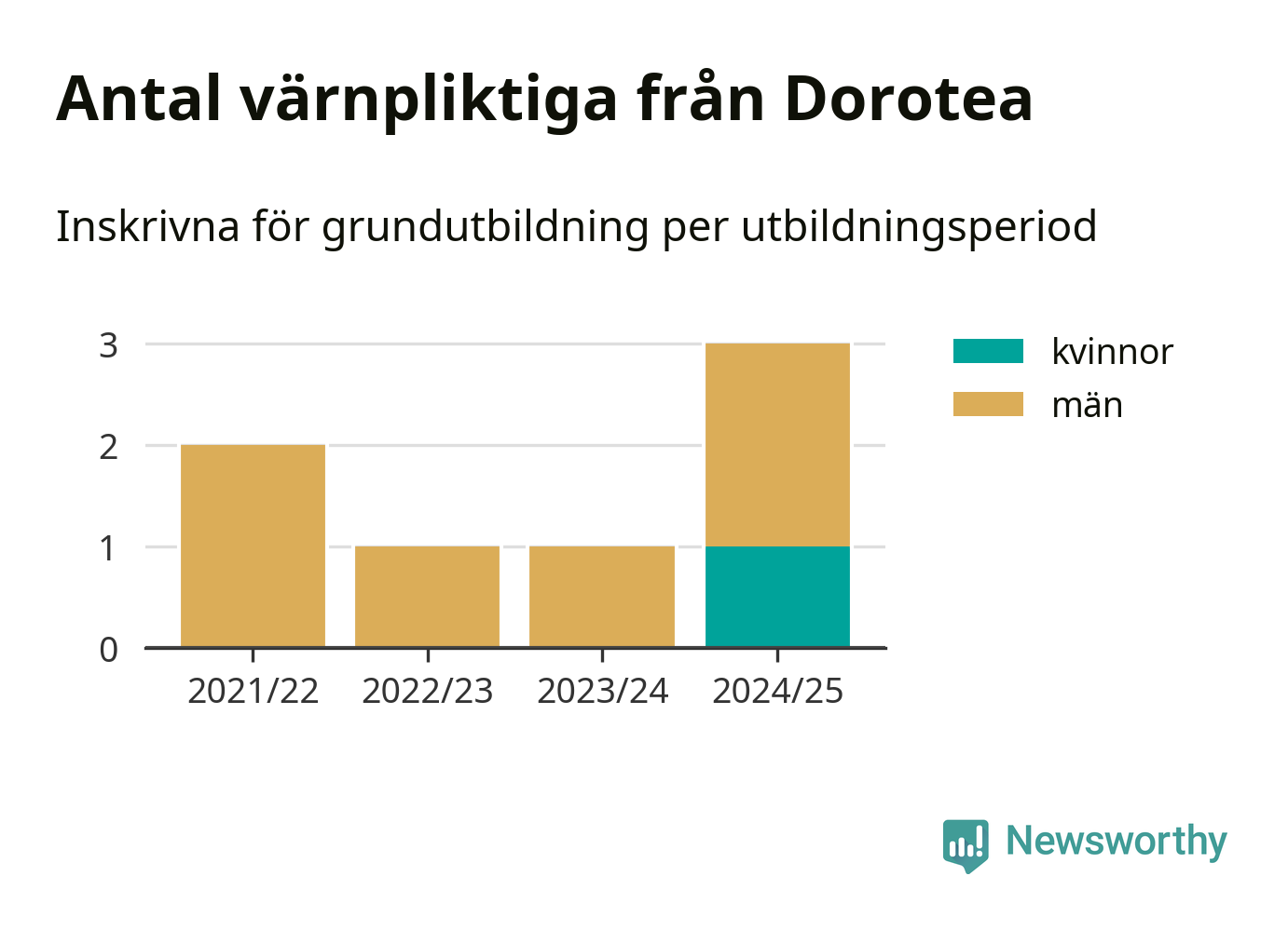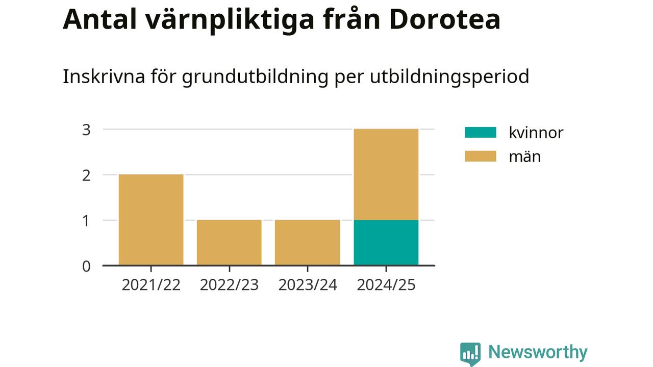 Tre värnpliktiga från Dorotea har skrivits in för att göra lumpen under innevarande utbildningsperiod, som sträcker sig från juni 2024 till och med första halvåret 2025. Det är den högsta siffran åtminstone sedan 2021/22, vilket är så långt bakåt vi har siffror på kommunnivå. Den allmänna värnplikten återinfördes 2018.