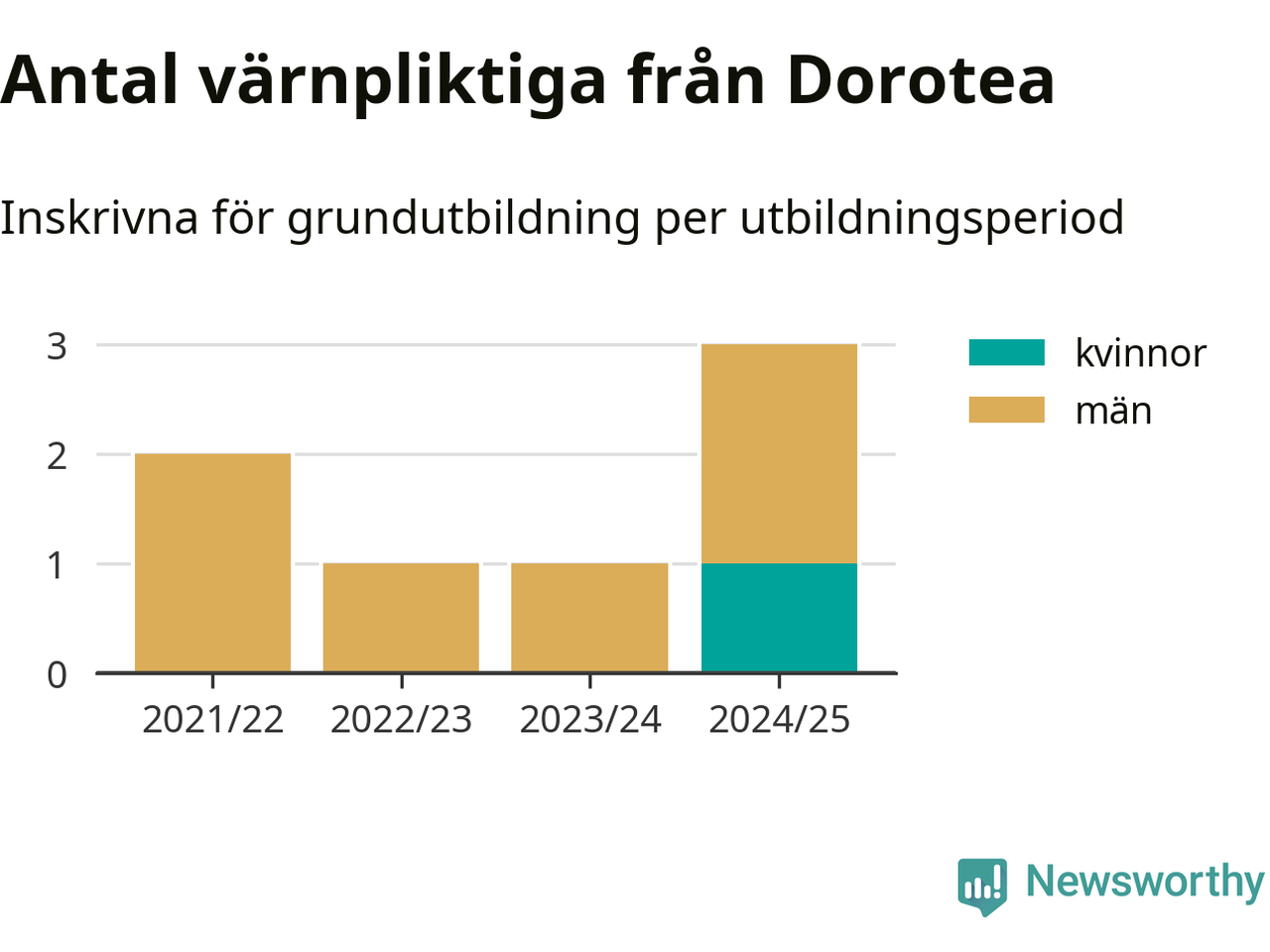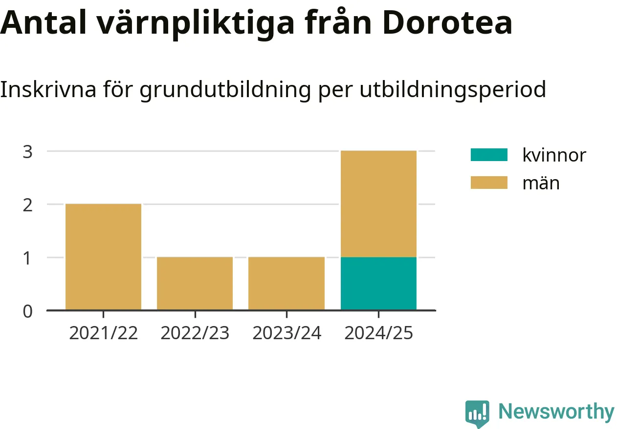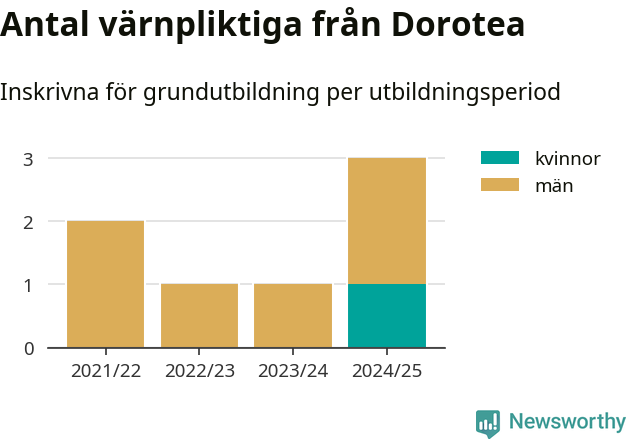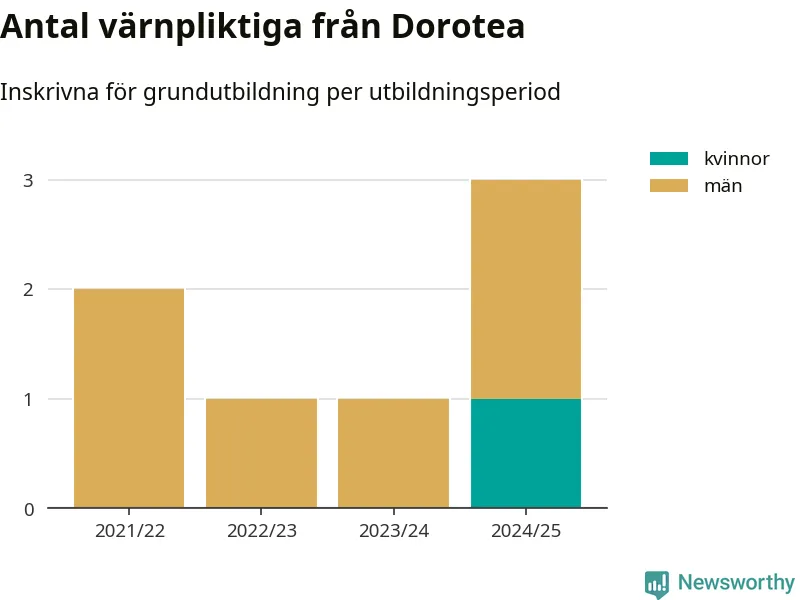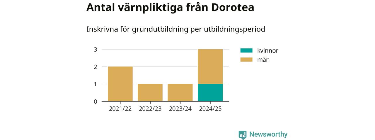 Tre värnpliktiga från Dorotea har skrivits in för att göra lumpen under innevarande utbildningsperiod, som sträcker sig från juni 2024 till och med första halvåret 2025. Det är den högsta siffran åtminstone sedan 2021/22, vilket är så långt bakåt vi har siffror på kommunnivå. Den allmänna värnplikten återinfördes 2018.