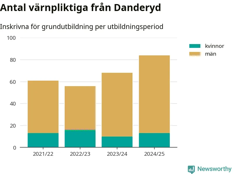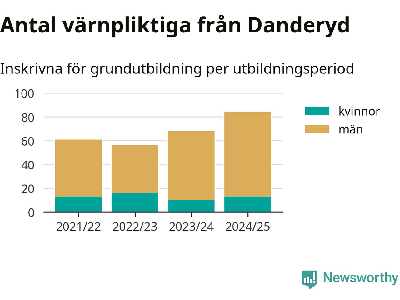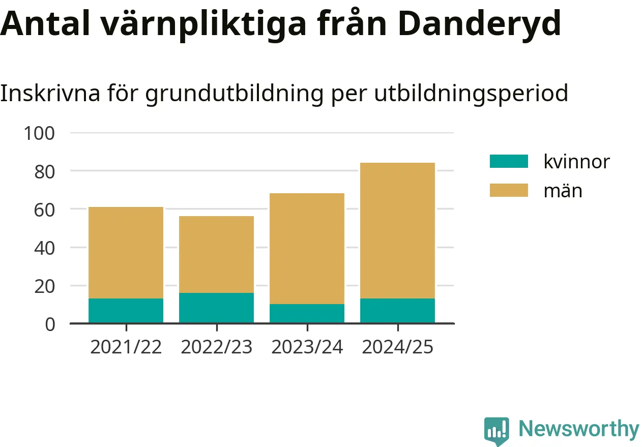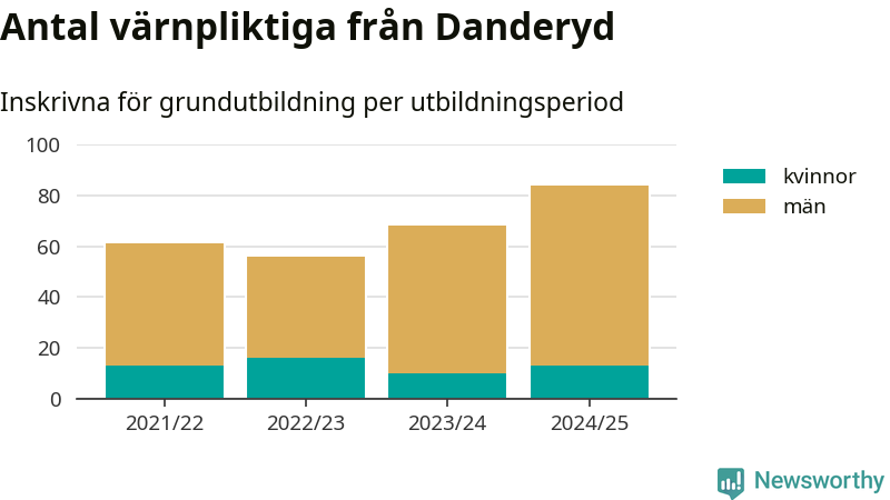Antalet värnpliktiga från Danderyd ökar stadigt, visar siffror från Plikt- och prövningsverket. Under det här värnpliktsåret, med utbildningsstart från juni 2024 till början av 2025, är 84 värnpliktiga inskrivna för att påbörja sin grundutbildning. Det är den högsta siffran åtminstone sedan 2021/22, vilket är så långt bakåt vi har siffror på kommunnivå. Den allmänna värnplikten återinfördes 2018.