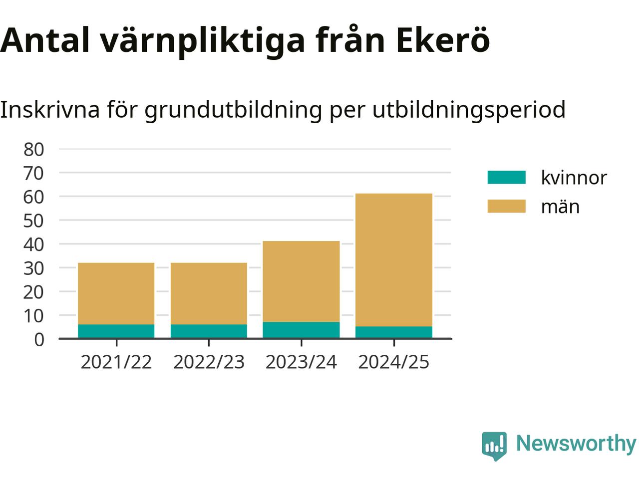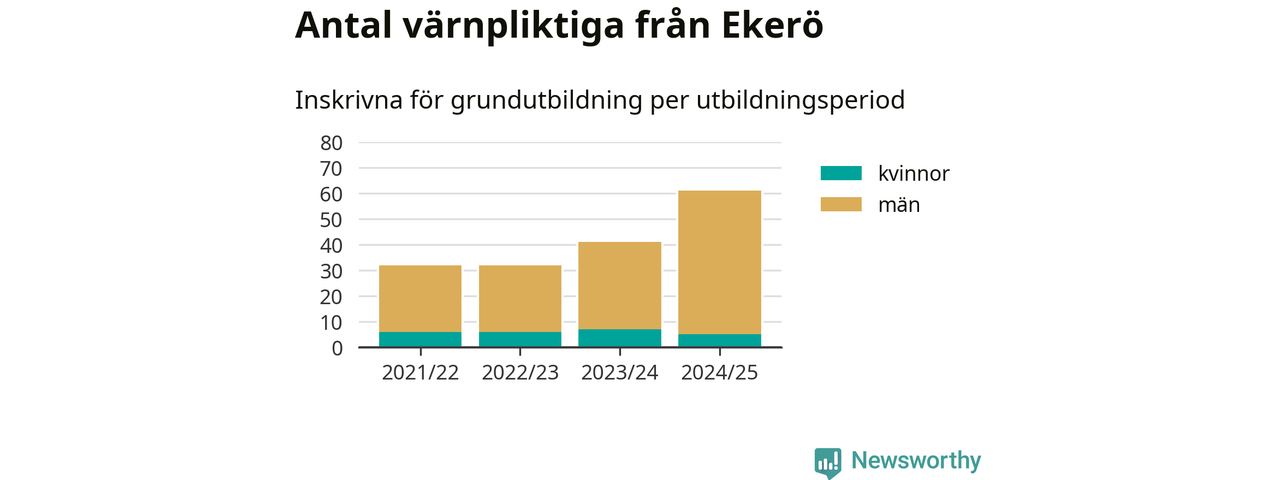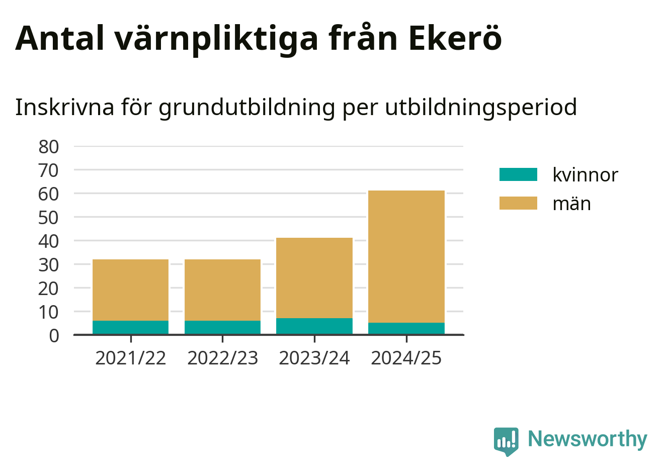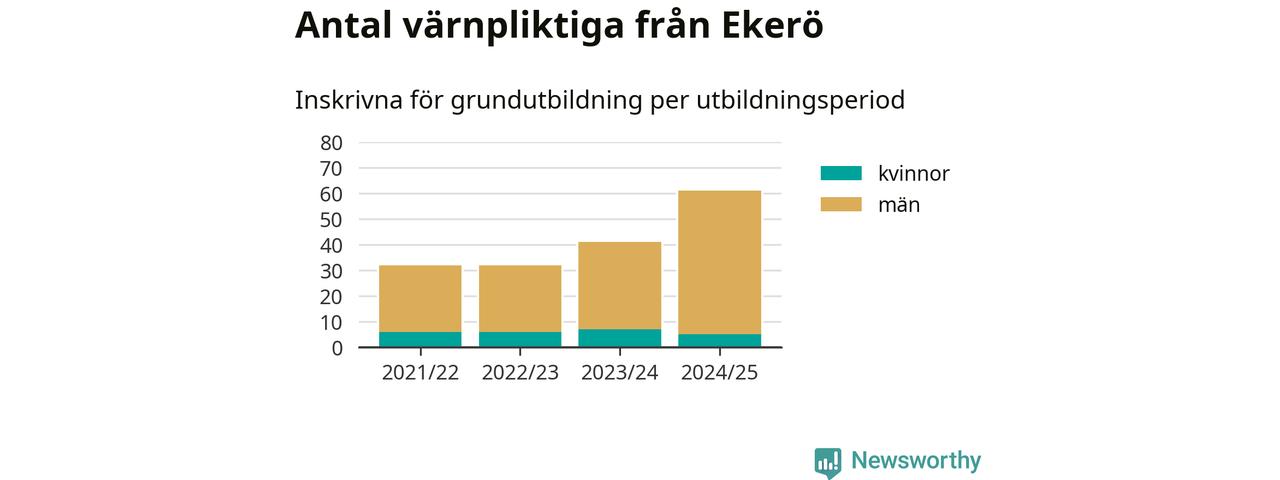 Antalet värnpliktiga från Ekerö ökar stadigt, visar siffror från Plikt- och prövningsverket. Under det här värnpliktsåret, med utbildningsstart från juni 2024 till början av 2025, är 61 värnpliktiga inskrivna för att påbörja sin grundutbildning. Det är den högsta siffran åtminstone sedan 2021/22, vilket är så långt bakåt vi har siffror på kommunnivå. Den allmänna värnplikten återinfördes 2018.