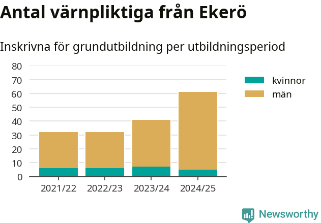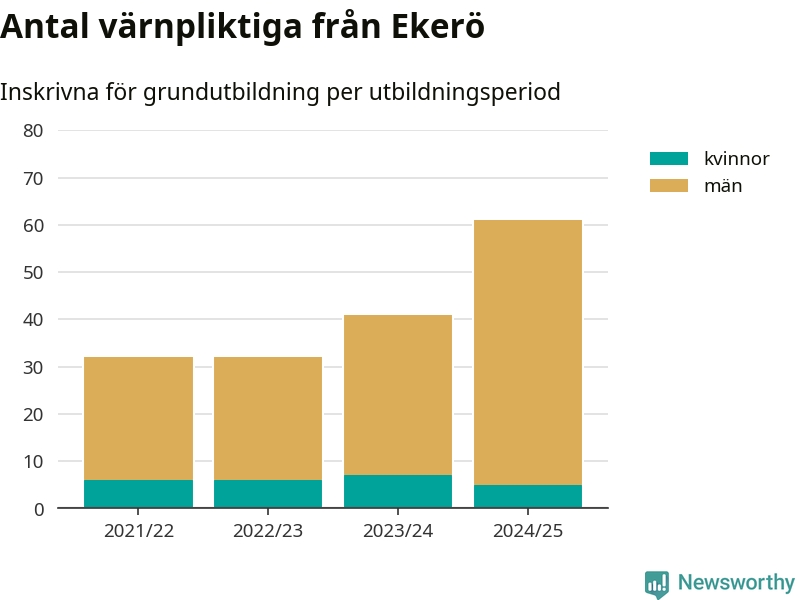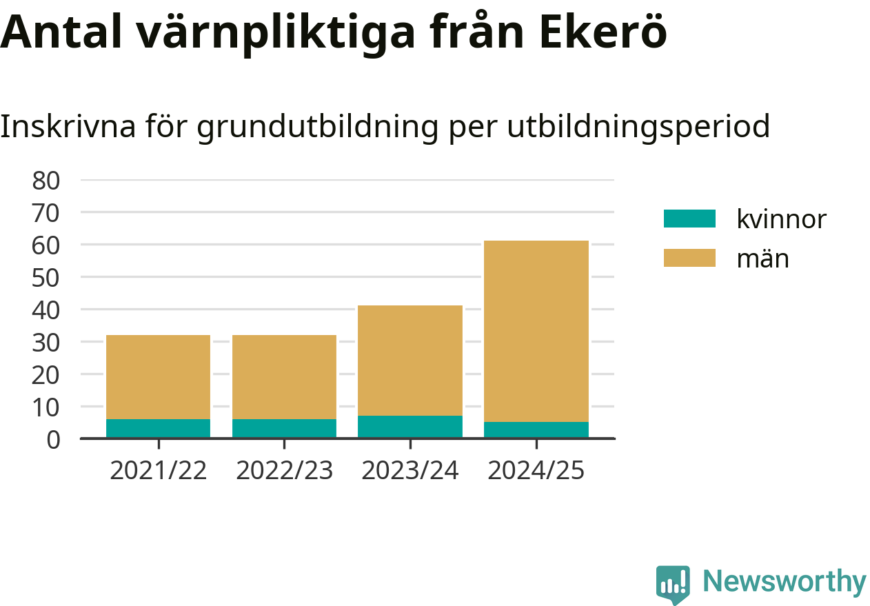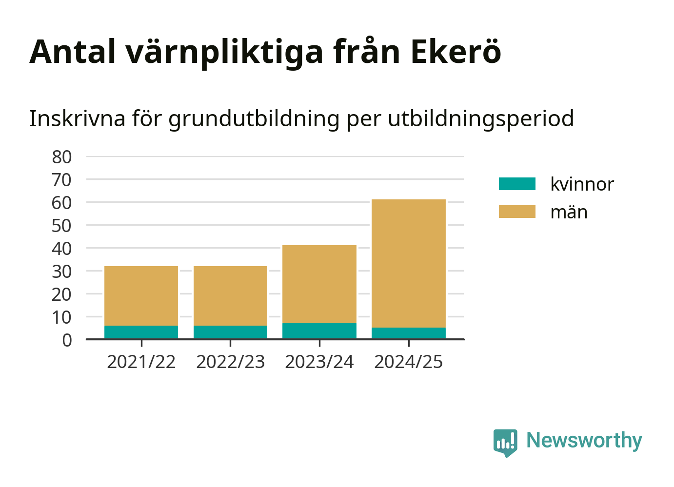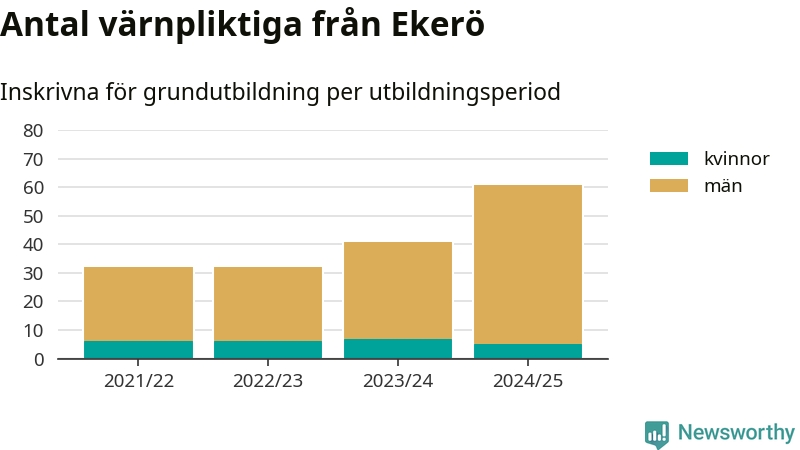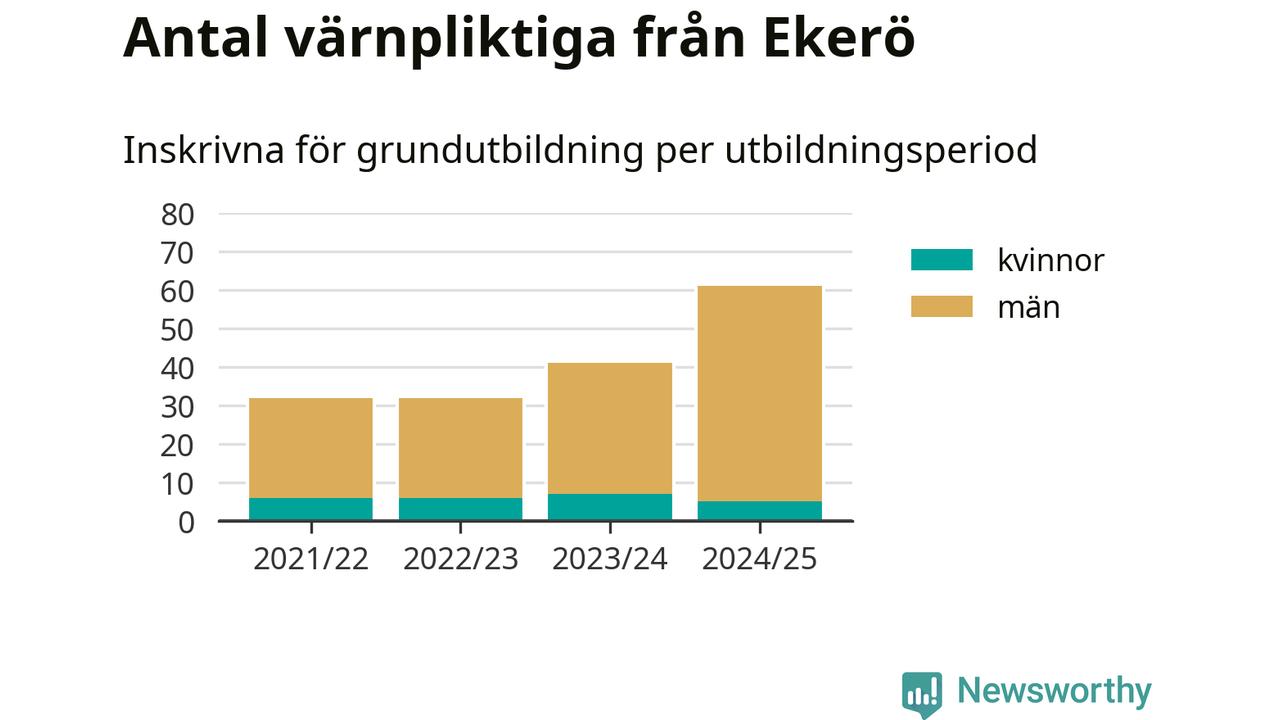 Antalet värnpliktiga från Ekerö ökar stadigt, visar siffror från Plikt- och prövningsverket. Under det här värnpliktsåret, med utbildningsstart från juni 2024 till början av 2025, är 61 värnpliktiga inskrivna för att påbörja sin grundutbildning. Det är den högsta siffran åtminstone sedan 2021/22, vilket är så långt bakåt vi har siffror på kommunnivå. Den allmänna värnplikten återinfördes 2018.
