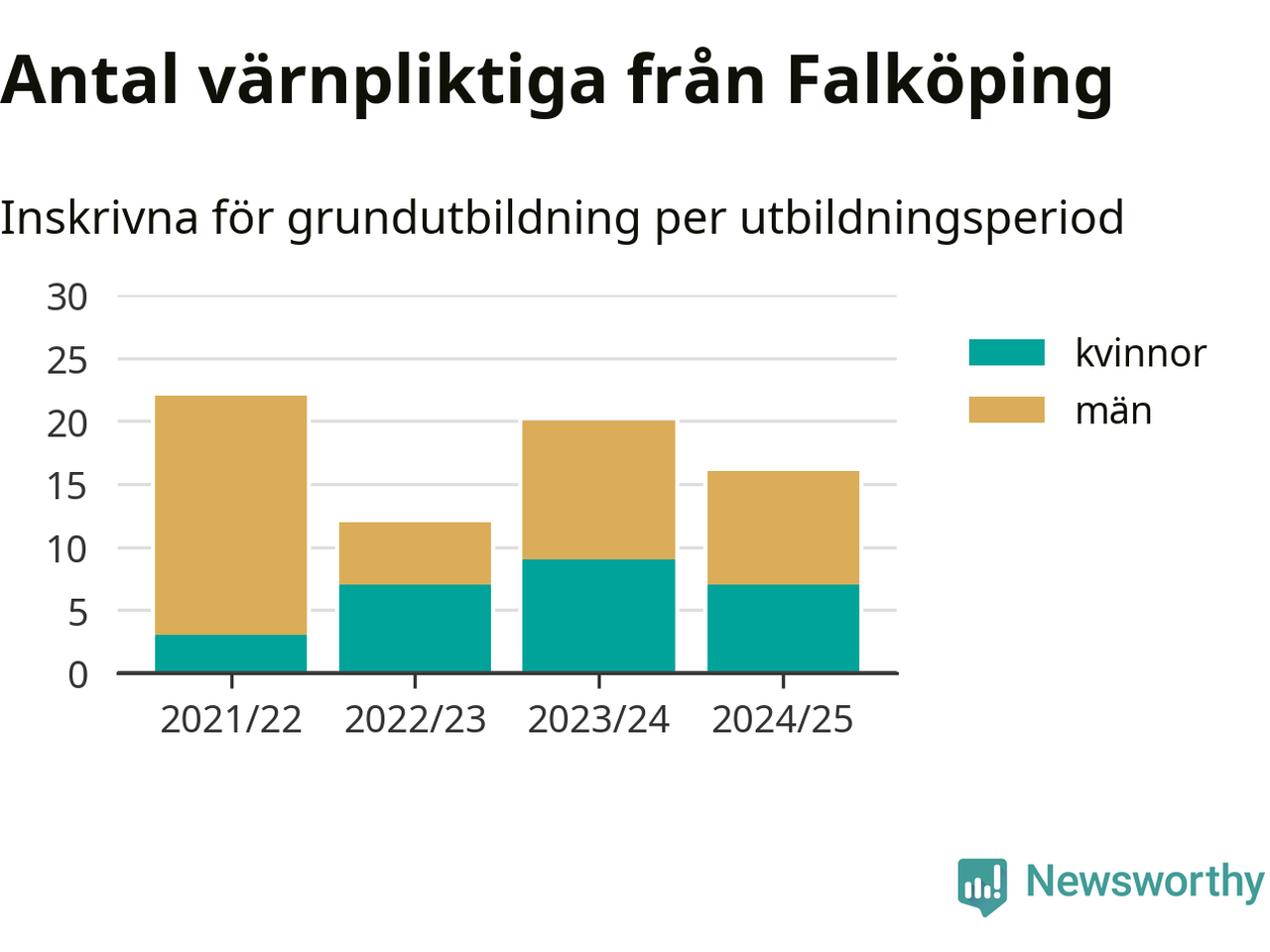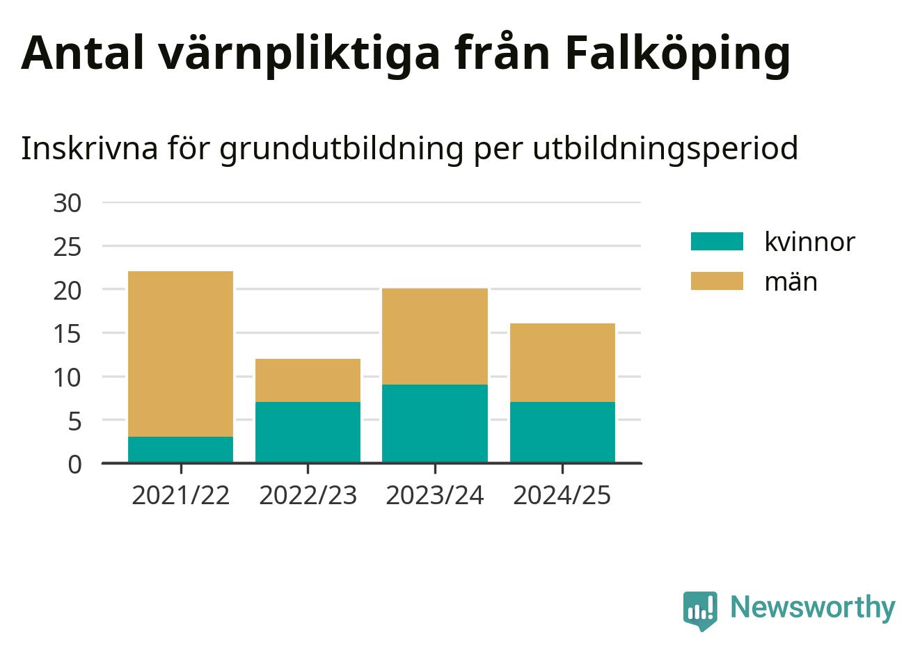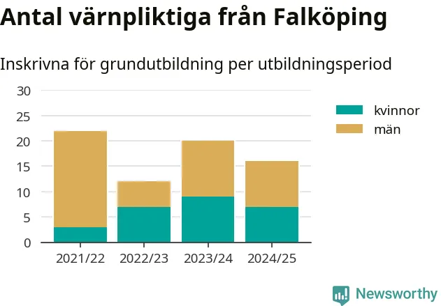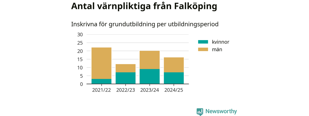 16 värnpliktiga från Falköping har skrivits in för att göra lumpen under innevarande utbildningsperiod, som sträcker sig från juni 2024 till och med första halvåret 2025. Det är två färre än året innan. Den allmänna värnplikten återinfördes 2018 och vi har siffror nedbrutna på kommunnivå sedan 2021/22. Som mest har 22 personer från Falköping skrivits in, utbildningsperioden 2021/22.