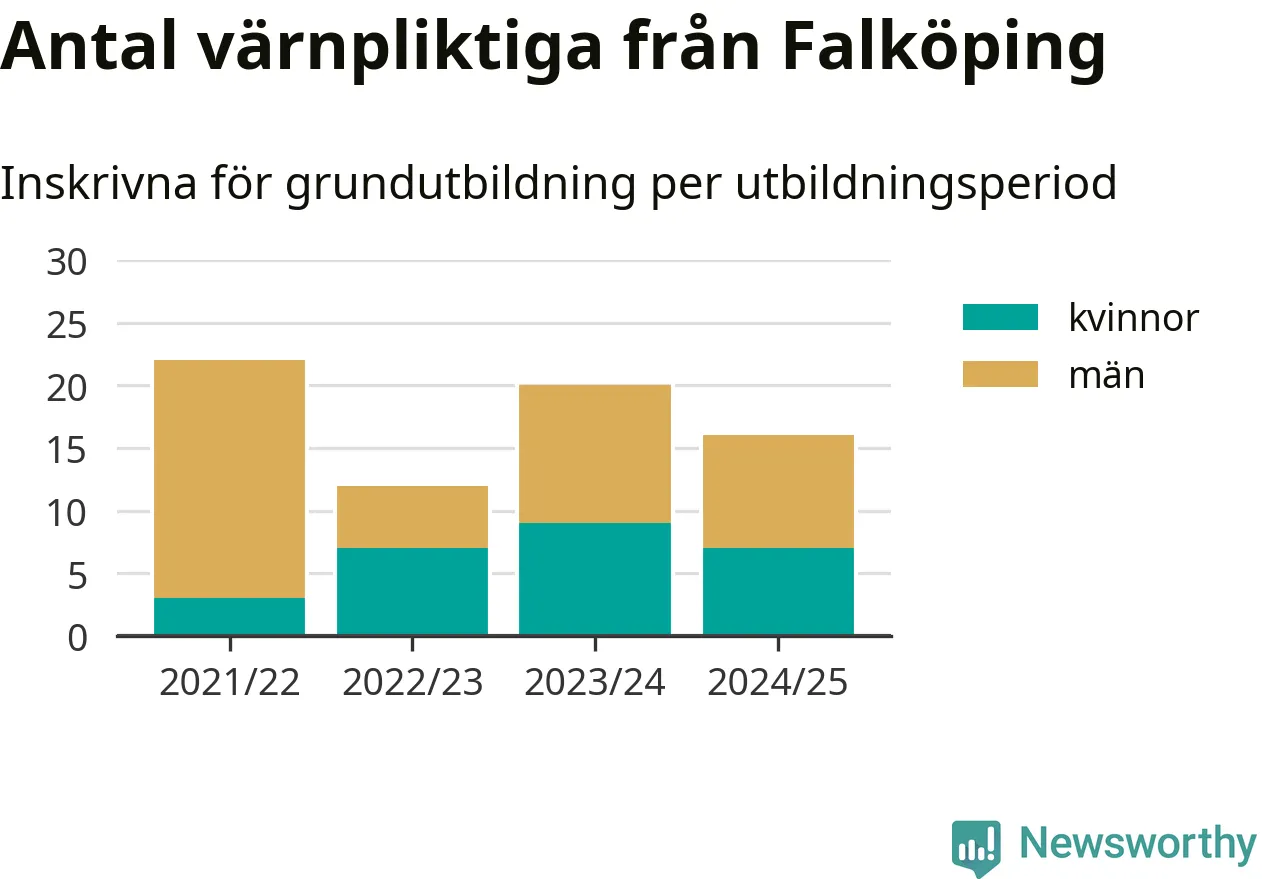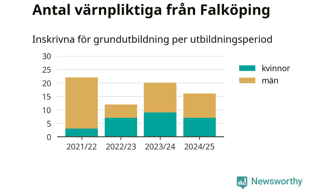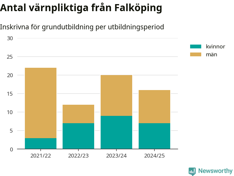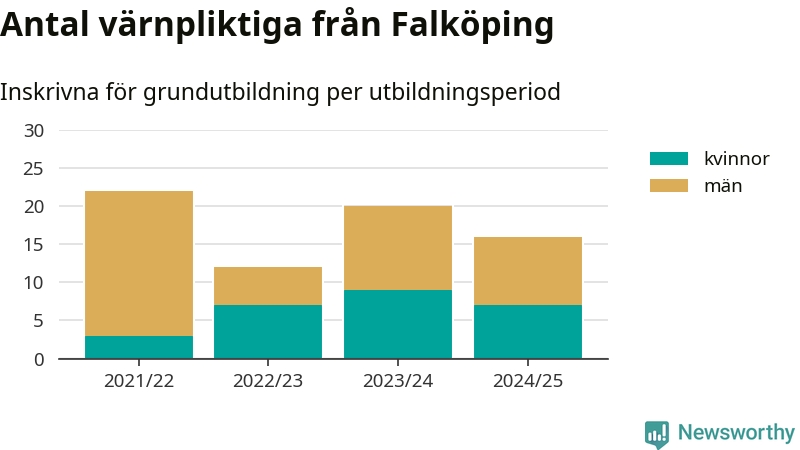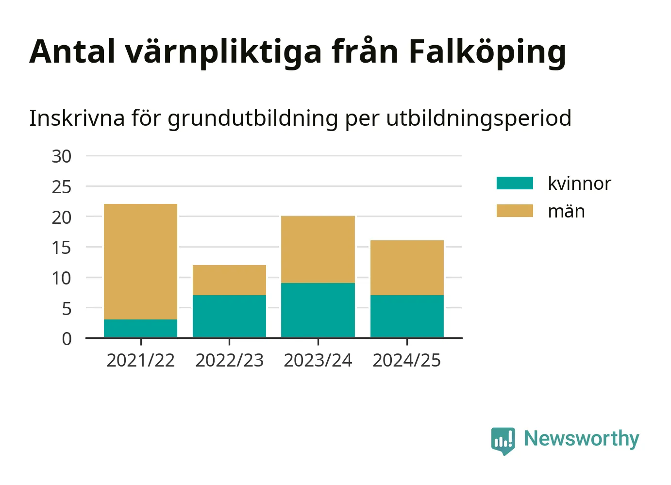16 värnpliktiga från Falköping har skrivits in för att göra lumpen under innevarande utbildningsperiod, som sträcker sig från juni 2024 till och med första halvåret 2025. Det är två färre än året innan. Den allmänna värnplikten återinfördes 2018 och vi har siffror nedbrutna på kommunnivå sedan 2021/22. Som mest har 22 personer från Falköping skrivits in, utbildningsperioden 2021/22.
