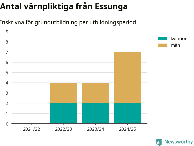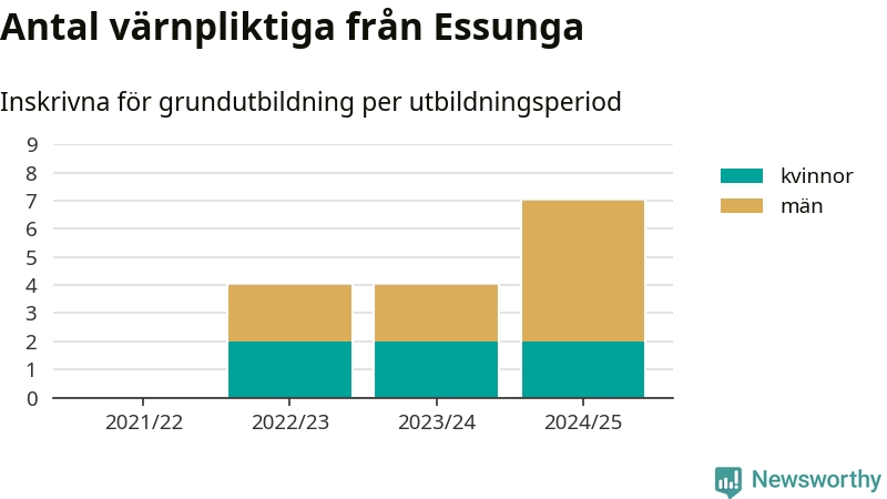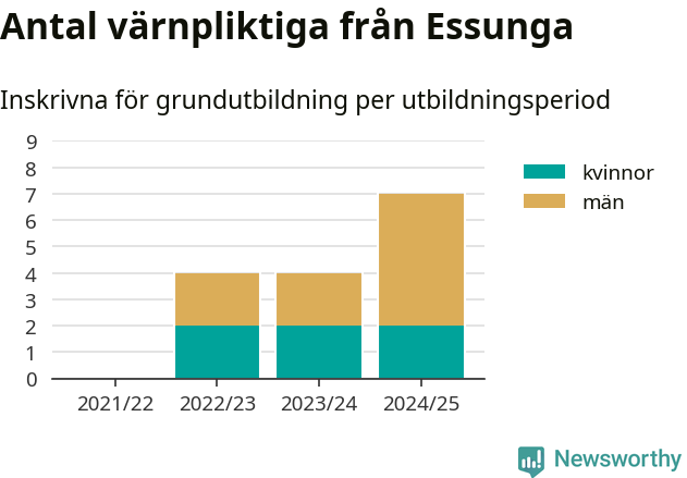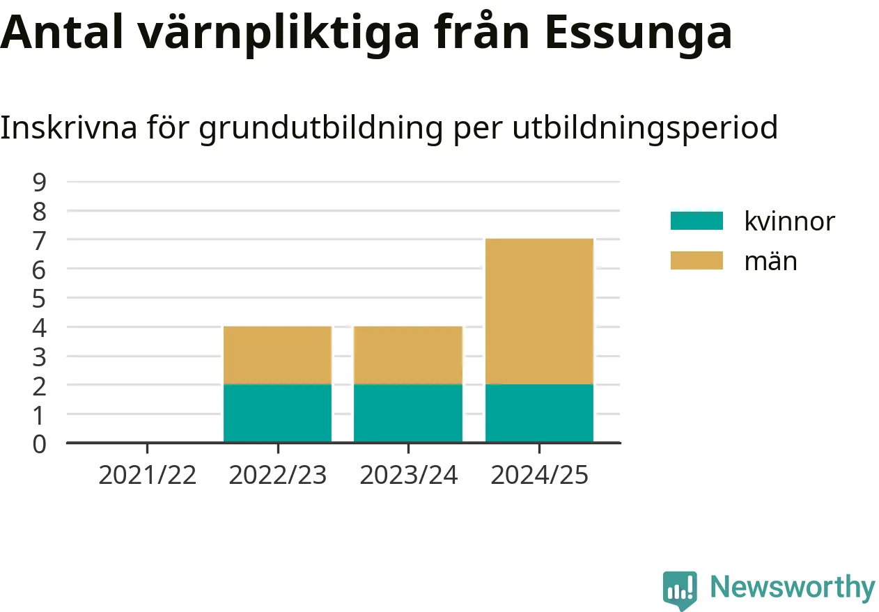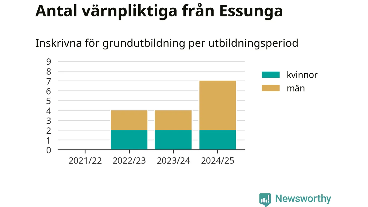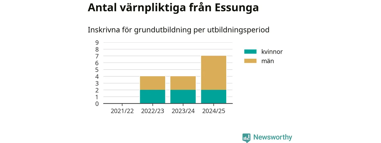 Antalet värnpliktiga från Essunga ökar stadigt, visar siffror från Plikt- och prövningsverket. Under det här värnpliktsåret, med utbildningsstart från juni 2024 till början av 2025, är sju värnpliktiga inskrivna för att påbörja sin grundutbildning. Det är den högsta siffran åtminstone sedan 2021/22, vilket är så långt bakåt vi har siffror på kommunnivå. Den allmänna värnplikten återinfördes 2018.