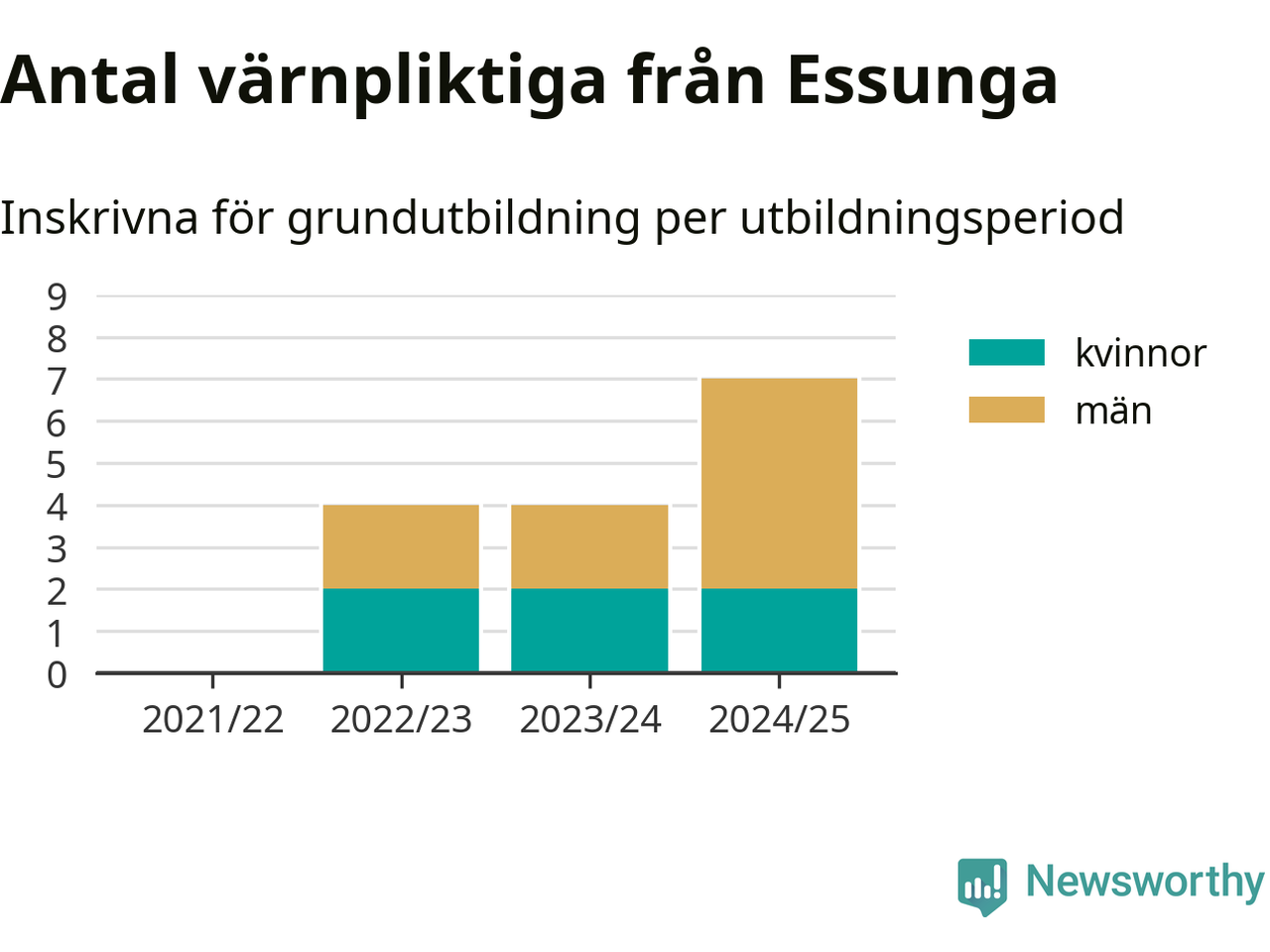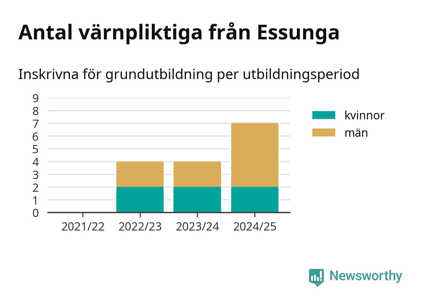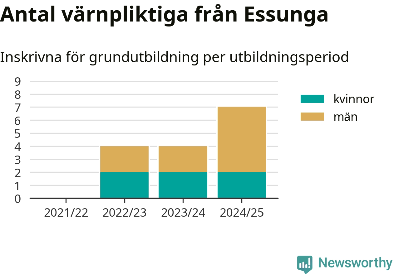 Antalet värnpliktiga från Essunga ökar stadigt, visar siffror från Plikt- och prövningsverket. Under det här värnpliktsåret, med utbildningsstart från juni 2024 till början av 2025, är sju värnpliktiga inskrivna för att påbörja sin grundutbildning. Det är den högsta siffran åtminstone sedan 2021/22, vilket är så långt bakåt vi har siffror på kommunnivå. Den allmänna värnplikten återinfördes 2018.