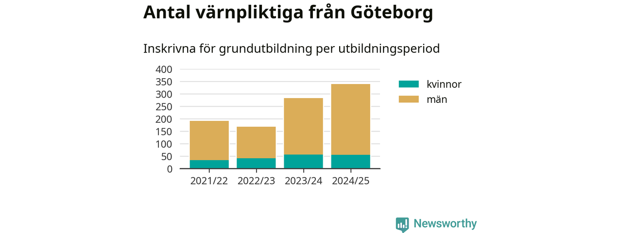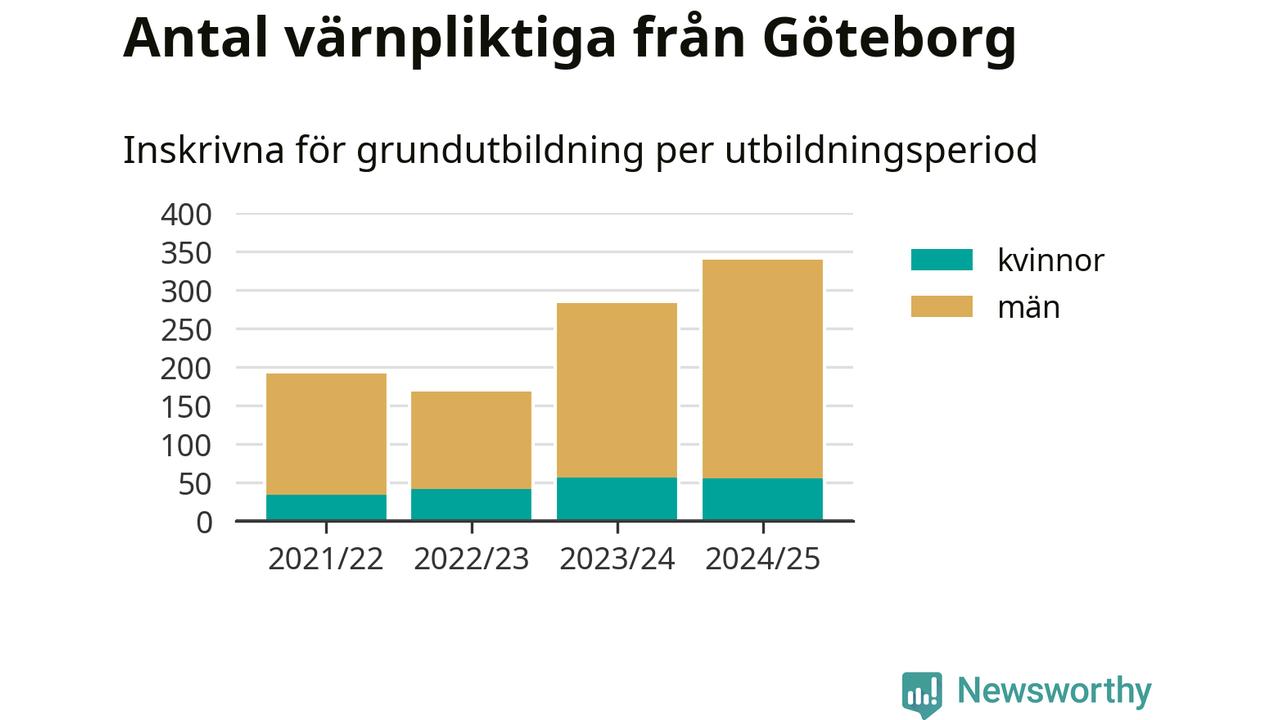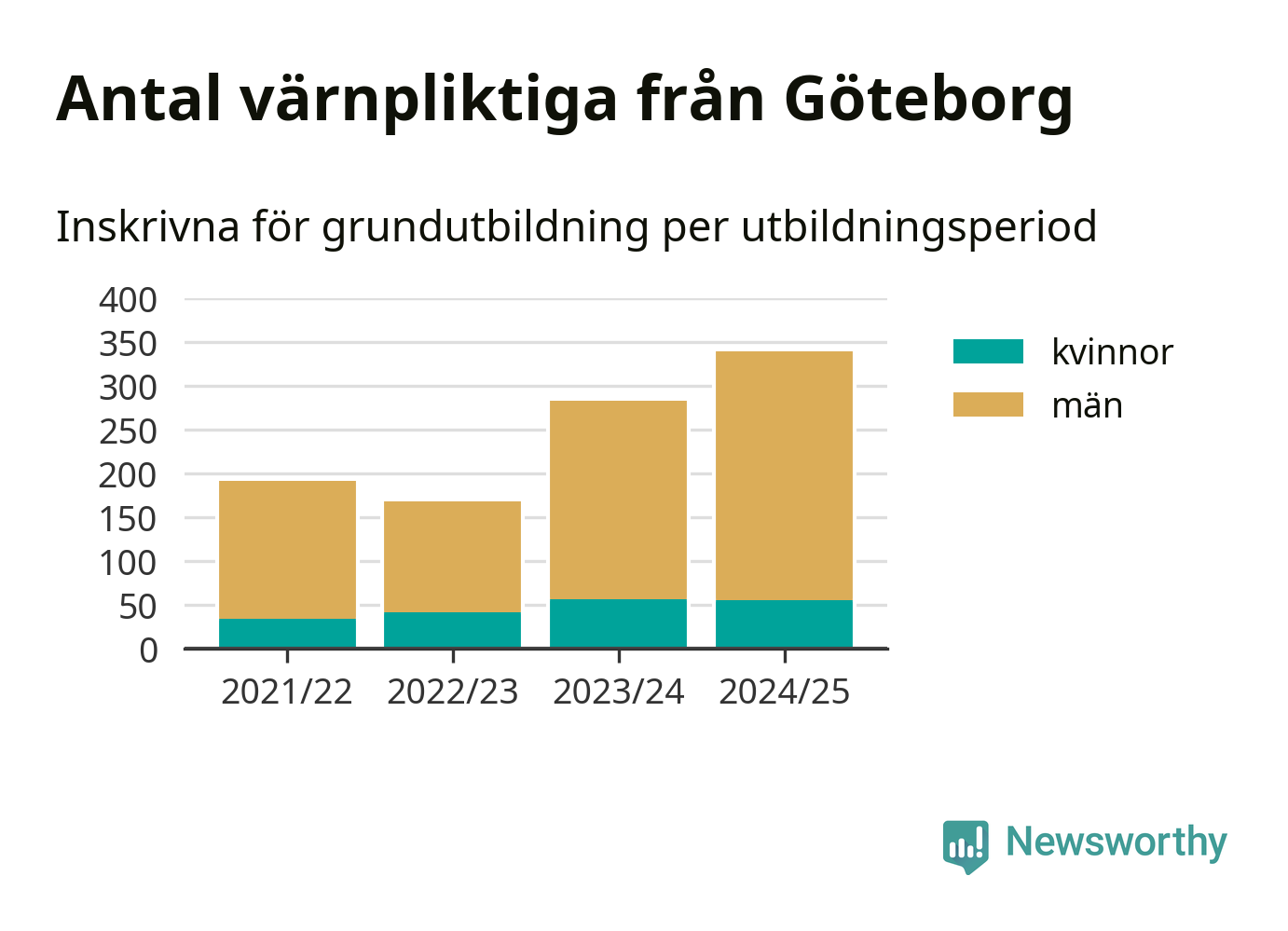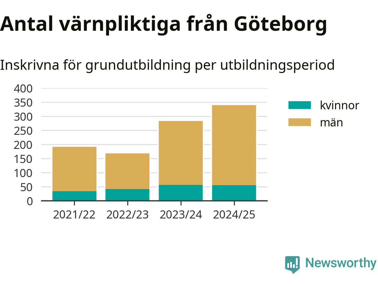Antalet värnpliktiga från Göteborg ökar stadigt, visar siffror från Plikt- och prövningsverket. Under det här värnpliktsåret, med utbildningsstart från juni 2024 till början av 2025, är 339 värnpliktiga inskrivna för att påbörja sin grundutbildning. Det är den högsta siffran åtminstone sedan 2021/22, vilket är så långt bakåt vi har siffror på kommunnivå. Den allmänna värnplikten återinfördes 2018.