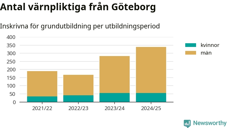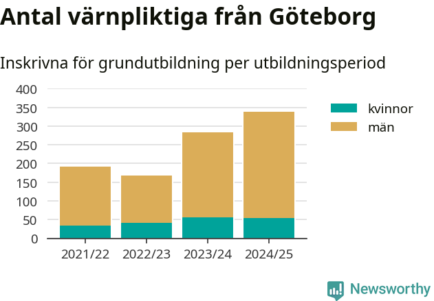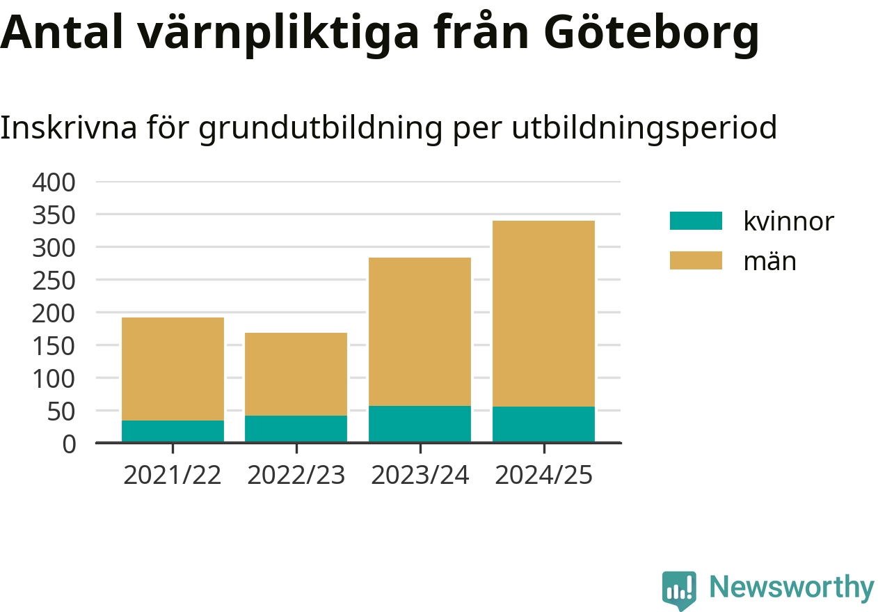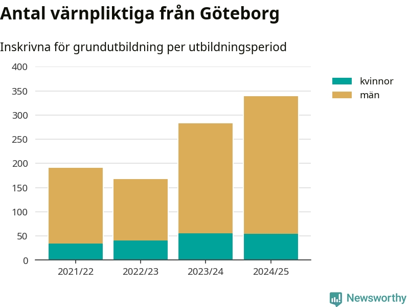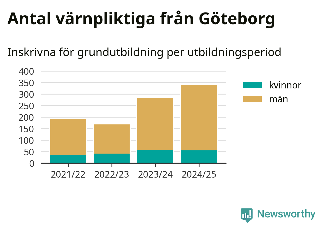 Antalet värnpliktiga från Göteborg ökar stadigt, visar siffror från Plikt- och prövningsverket. Under det här värnpliktsåret, med utbildningsstart från juni 2024 till början av 2025, är 339 värnpliktiga inskrivna för att påbörja sin grundutbildning. Det är den högsta siffran åtminstone sedan 2021/22, vilket är så långt bakåt vi har siffror på kommunnivå. Den allmänna värnplikten återinfördes 2018.