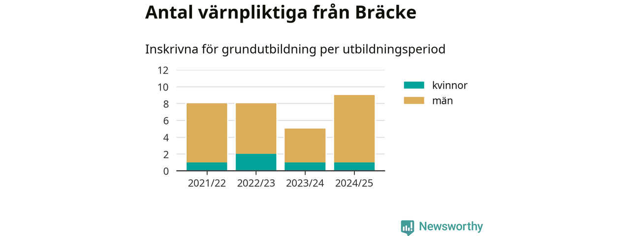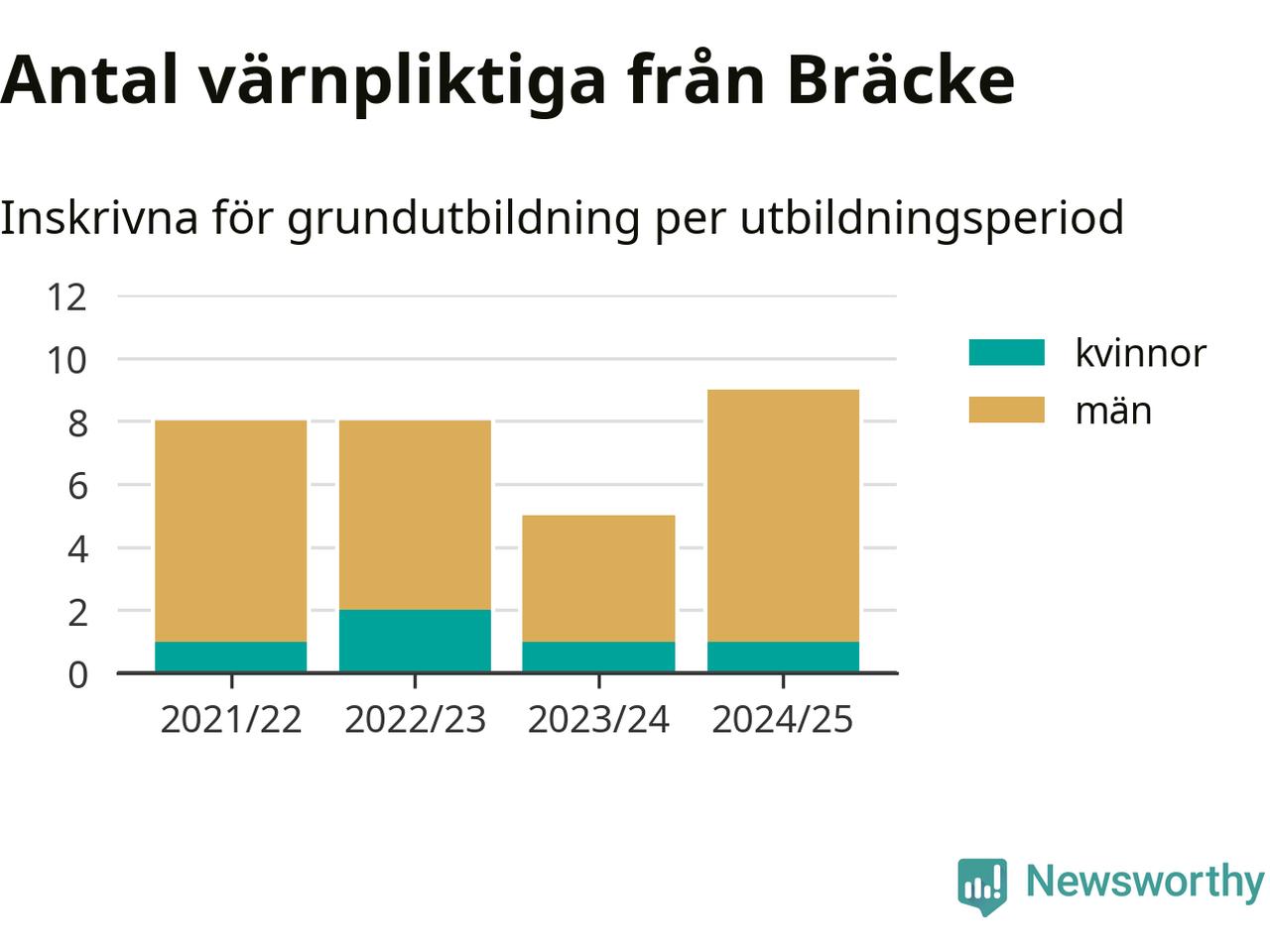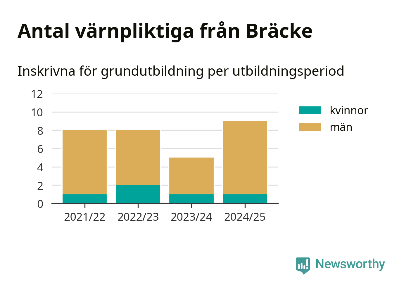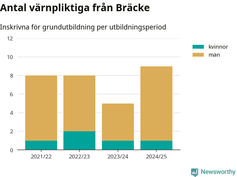 Nio värnpliktiga från Bräcke har skrivits in för att göra lumpen under innevarande utbildningsperiod, som sträcker sig från juni 2024 till och med första halvåret 2025. Det är den högsta siffran åtminstone sedan 2021/22, vilket är så långt bakåt vi har siffror på kommunnivå. Den allmänna värnplikten återinfördes 2018.