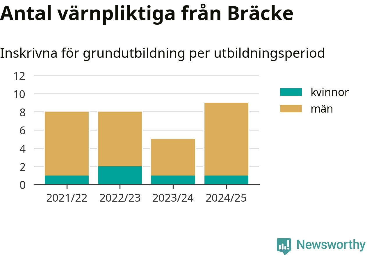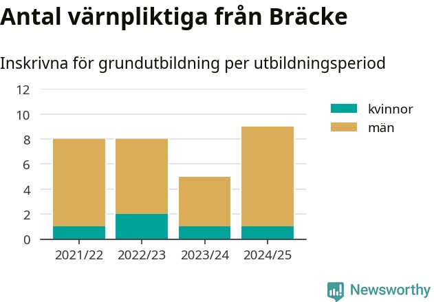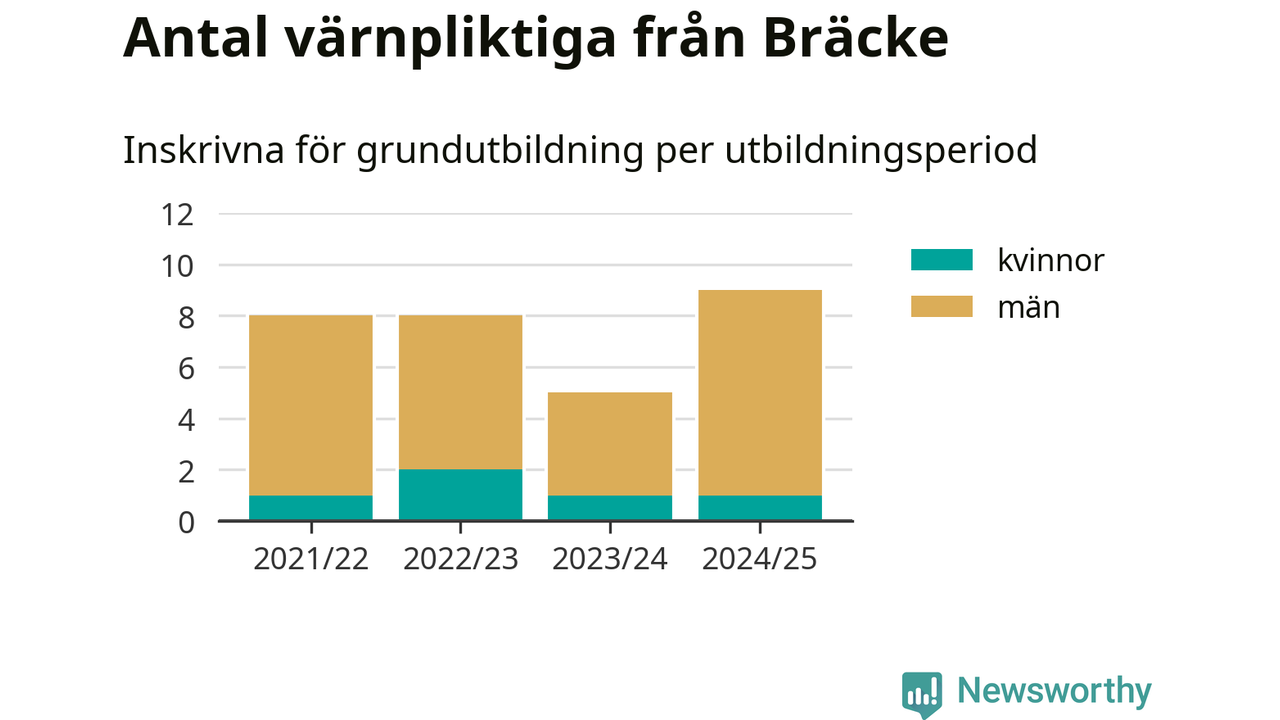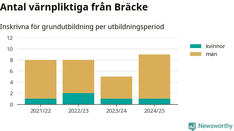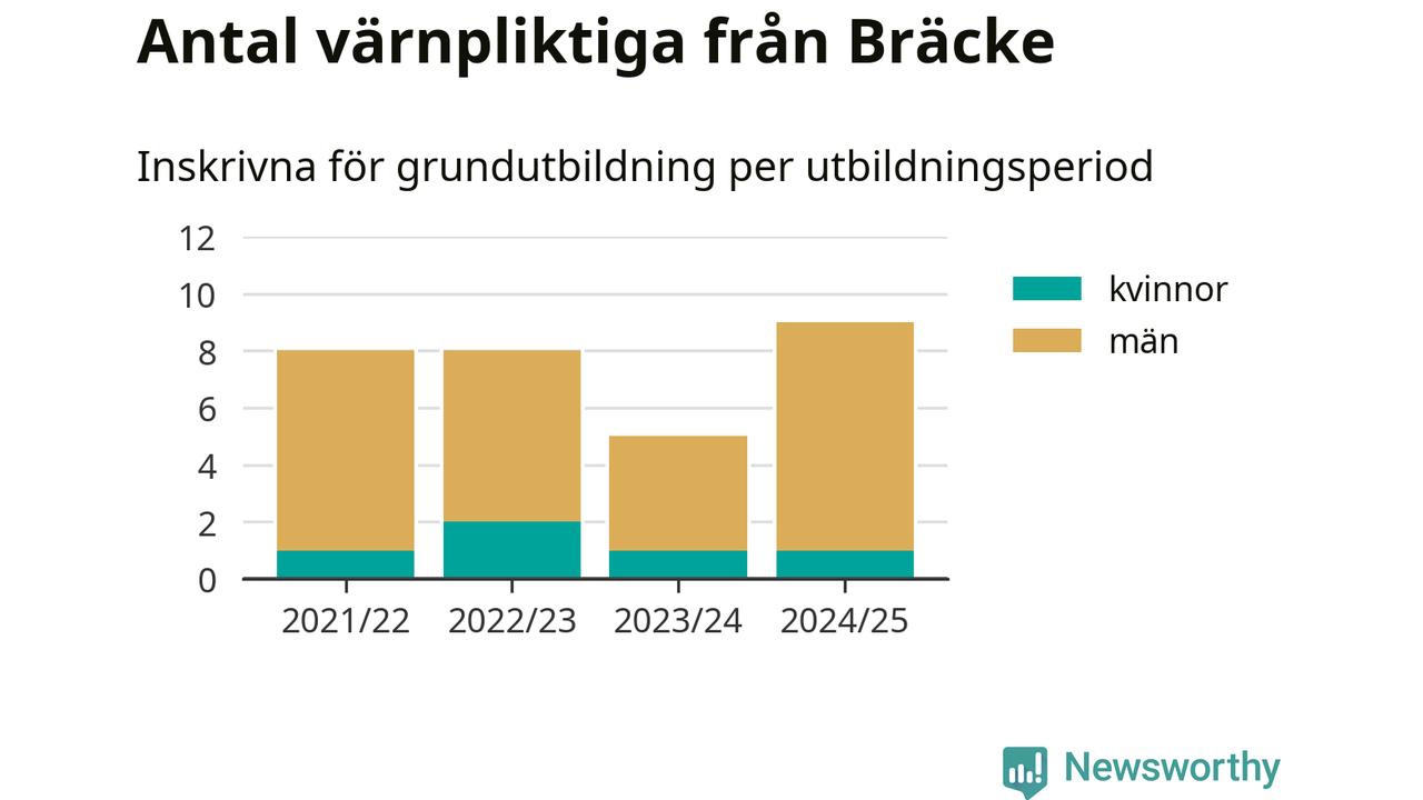 Nio värnpliktiga från Bräcke har skrivits in för att göra lumpen under innevarande utbildningsperiod, som sträcker sig från juni 2024 till och med första halvåret 2025. Det är den högsta siffran åtminstone sedan 2021/22, vilket är så långt bakåt vi har siffror på kommunnivå. Den allmänna värnplikten återinfördes 2018.