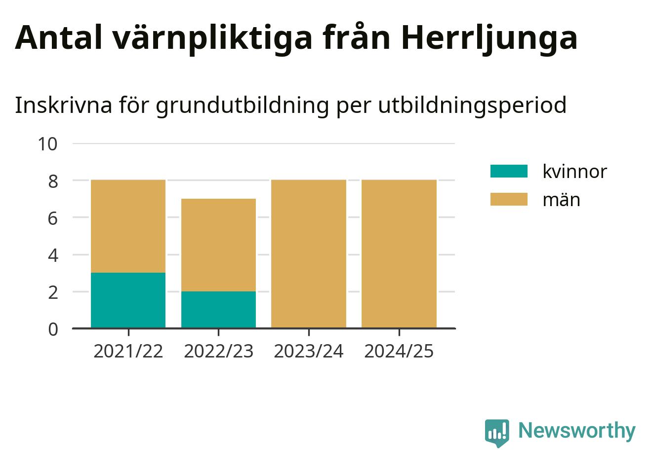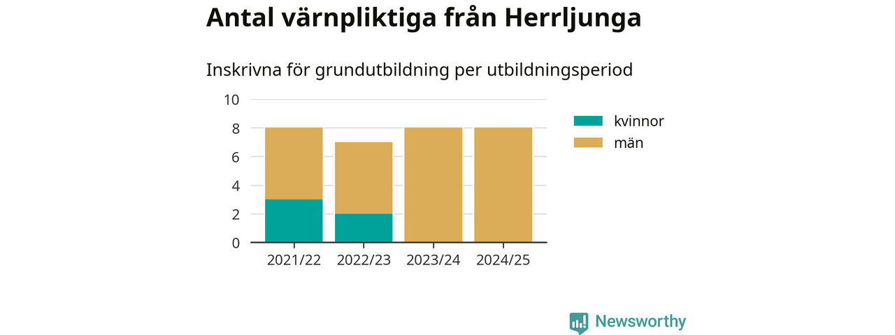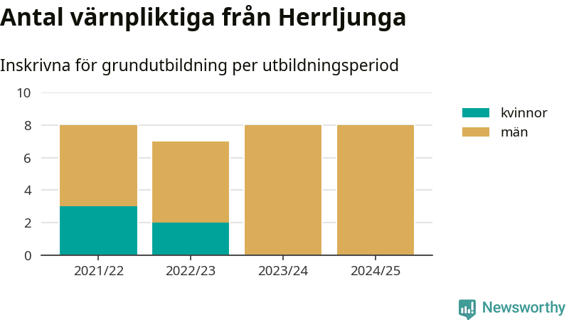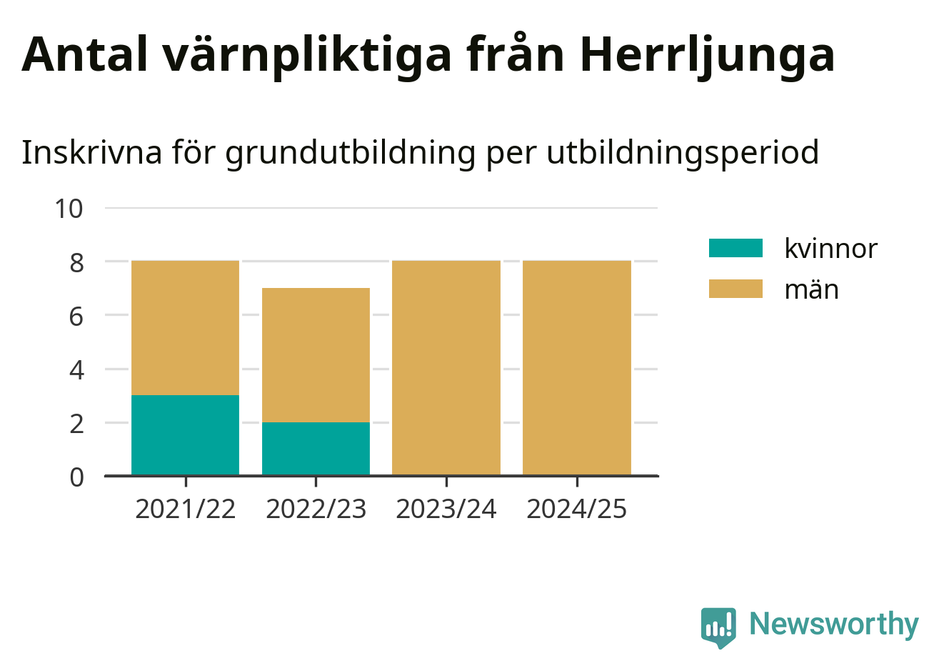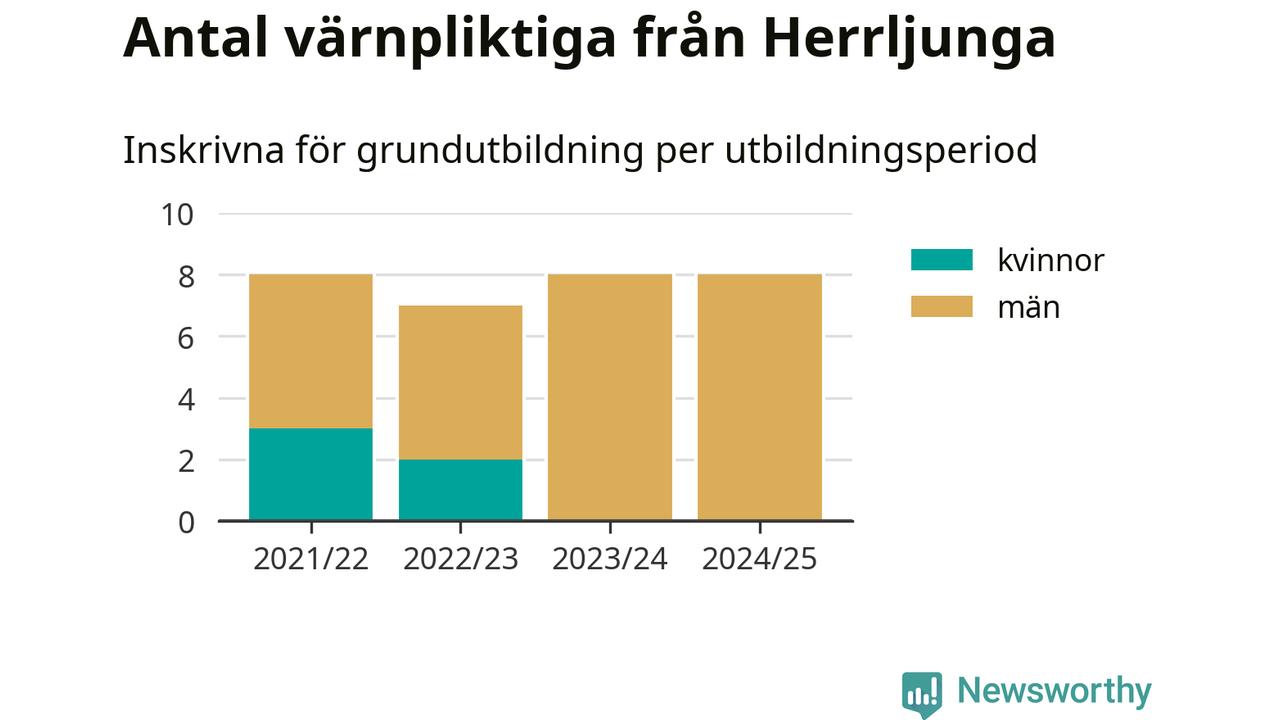 Antalet värnpliktiga från Herrljunga ökar stadigt, visar siffror från Plikt- och prövningsverket. Under det här värnpliktsåret, med utbildningsstart från juni 2024 till början av 2025, är åtta värnpliktiga inskrivna för att påbörja sin grundutbildning. Det är lika många som 2021/22 och 2023/24. Den allmänna värnplikten återinfördes 2018.