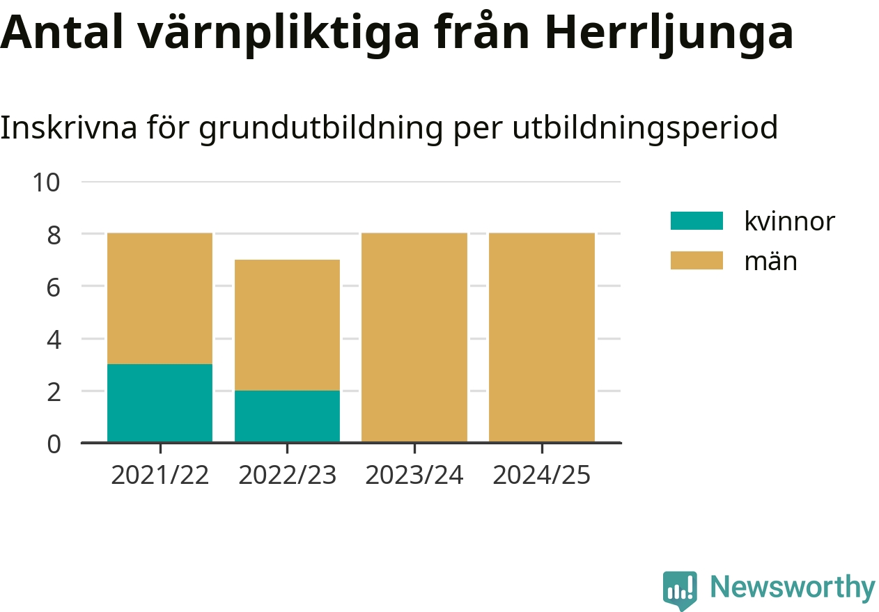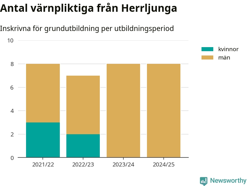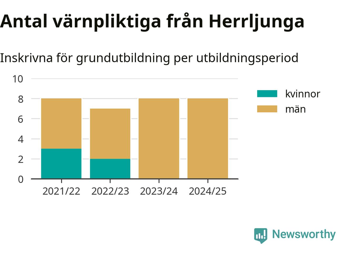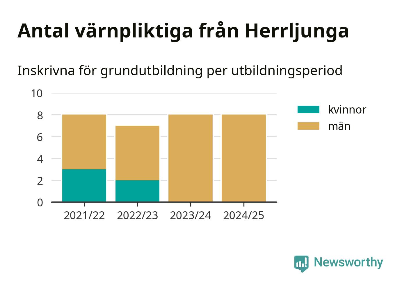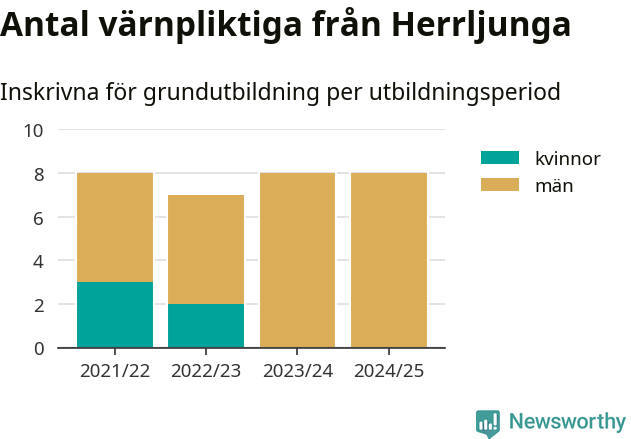 Antalet värnpliktiga från Herrljunga ökar stadigt, visar siffror från Plikt- och prövningsverket. Under det här värnpliktsåret, med utbildningsstart från juni 2024 till början av 2025, är åtta värnpliktiga inskrivna för att påbörja sin grundutbildning. Det är lika många som 2021/22 och 2023/24. Den allmänna värnplikten återinfördes 2018.