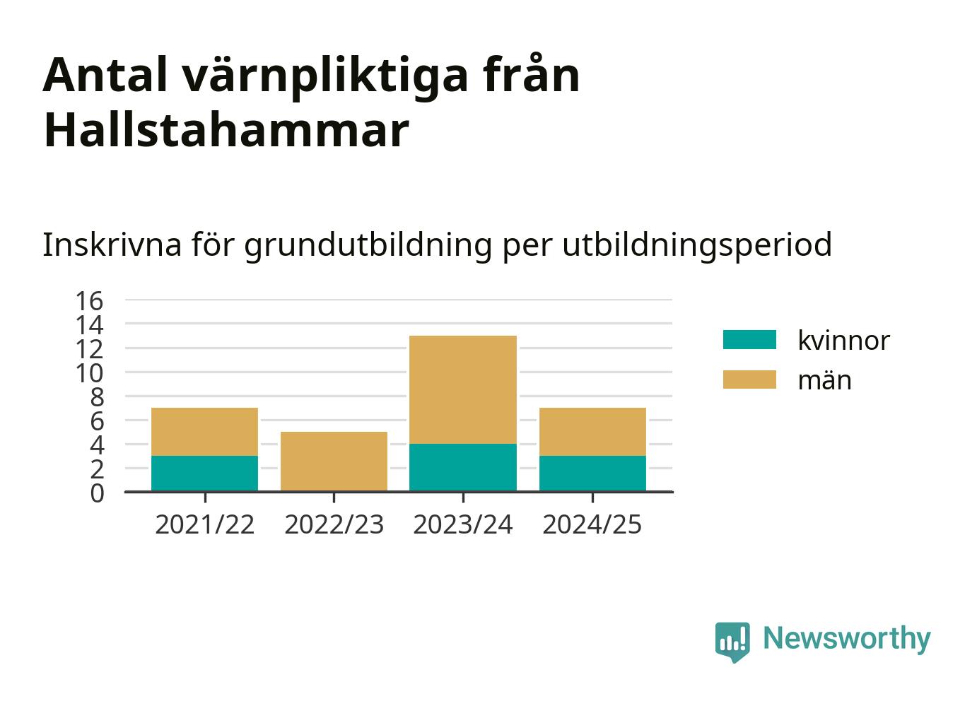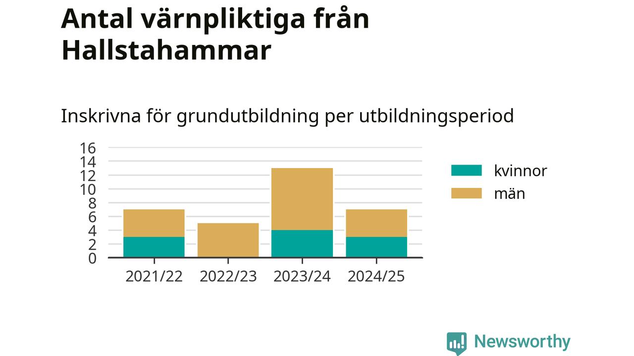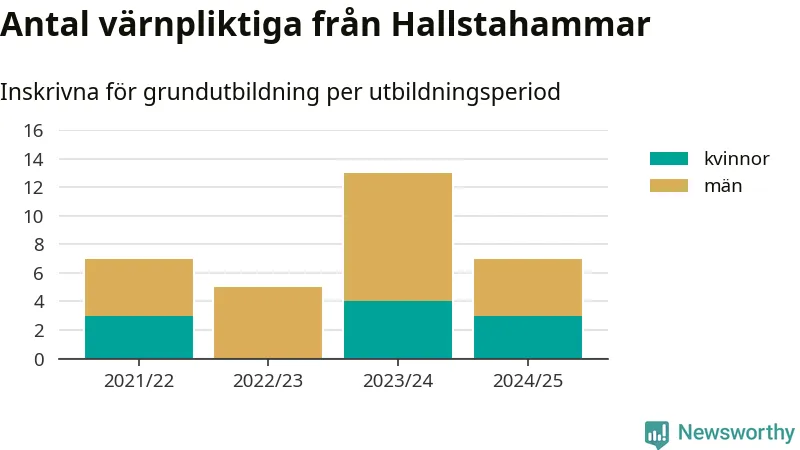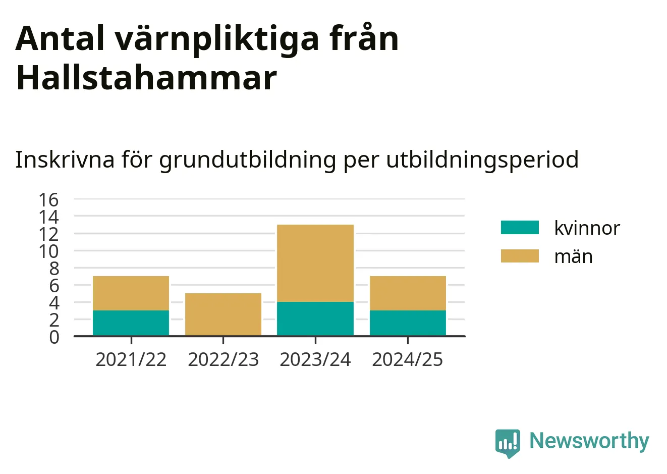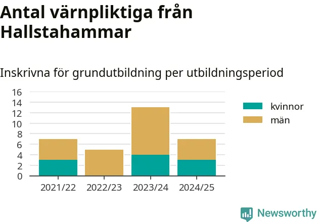 Sju värnpliktiga från Hallstahammar har skrivits in för att göra lumpen under innevarande utbildningsperiod, som sträcker sig från juni 2024 till och med första halvåret 2025. Det är ett färre än året innan. Den allmänna värnplikten återinfördes 2018 och vi har siffror nedbrutna på kommunnivå sedan 2021/22. Som mest har 13 personer från Hallstahammar skrivits in, utbildningsperioden 2023/24.