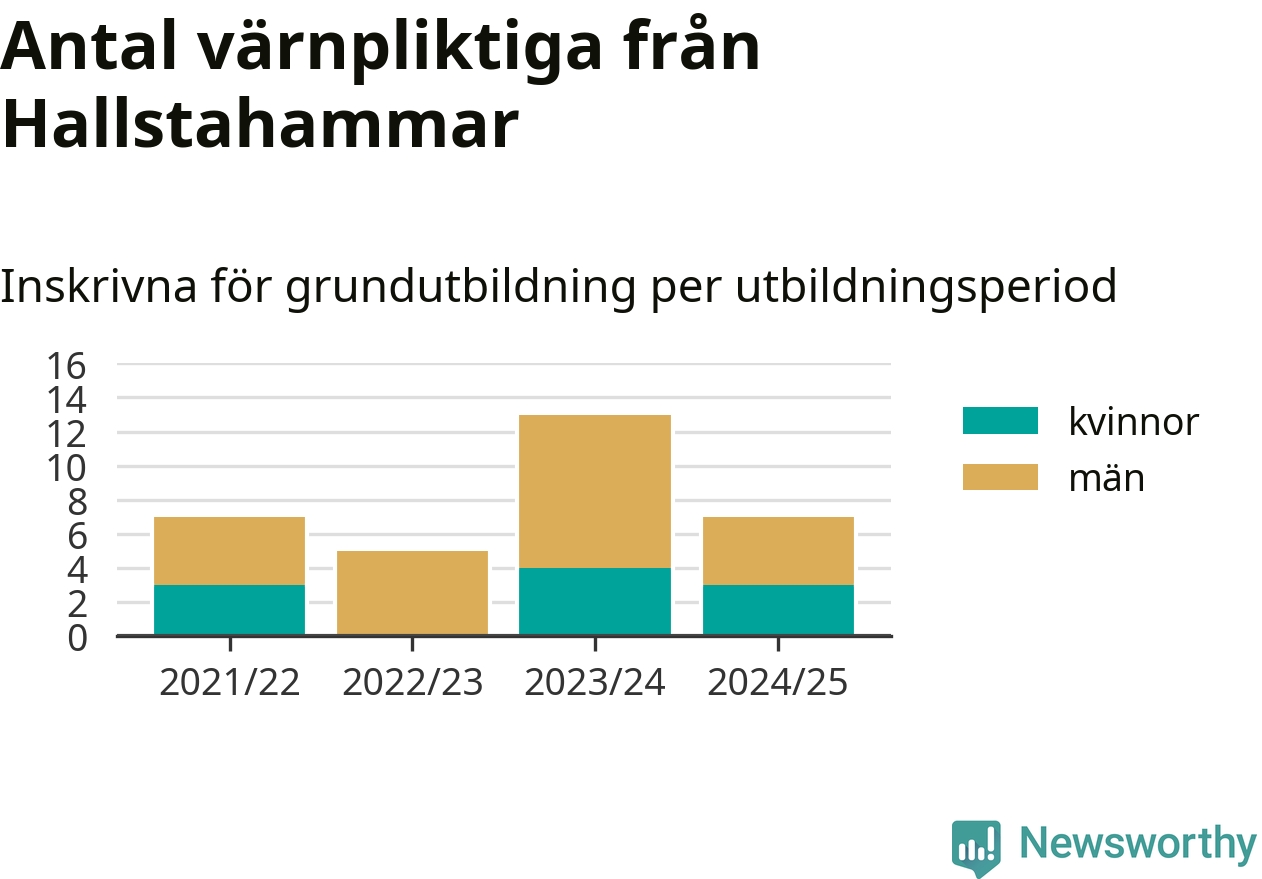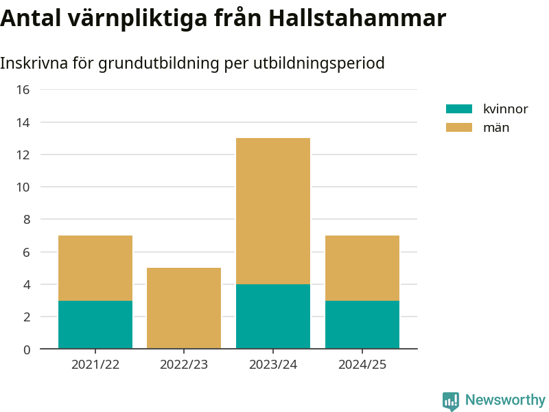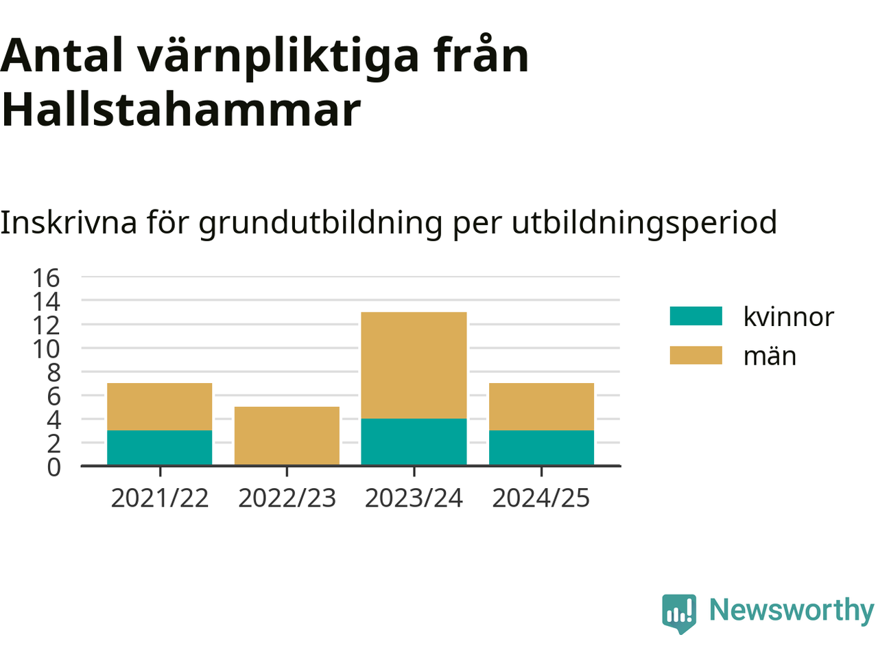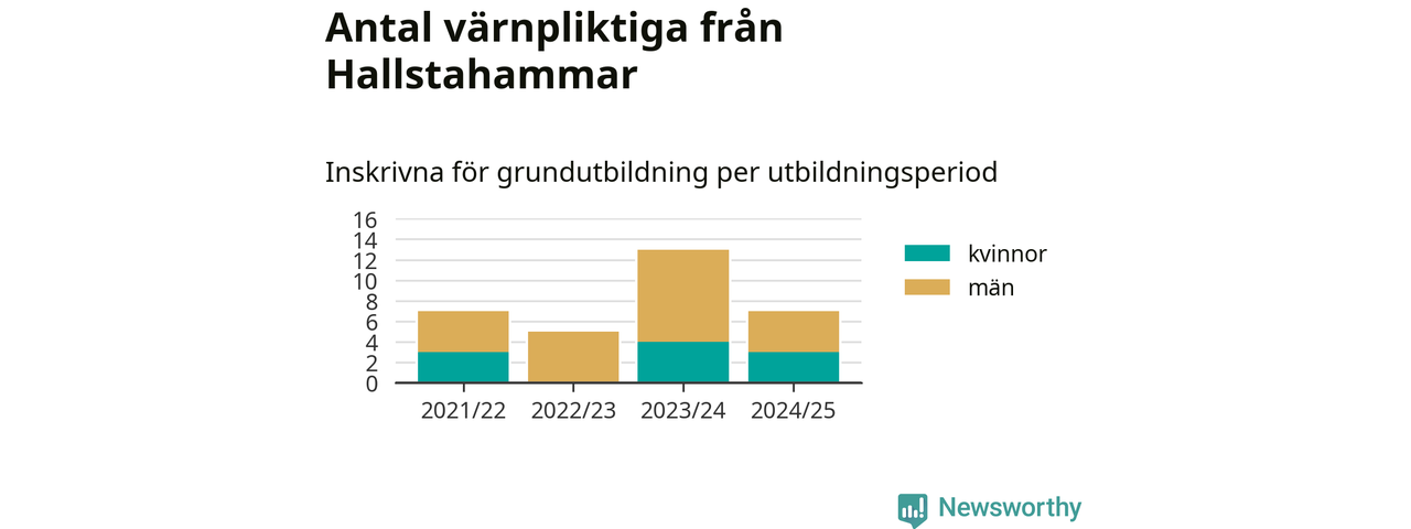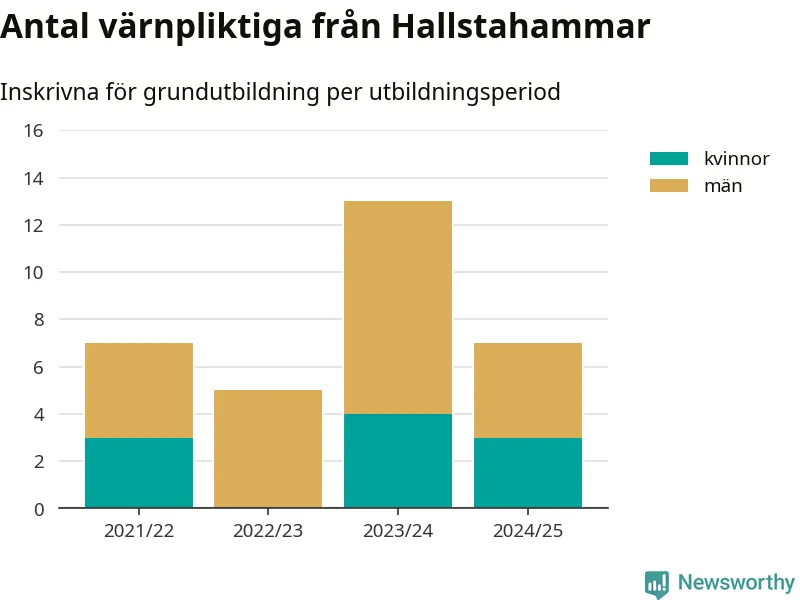 Sju värnpliktiga från Hallstahammar har skrivits in för att göra lumpen under innevarande utbildningsperiod, som sträcker sig från juni 2024 till och med första halvåret 2025. Det är ett färre än året innan. Den allmänna värnplikten återinfördes 2018 och vi har siffror nedbrutna på kommunnivå sedan 2021/22. Som mest har 13 personer från Hallstahammar skrivits in, utbildningsperioden 2023/24.