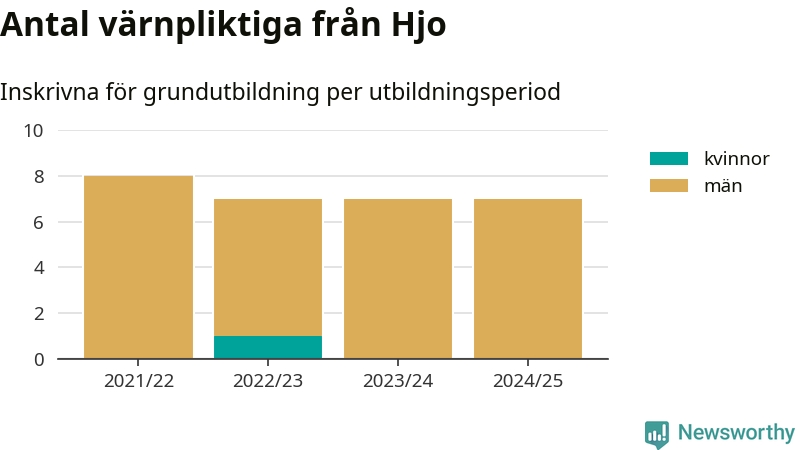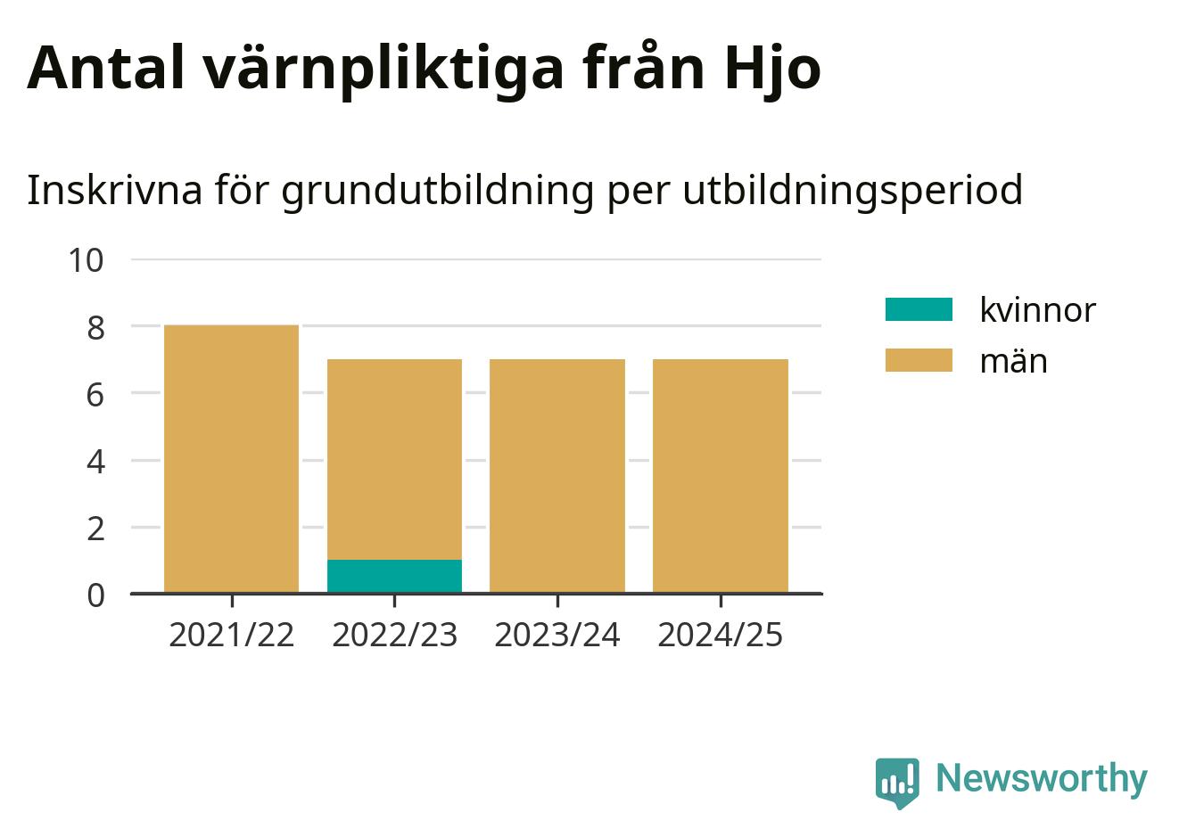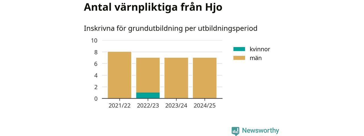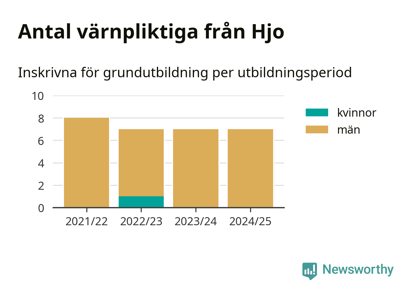 Sju värnpliktiga från Hjo har skrivits in för att göra lumpen under innevarande utbildningsperiod, som sträcker sig från juni 2024 till och med första halvåret 2025. Det är lika många som året innan. Den allmänna värnplikten återinfördes 2018 och vi har siffror nedbrutna på kommunnivå sedan 2021/22. Som mest har åtta personer från Hjo skrivits in, utbildningsperioden 2021/22.