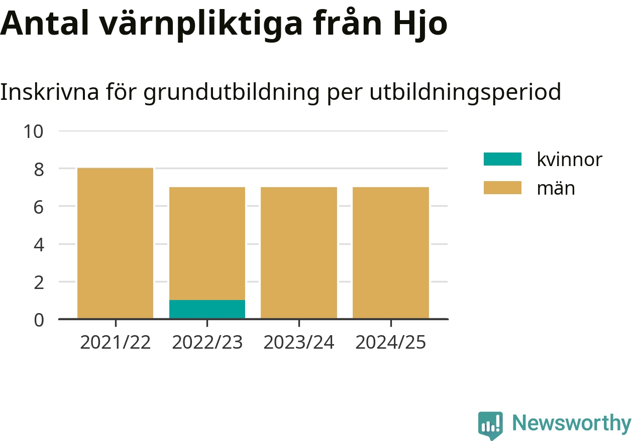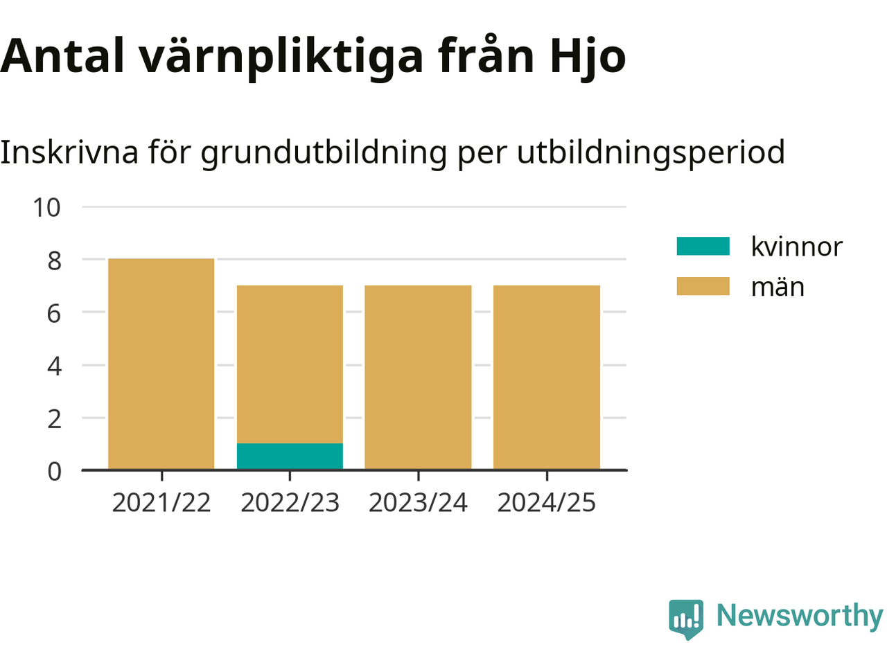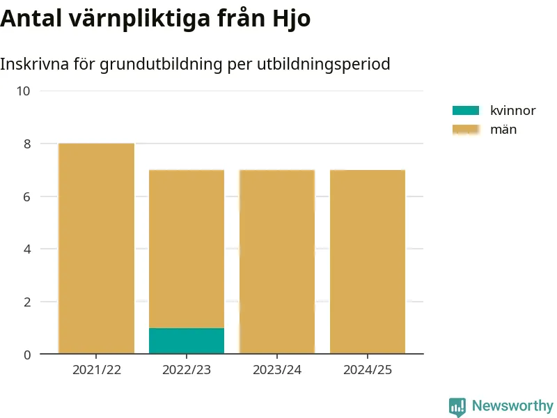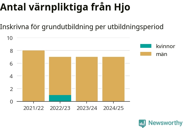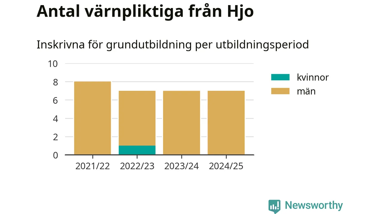 Sju värnpliktiga från Hjo har skrivits in för att göra lumpen under innevarande utbildningsperiod, som sträcker sig från juni 2024 till och med första halvåret 2025. Det är lika många som året innan. Den allmänna värnplikten återinfördes 2018 och vi har siffror nedbrutna på kommunnivå sedan 2021/22. Som mest har åtta personer från Hjo skrivits in, utbildningsperioden 2021/22.