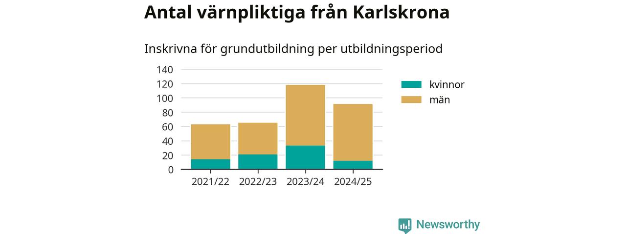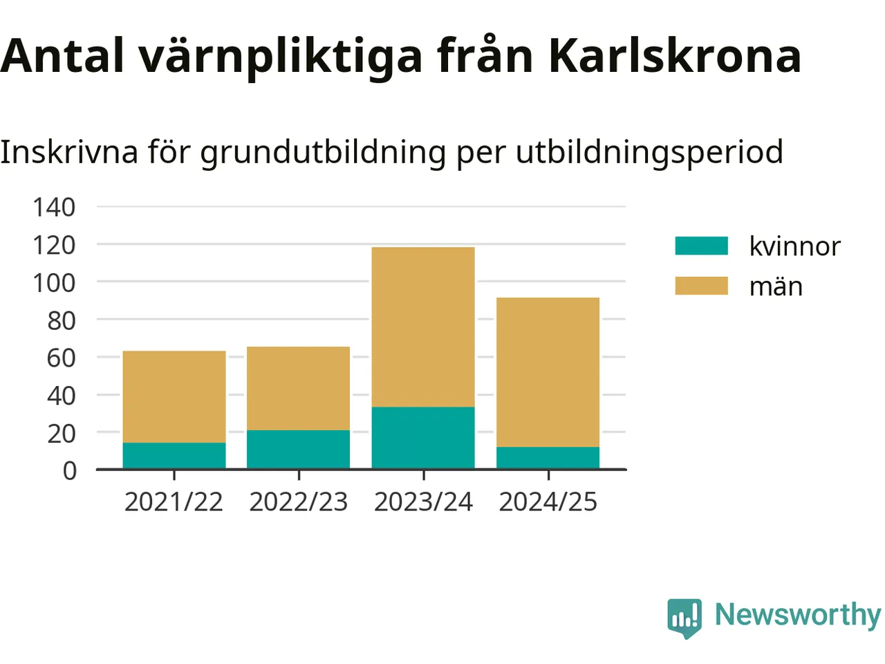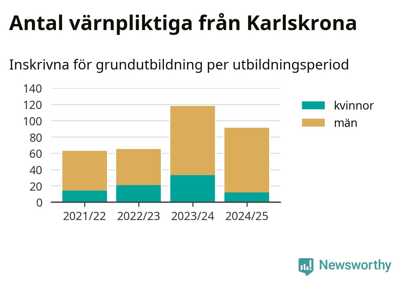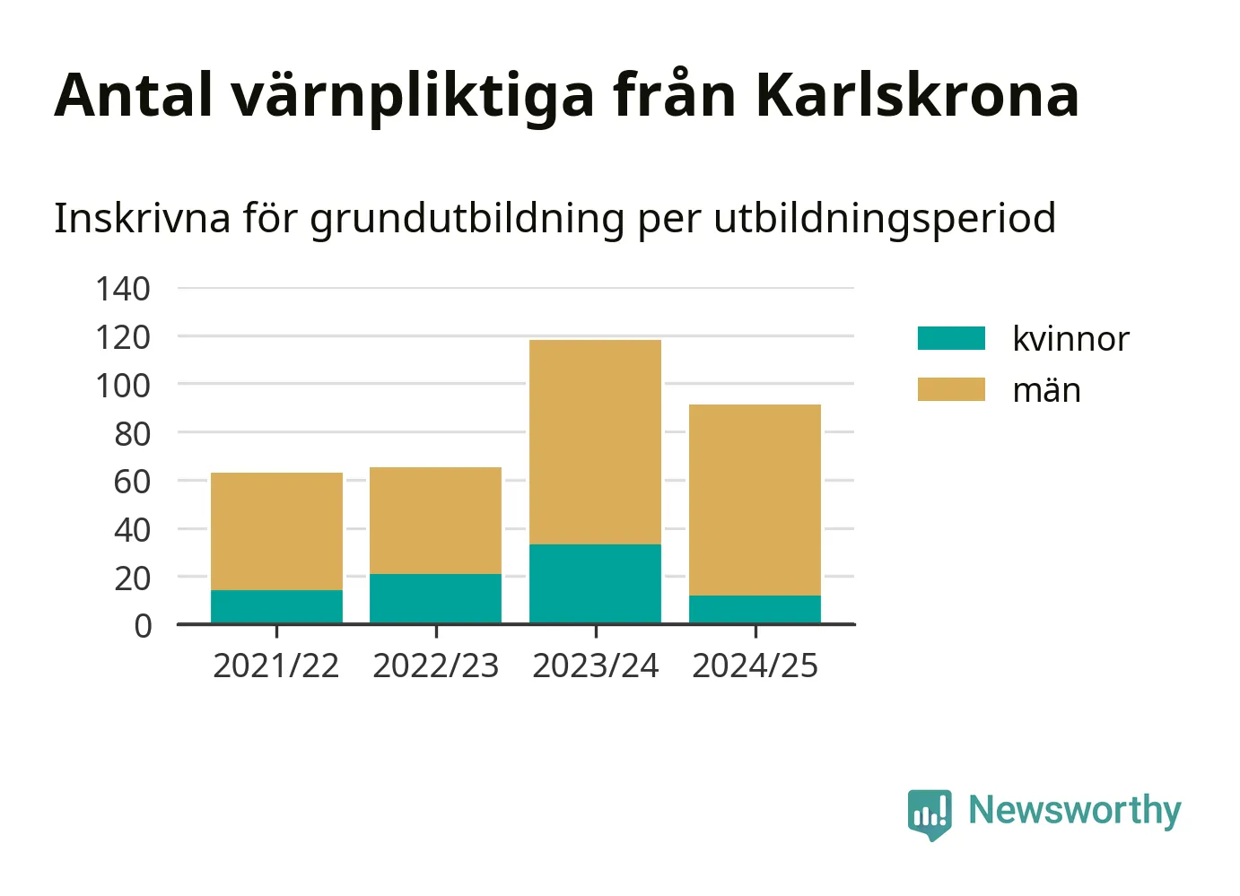 91 värnpliktiga från Karlskrona har skrivits in för att göra lumpen under innevarande utbildningsperiod, som sträcker sig från juni 2024 till och med första halvåret 2025. Det är 21 färre än året innan. Den allmänna värnplikten återinfördes 2018 och vi har siffror nedbrutna på kommunnivå sedan 2021/22. Som mest har 118 personer från Karlskrona skrivits in, utbildningsperioden 2023/24.