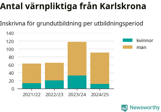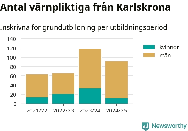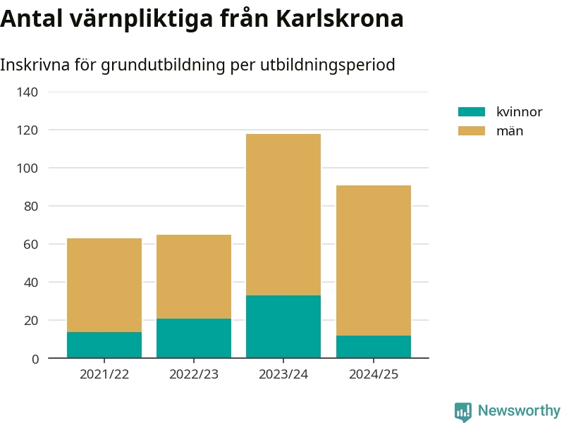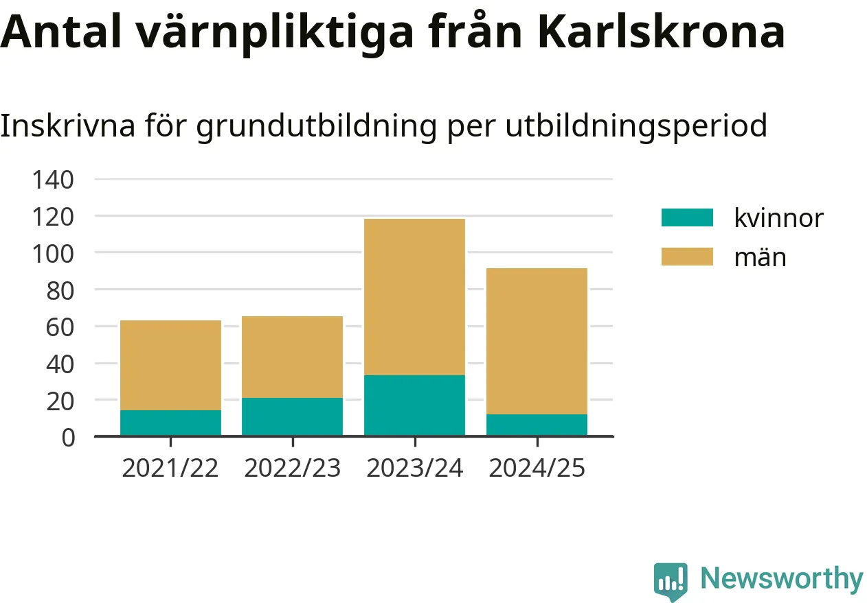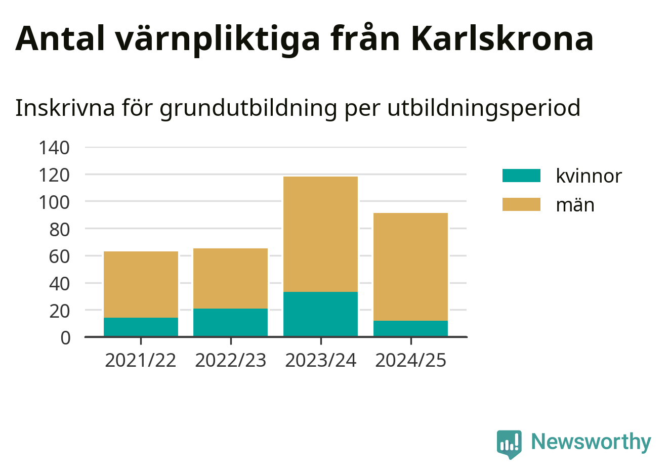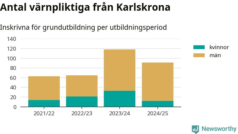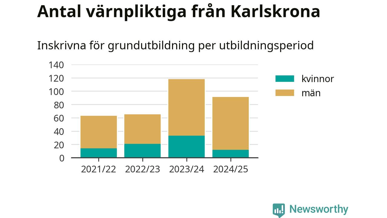 91 värnpliktiga från Karlskrona har skrivits in för att göra lumpen under innevarande utbildningsperiod, som sträcker sig från juni 2024 till och med första halvåret 2025. Det är 21 färre än året innan. Den allmänna värnplikten återinfördes 2018 och vi har siffror nedbrutna på kommunnivå sedan 2021/22. Som mest har 118 personer från Karlskrona skrivits in, utbildningsperioden 2023/24.