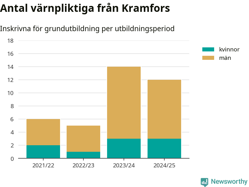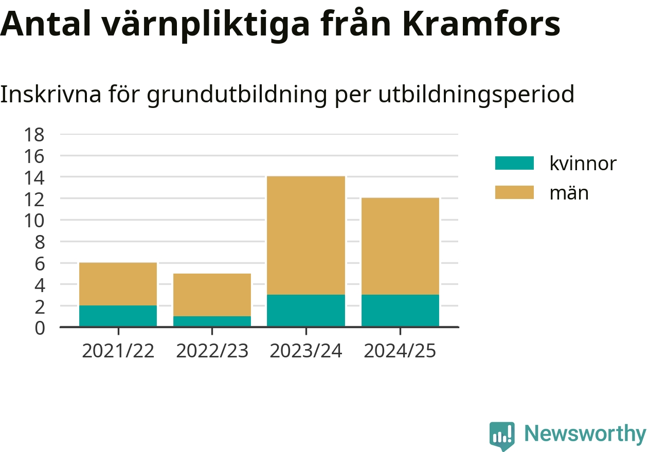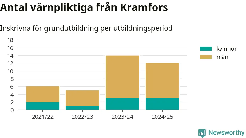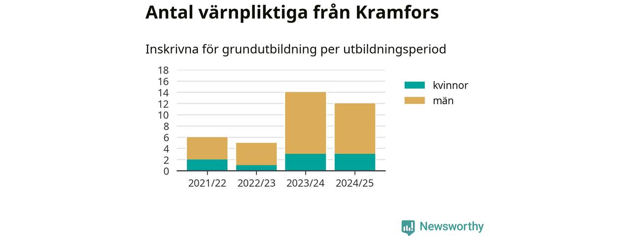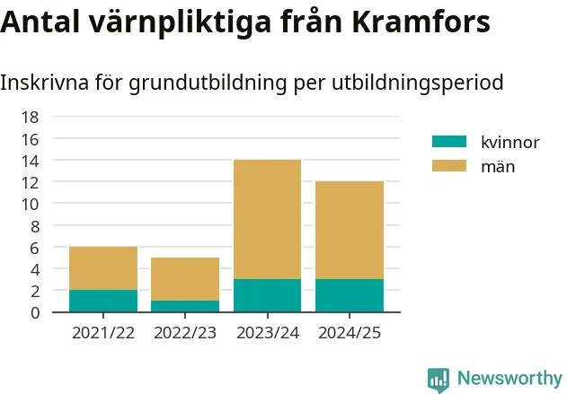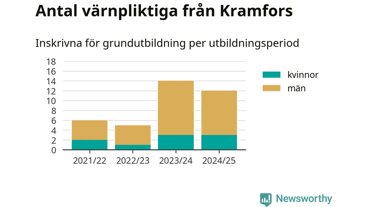 Tolv värnpliktiga från Kramfors har skrivits in för att göra lumpen under innevarande utbildningsperiod, som sträcker sig från juni 2024 till och med första halvåret 2025. Det är lika många som året innan. Den allmänna värnplikten återinfördes 2018 och vi har siffror nedbrutna på kommunnivå sedan 2021/22. Som mest har 14 personer från Kramfors skrivits in, utbildningsperioden 2023/24.
