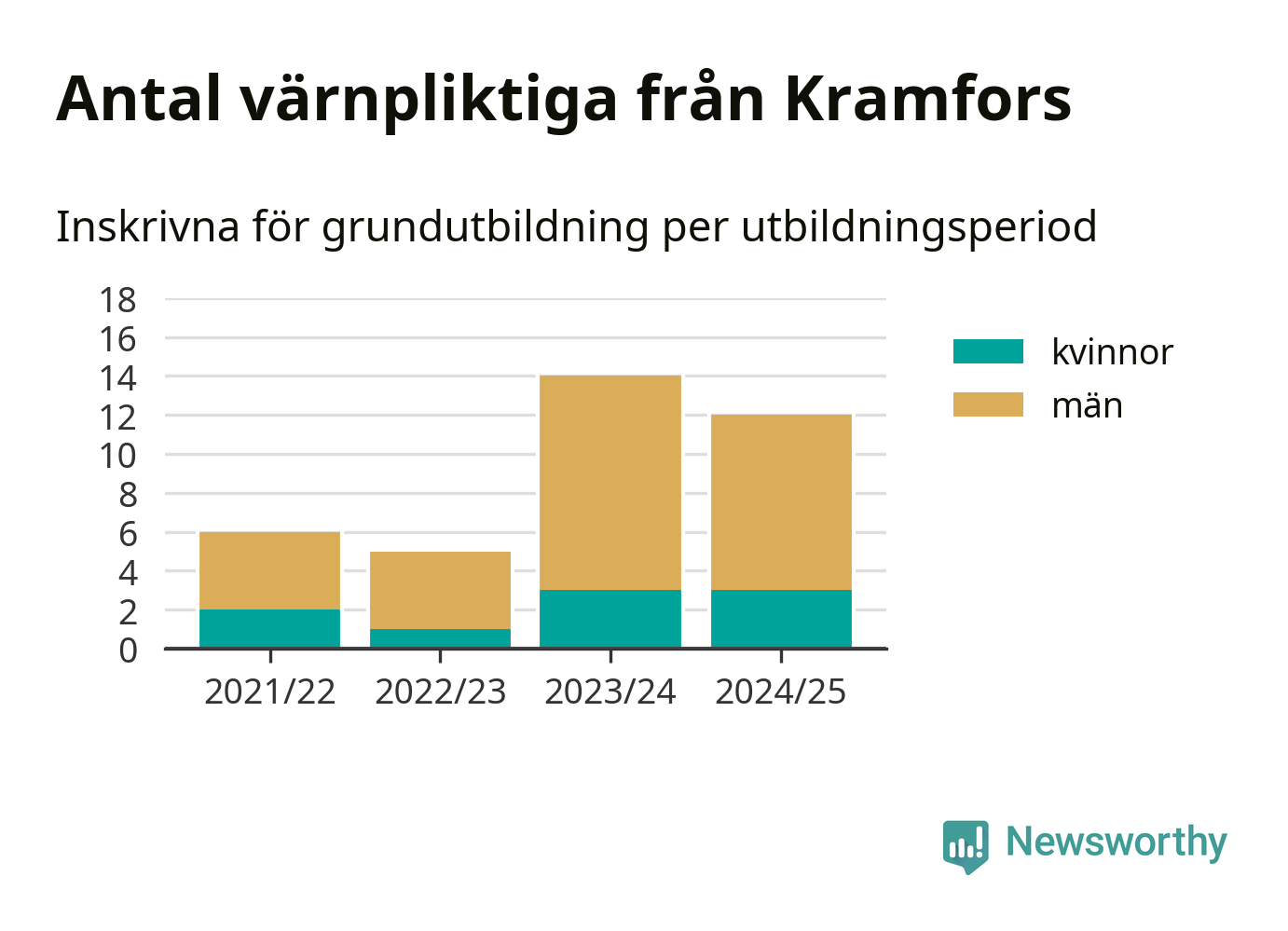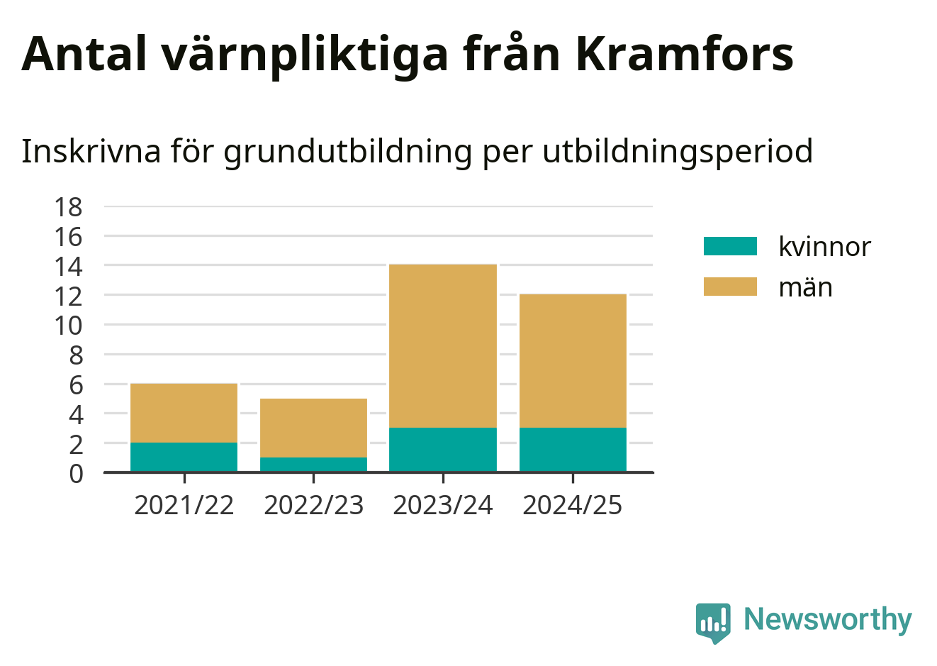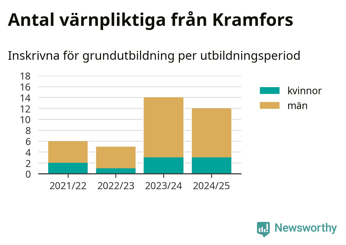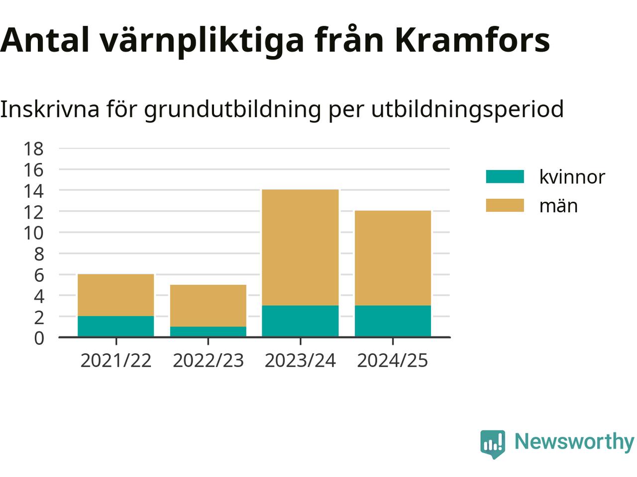 Tolv värnpliktiga från Kramfors har skrivits in för att göra lumpen under innevarande utbildningsperiod, som sträcker sig från juni 2024 till och med första halvåret 2025. Det är lika många som året innan. Den allmänna värnplikten återinfördes 2018 och vi har siffror nedbrutna på kommunnivå sedan 2021/22. Som mest har 14 personer från Kramfors skrivits in, utbildningsperioden 2023/24.
