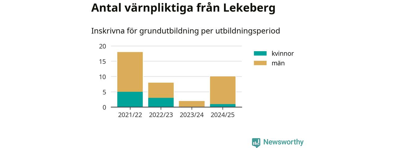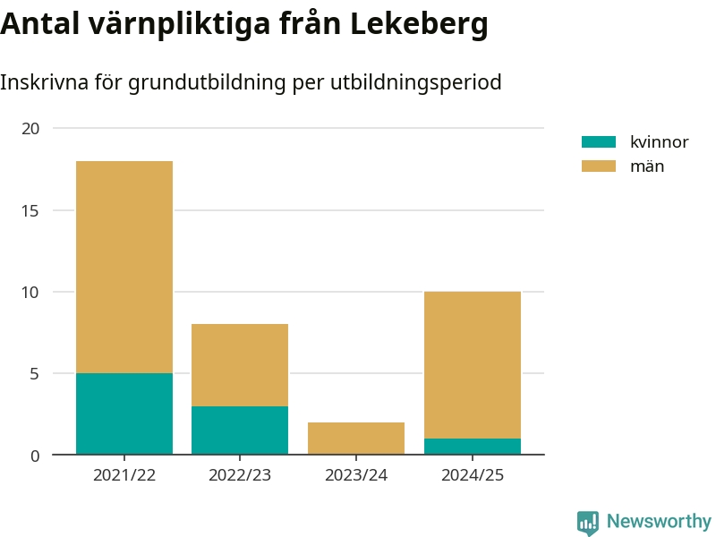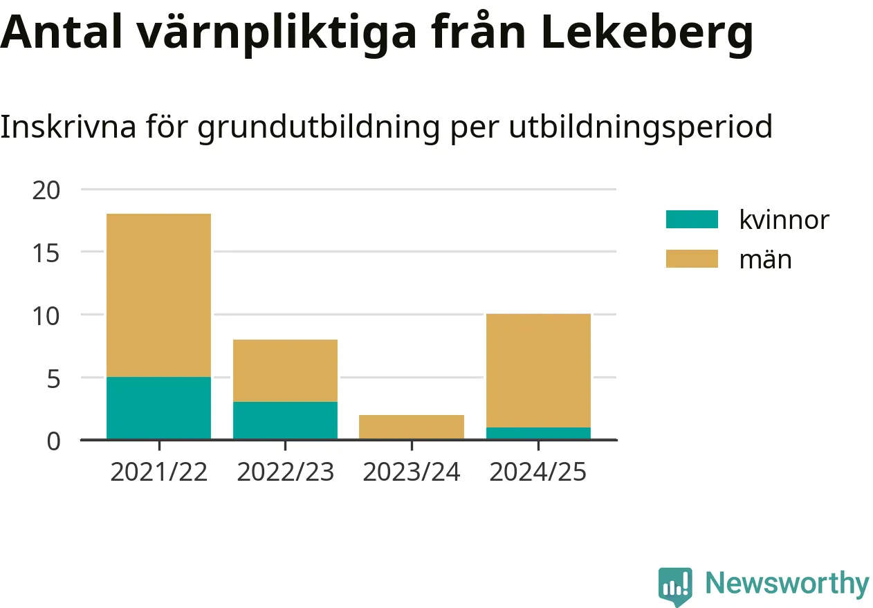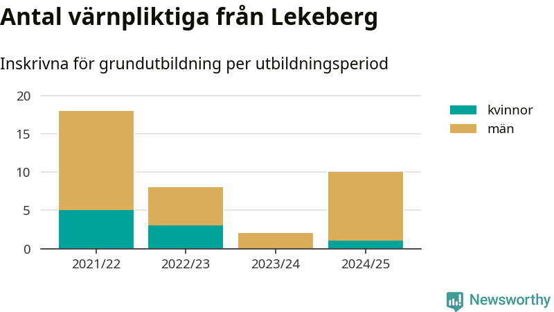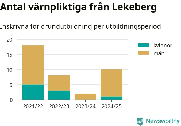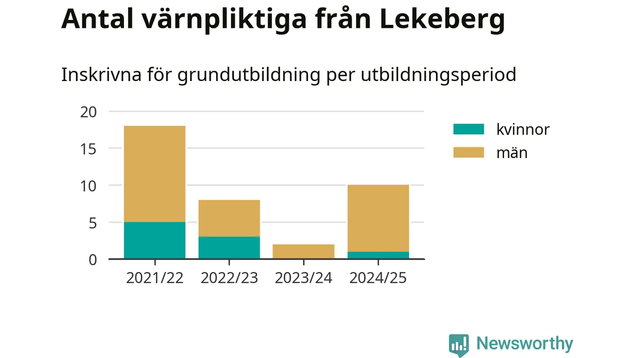 Tio värnpliktiga från Lekeberg har skrivits in för att göra lumpen under innevarande utbildningsperiod, som sträcker sig från juni 2024 till och med första halvåret 2025. Det är ett fler än året innan. Den allmänna värnplikten återinfördes 2018 och vi har siffror nedbrutna på kommunnivå sedan 2021/22. Som mest har 18 personer från Lekeberg skrivits in, utbildningsperioden 2021/22.