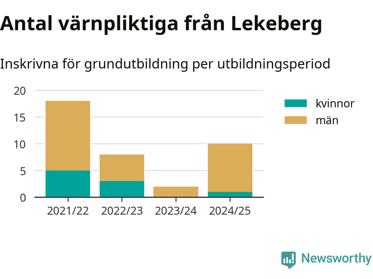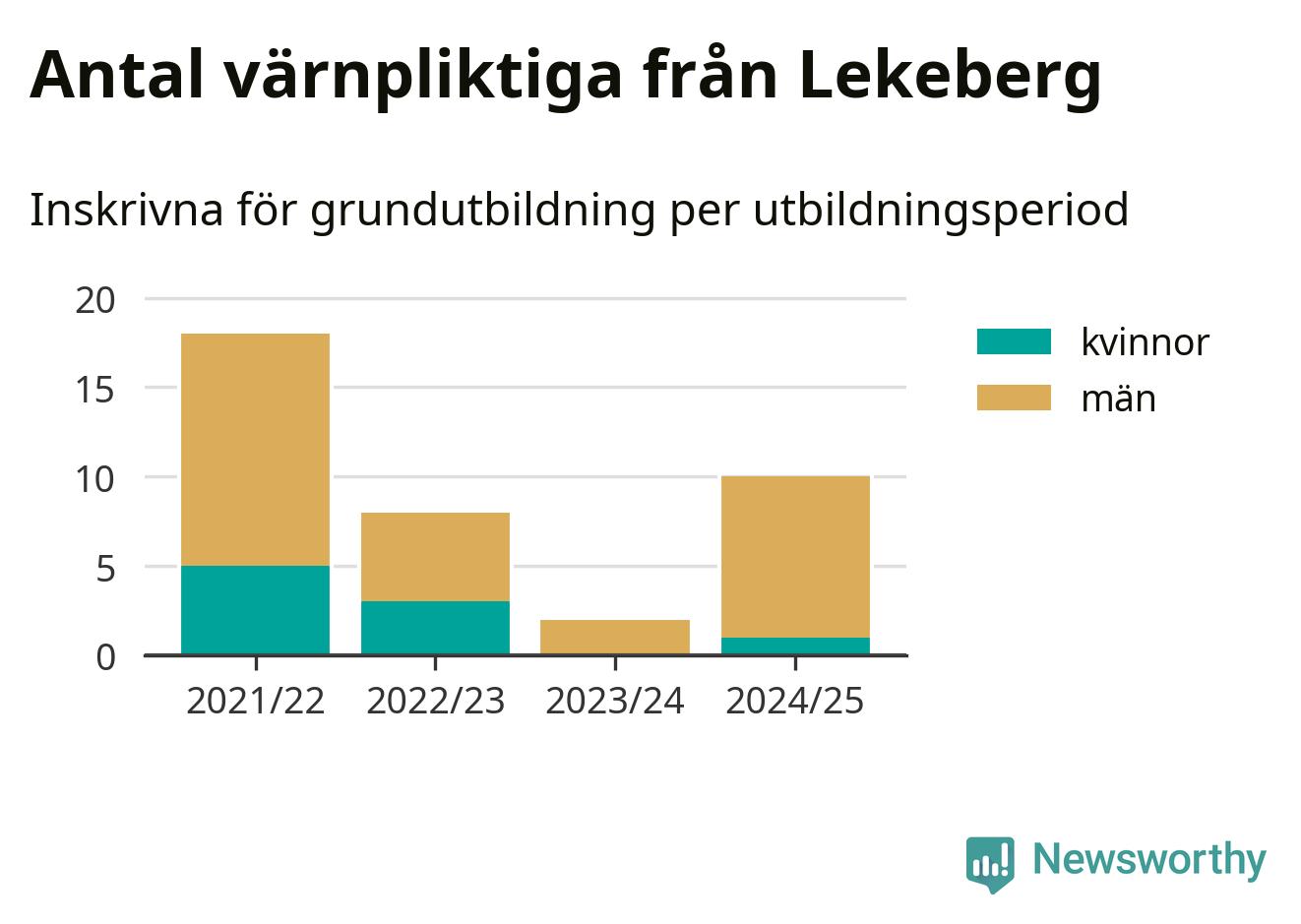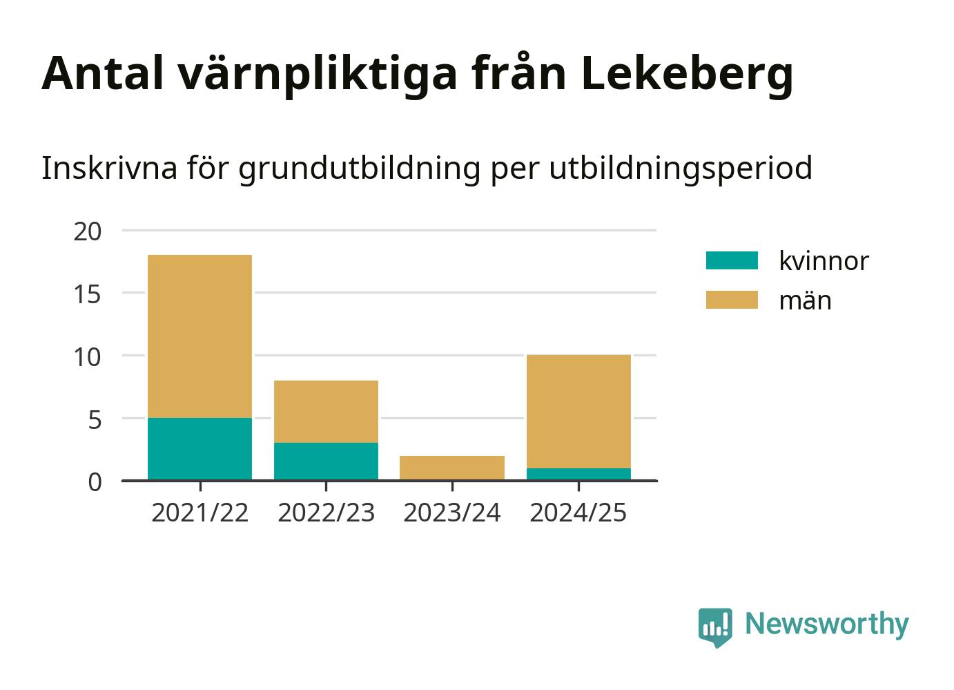 Tio värnpliktiga från Lekeberg har skrivits in för att göra lumpen under innevarande utbildningsperiod, som sträcker sig från juni 2024 till och med första halvåret 2025. Det är ett fler än året innan. Den allmänna värnplikten återinfördes 2018 och vi har siffror nedbrutna på kommunnivå sedan 2021/22. Som mest har 18 personer från Lekeberg skrivits in, utbildningsperioden 2021/22.