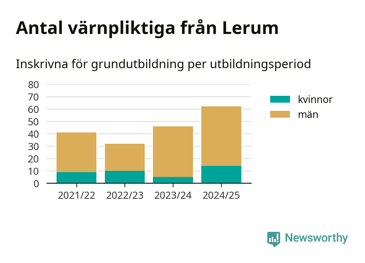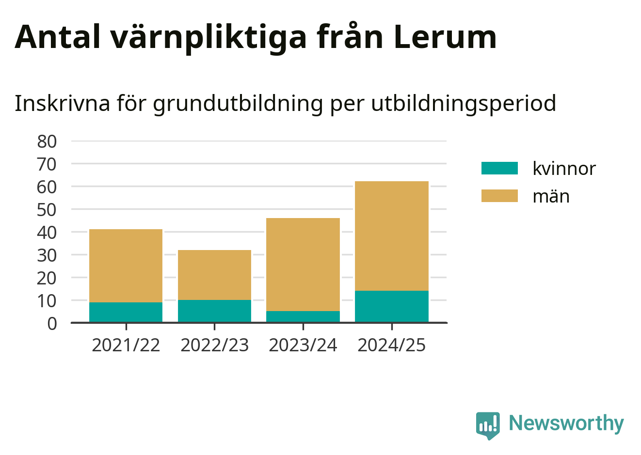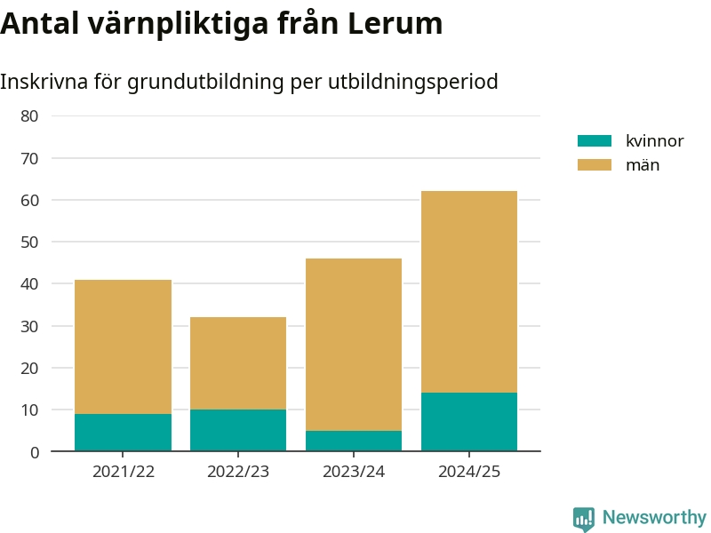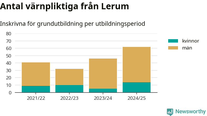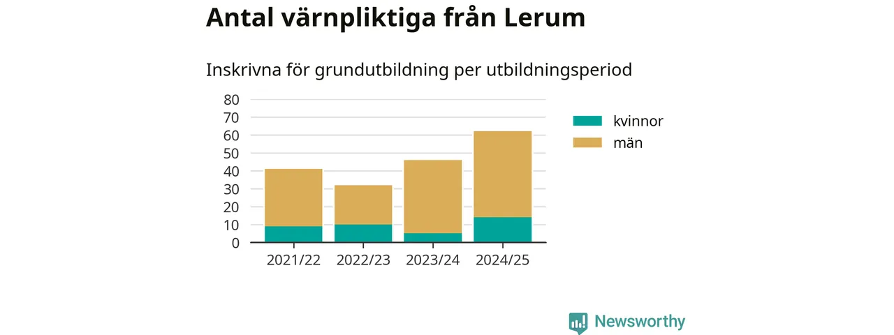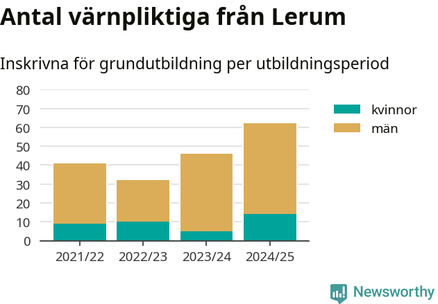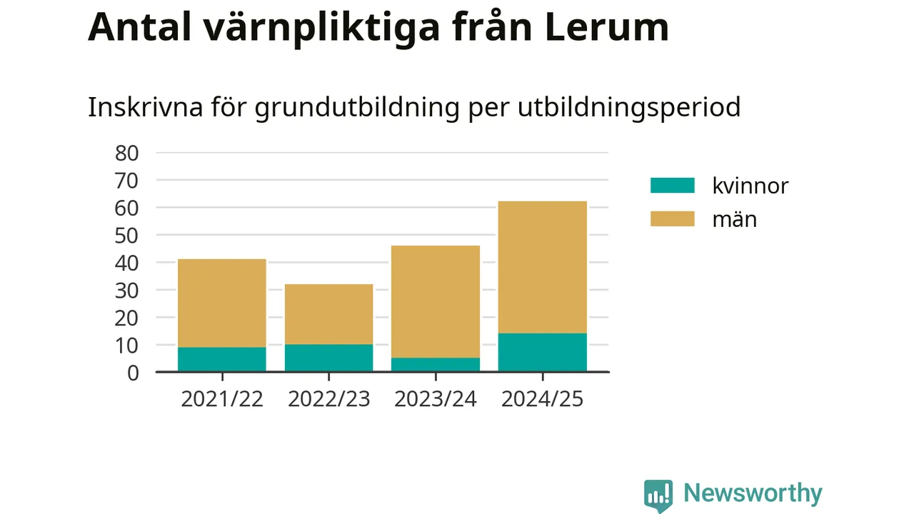 Antalet värnpliktiga från Lerum ökar stadigt, visar siffror från Plikt- och prövningsverket. Under det här värnpliktsåret, med utbildningsstart från juni 2024 till början av 2025, är 62 värnpliktiga inskrivna för att påbörja sin grundutbildning. Det är den högsta siffran åtminstone sedan 2021/22, vilket är så långt bakåt vi har siffror på kommunnivå. Den allmänna värnplikten återinfördes 2018.