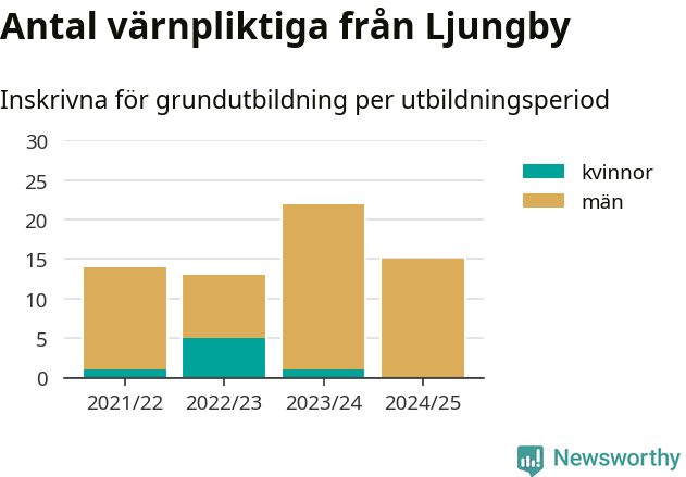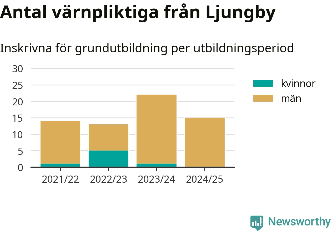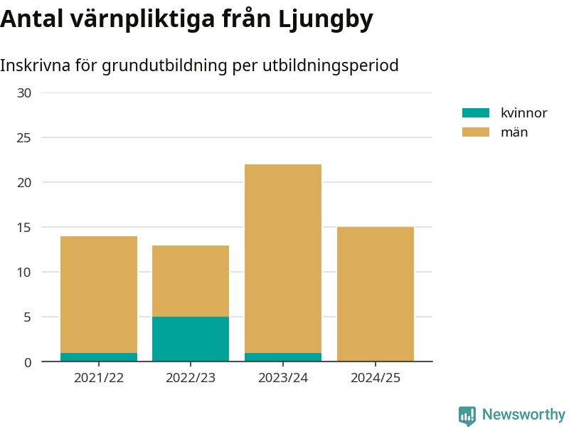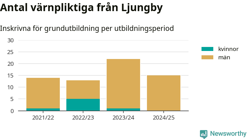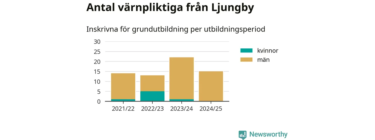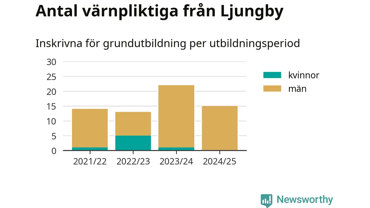 15 värnpliktiga från Ljungby har skrivits in för att göra lumpen under innevarande utbildningsperiod, som sträcker sig från juni 2024 till och med första halvåret 2025. Det är ett färre än året innan. Den allmänna värnplikten återinfördes 2018 och vi har siffror nedbrutna på kommunnivå sedan 2021/22. Som mest har 22 personer från Ljungby skrivits in, utbildningsperioden 2023/24.