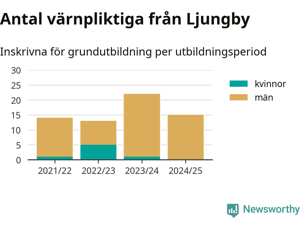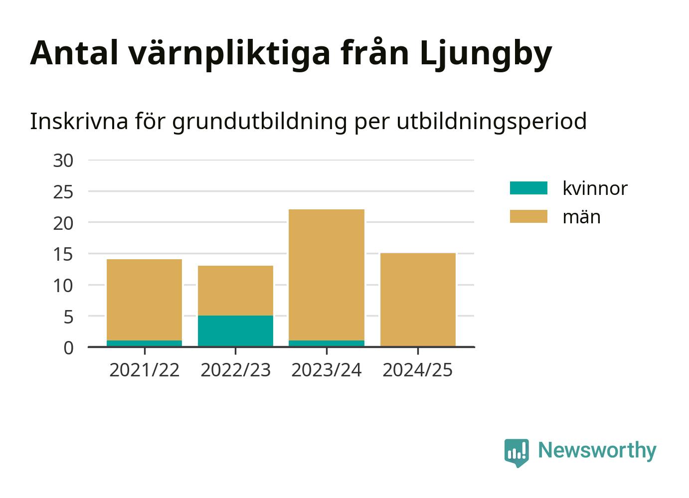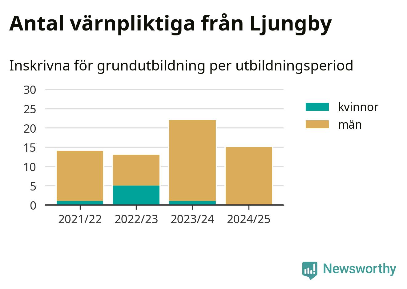 15 värnpliktiga från Ljungby har skrivits in för att göra lumpen under innevarande utbildningsperiod, som sträcker sig från juni 2024 till och med första halvåret 2025. Det är ett färre än året innan. Den allmänna värnplikten återinfördes 2018 och vi har siffror nedbrutna på kommunnivå sedan 2021/22. Som mest har 22 personer från Ljungby skrivits in, utbildningsperioden 2023/24.