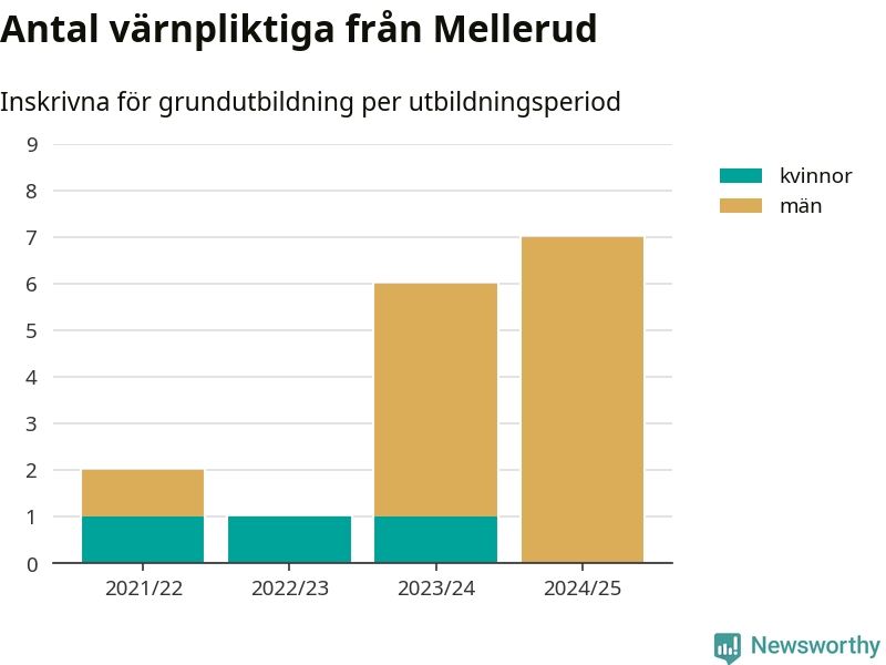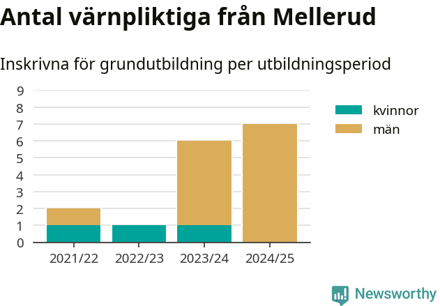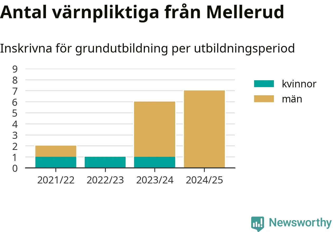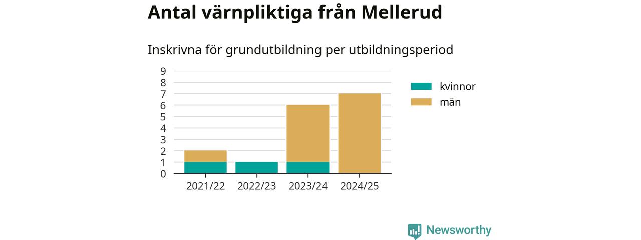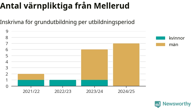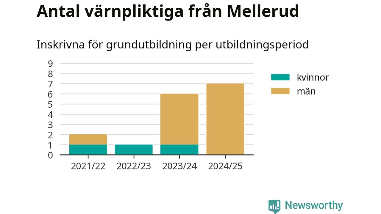 Antalet värnpliktiga från Mellerud ökar stadigt, visar siffror från Plikt- och prövningsverket. Under det här värnpliktsåret, med utbildningsstart från juni 2024 till början av 2025, är sju värnpliktiga inskrivna för att påbörja sin grundutbildning. Det är den högsta siffran åtminstone sedan 2021/22, vilket är så långt bakåt vi har siffror på kommunnivå. Den allmänna värnplikten återinfördes 2018.