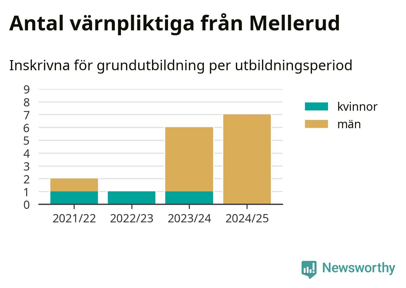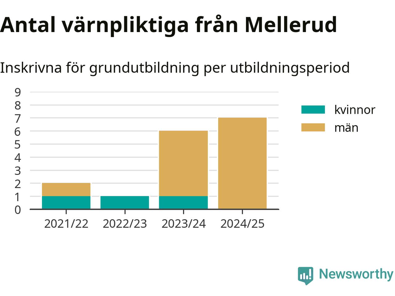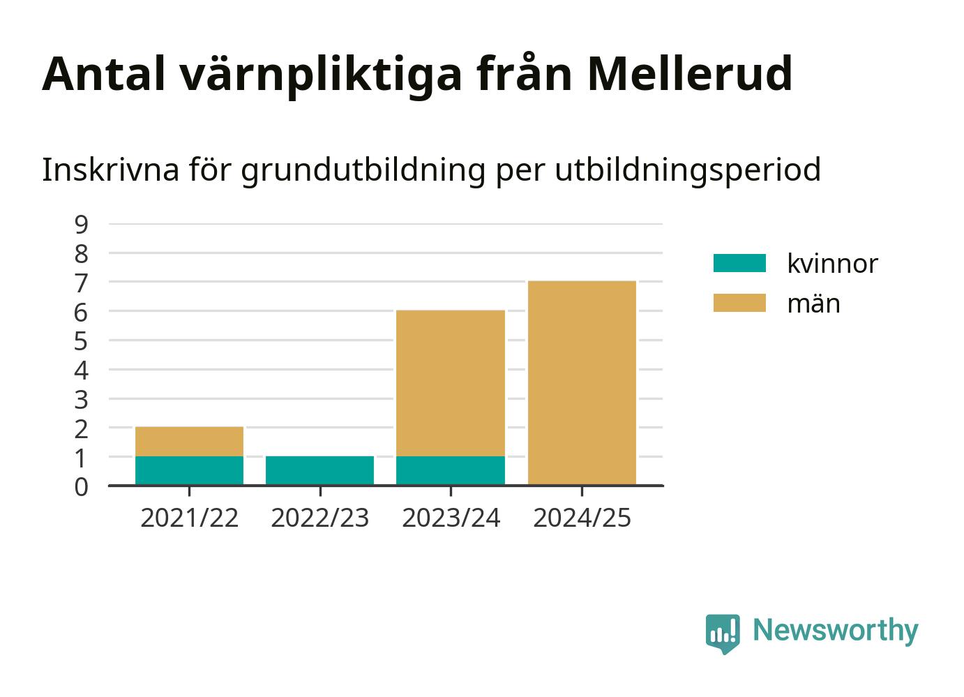 Antalet värnpliktiga från Mellerud ökar stadigt, visar siffror från Plikt- och prövningsverket. Under det här värnpliktsåret, med utbildningsstart från juni 2024 till början av 2025, är sju värnpliktiga inskrivna för att påbörja sin grundutbildning. Det är den högsta siffran åtminstone sedan 2021/22, vilket är så långt bakåt vi har siffror på kommunnivå. Den allmänna värnplikten återinfördes 2018.