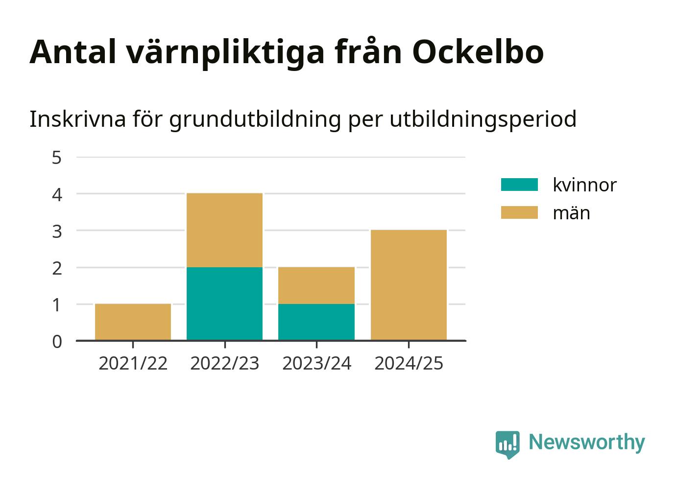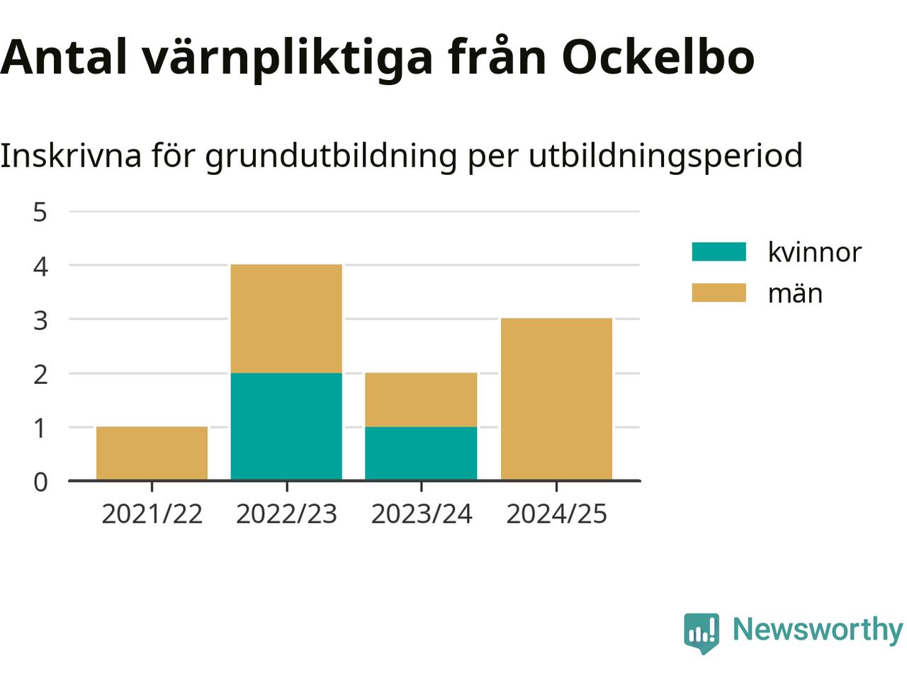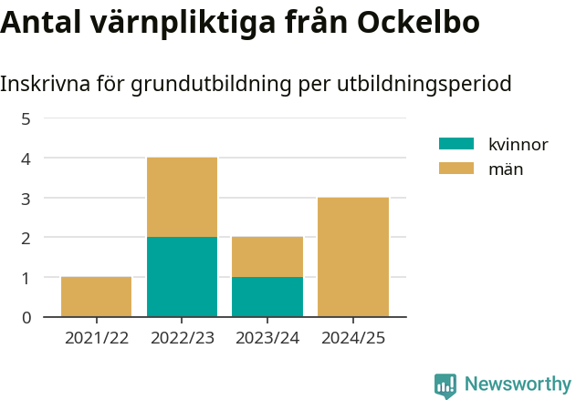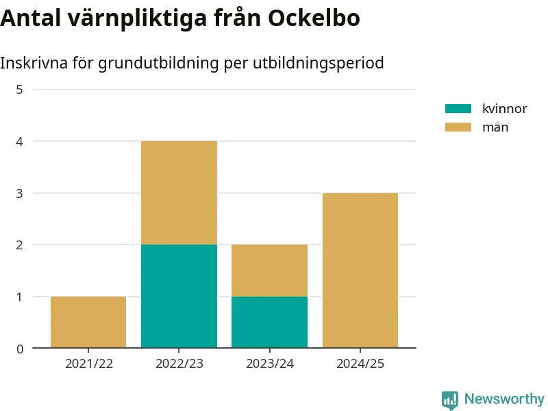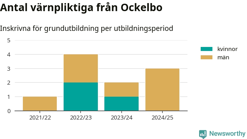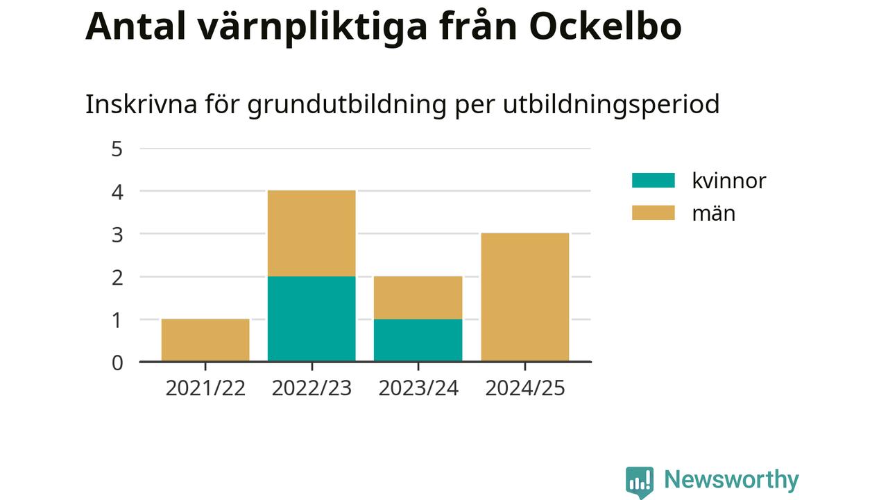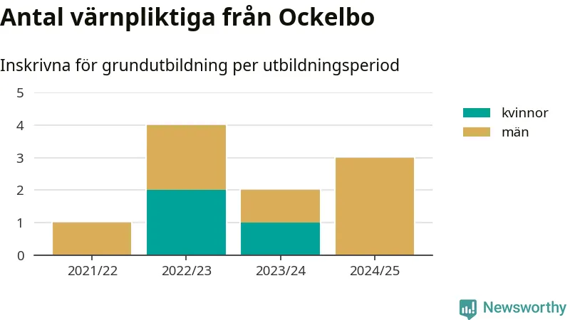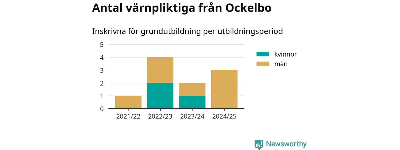 Tre värnpliktiga från Ockelbo har skrivits in för att göra lumpen under innevarande utbildningsperiod, som sträcker sig från juni 2024 till och med första halvåret 2025. Det är ett färre än året innan. Den allmänna värnplikten återinfördes 2018 och vi har siffror nedbrutna på kommunnivå sedan 2021/22. Som mest har fyra personer från Ockelbo skrivits in, utbildningsperioden 2022/23.