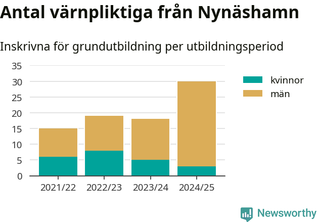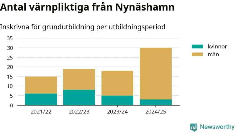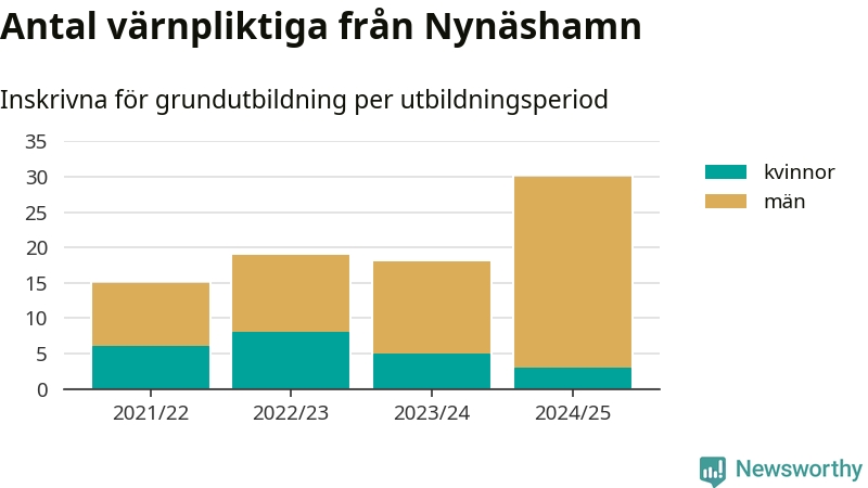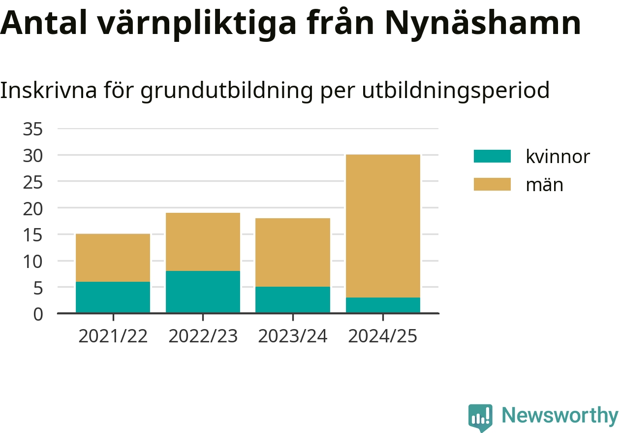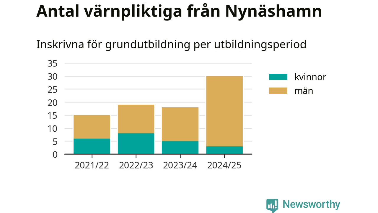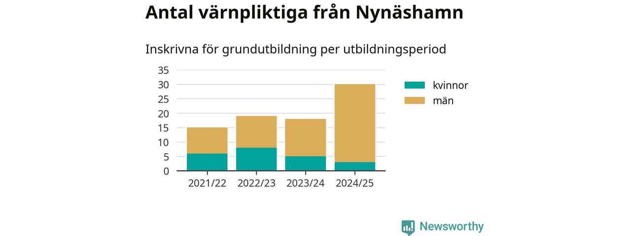 30 värnpliktiga från Nynäshamn har skrivits in för att göra lumpen under innevarande utbildningsperiod, som sträcker sig från juni 2024 till och med första halvåret 2025. Det är den högsta siffran åtminstone sedan 2021/22, vilket är så långt bakåt vi har siffror på kommunnivå. Den allmänna värnplikten återinfördes 2018.