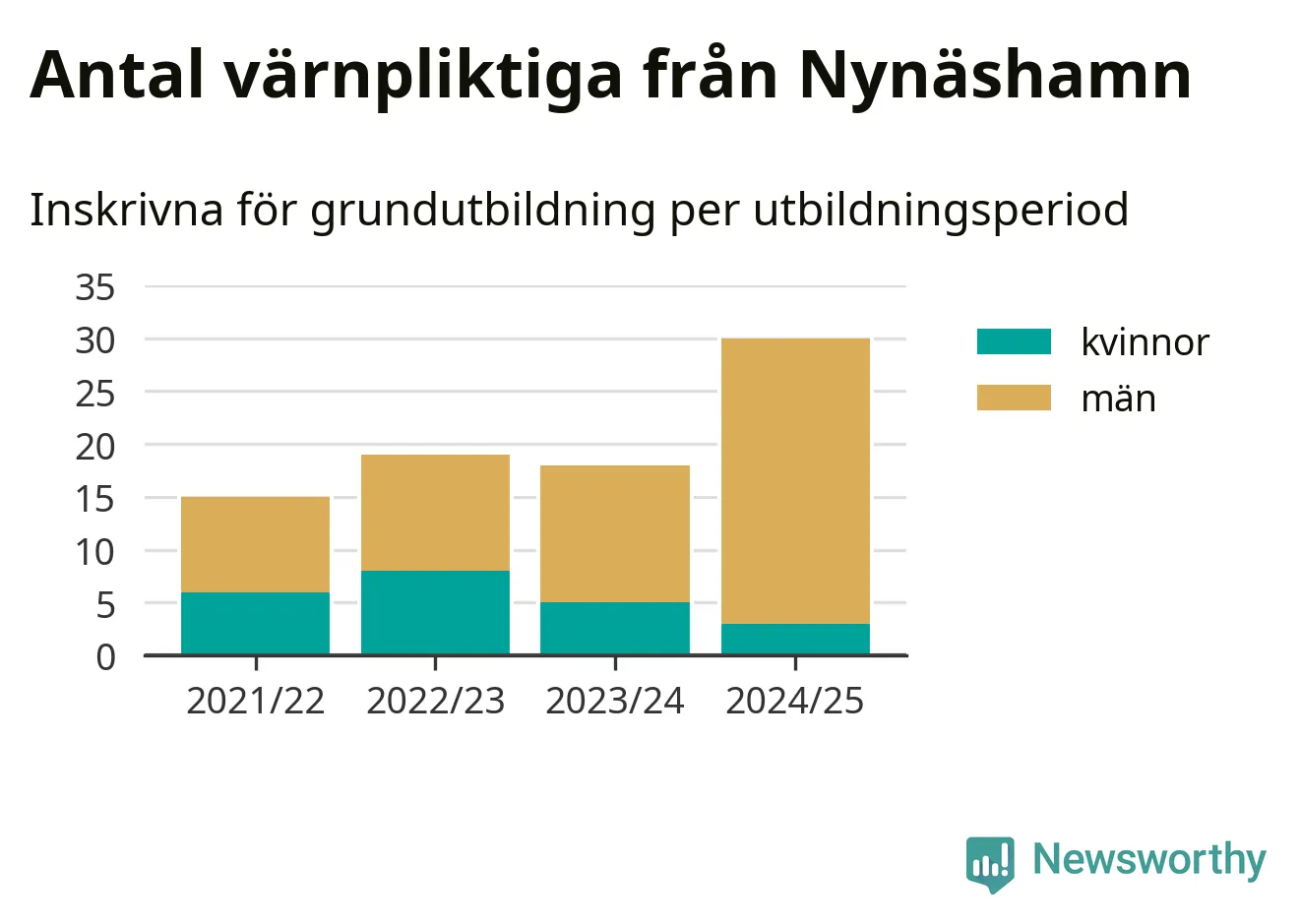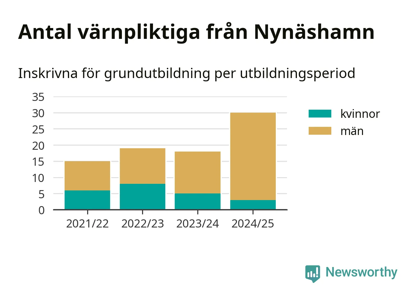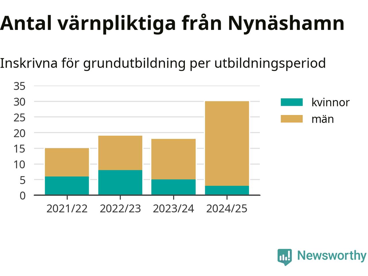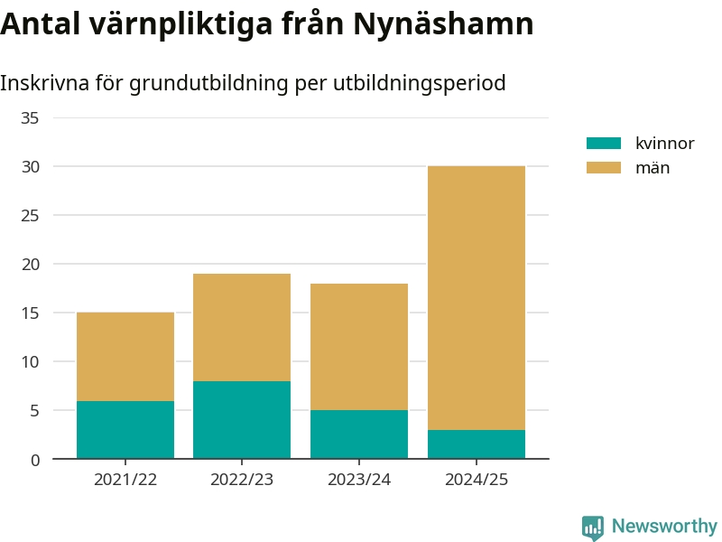 30 värnpliktiga från Nynäshamn har skrivits in för att göra lumpen under innevarande utbildningsperiod, som sträcker sig från juni 2024 till och med första halvåret 2025. Det är den högsta siffran åtminstone sedan 2021/22, vilket är så långt bakåt vi har siffror på kommunnivå. Den allmänna värnplikten återinfördes 2018.