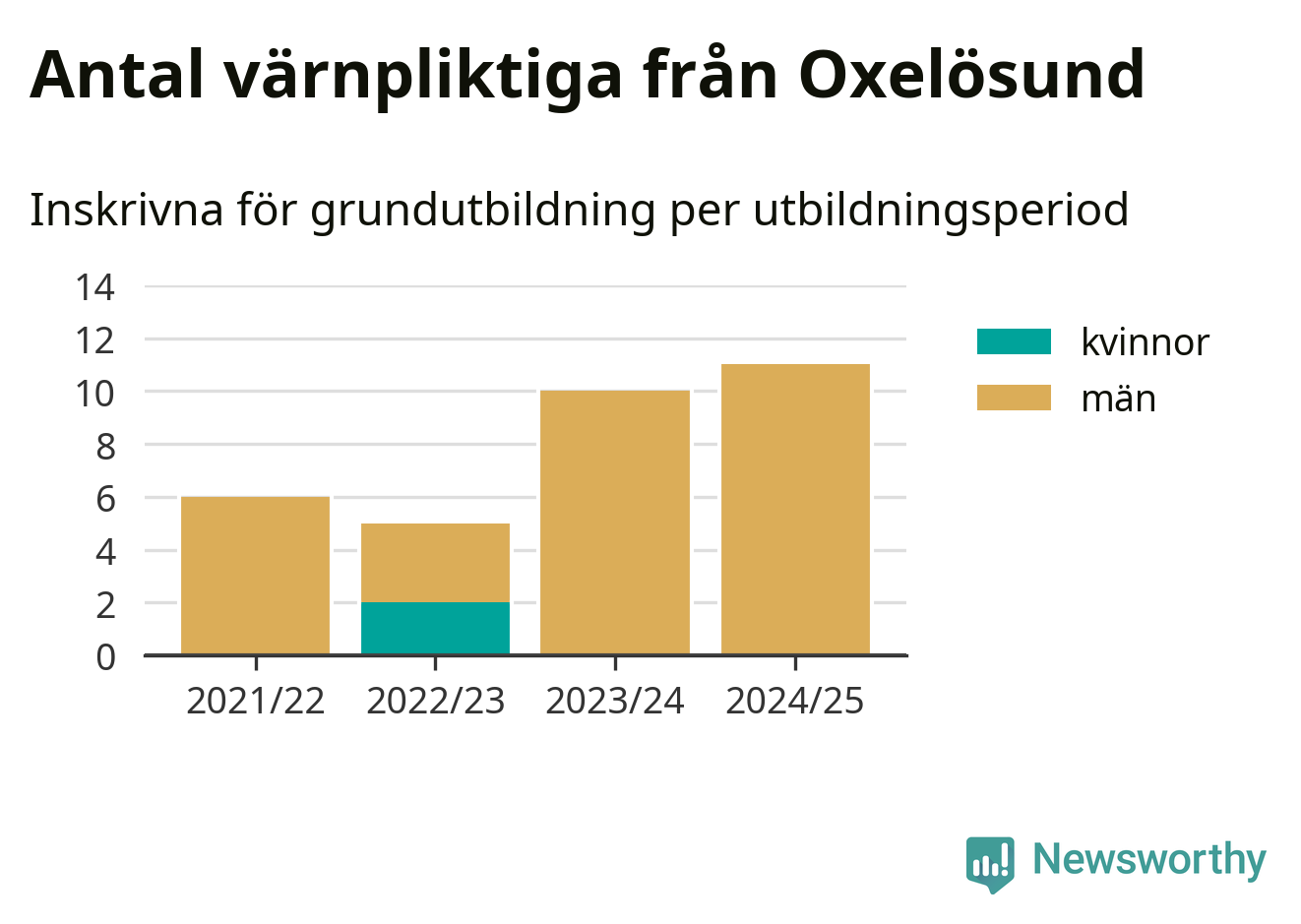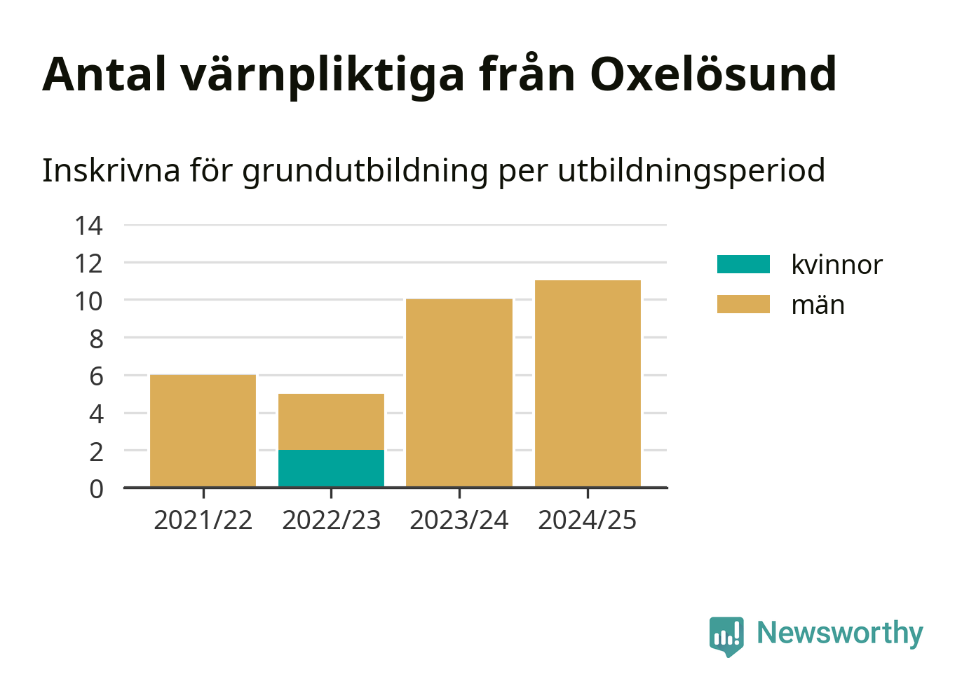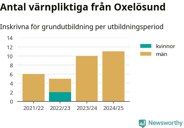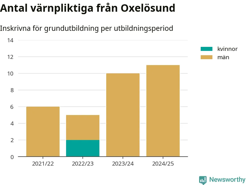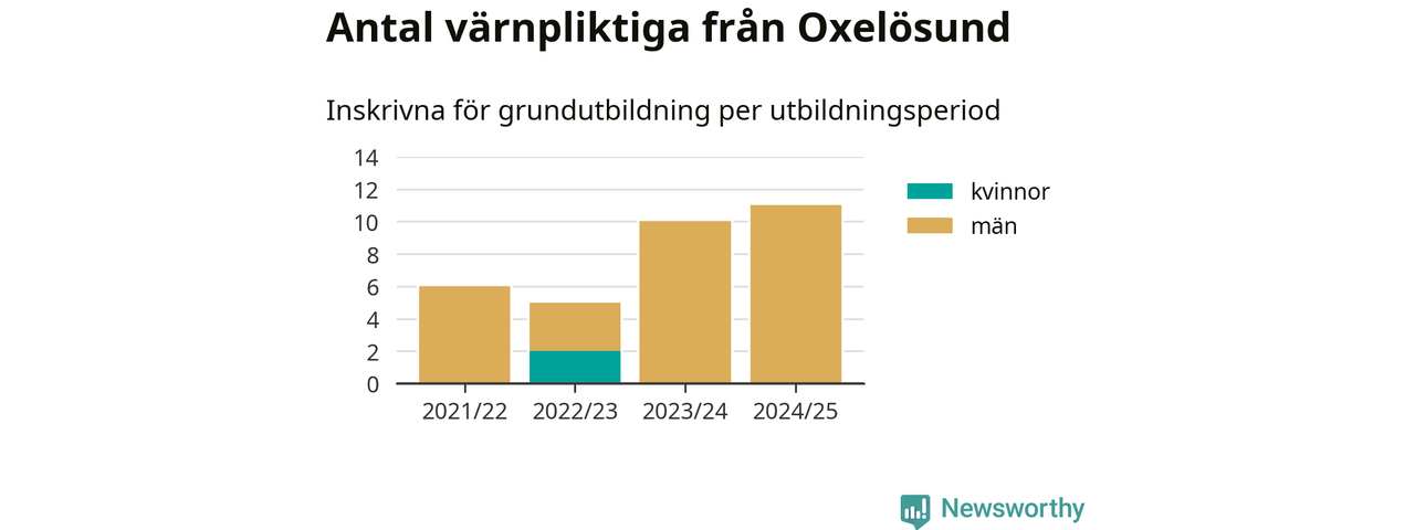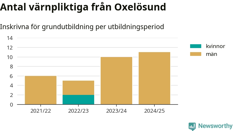 Antalet värnpliktiga från Oxelösund ökar stadigt, visar siffror från Plikt- och prövningsverket. Under det här värnpliktsåret, med utbildningsstart från juni 2024 till början av 2025, är elva värnpliktiga inskrivna för att påbörja sin grundutbildning. Det är den högsta siffran åtminstone sedan 2021/22, vilket är så långt bakåt vi har siffror på kommunnivå. Den allmänna värnplikten återinfördes 2018.