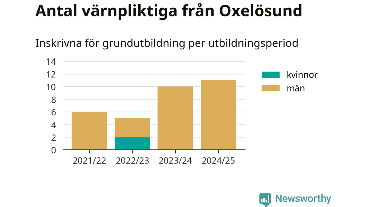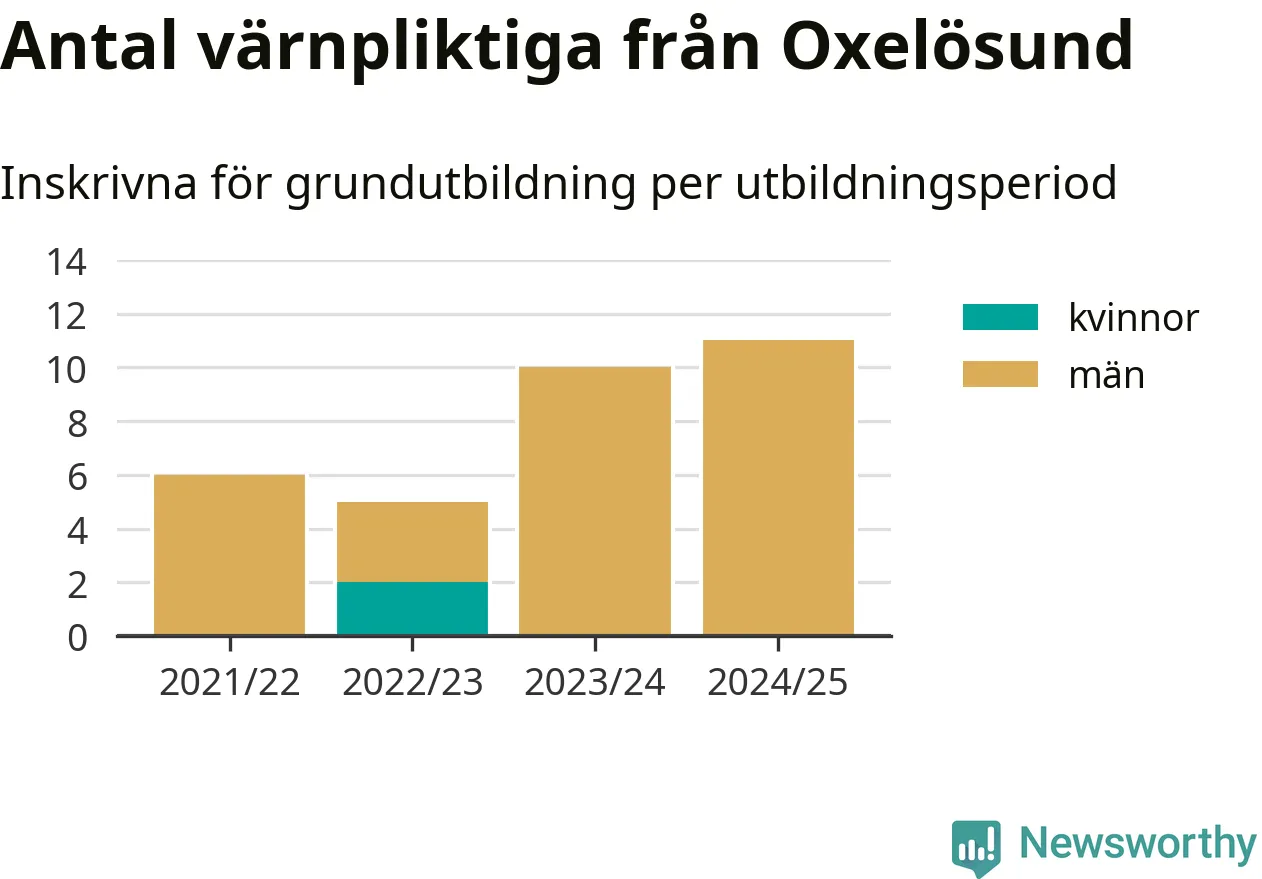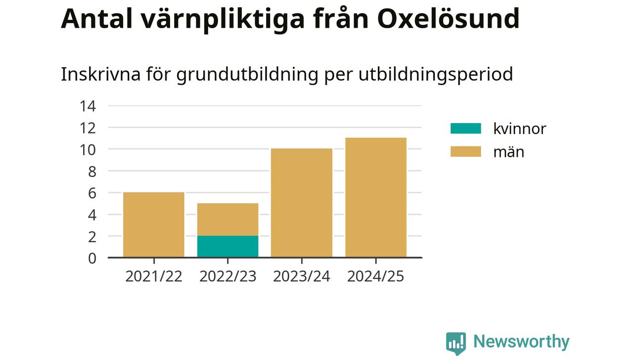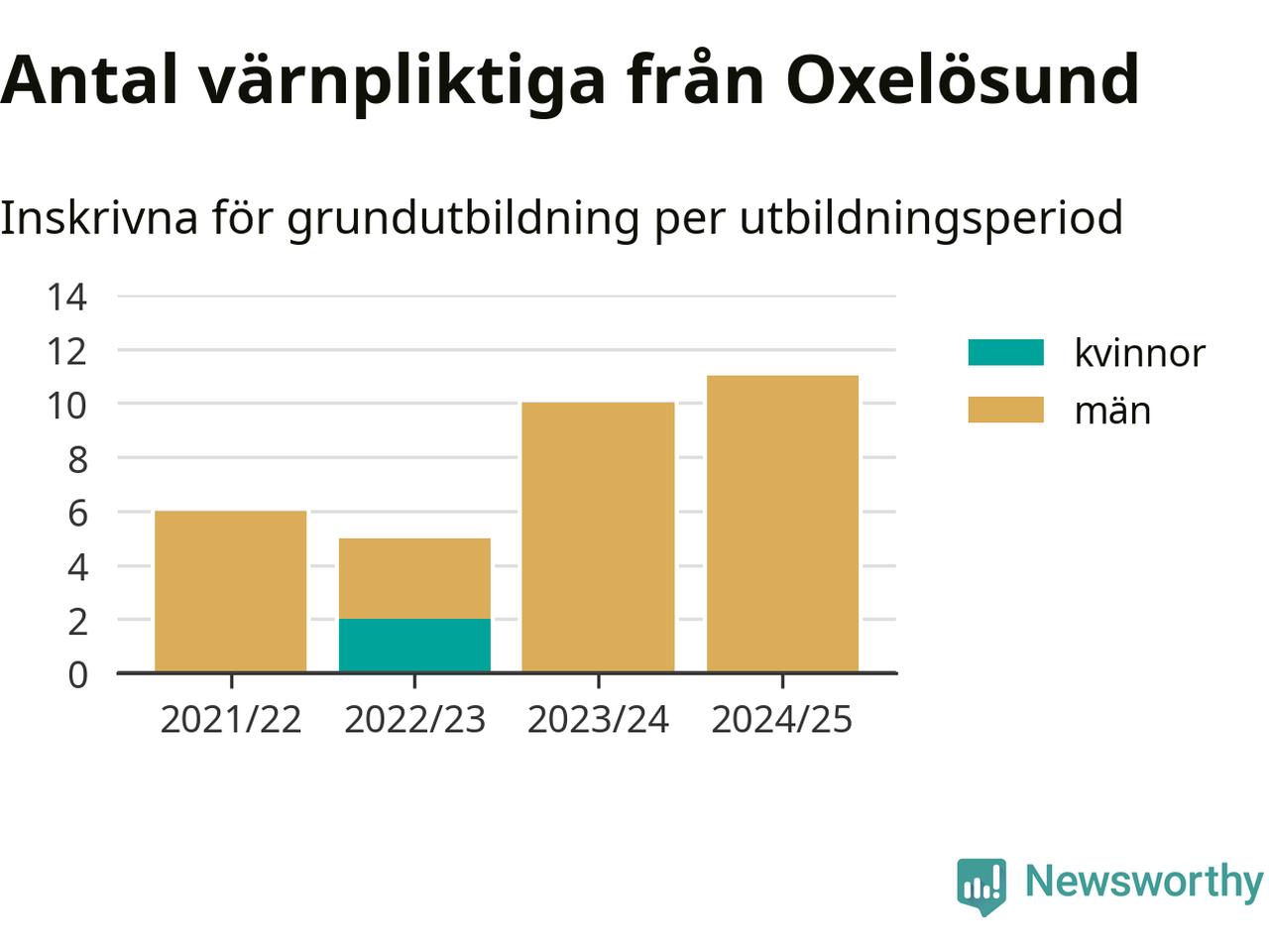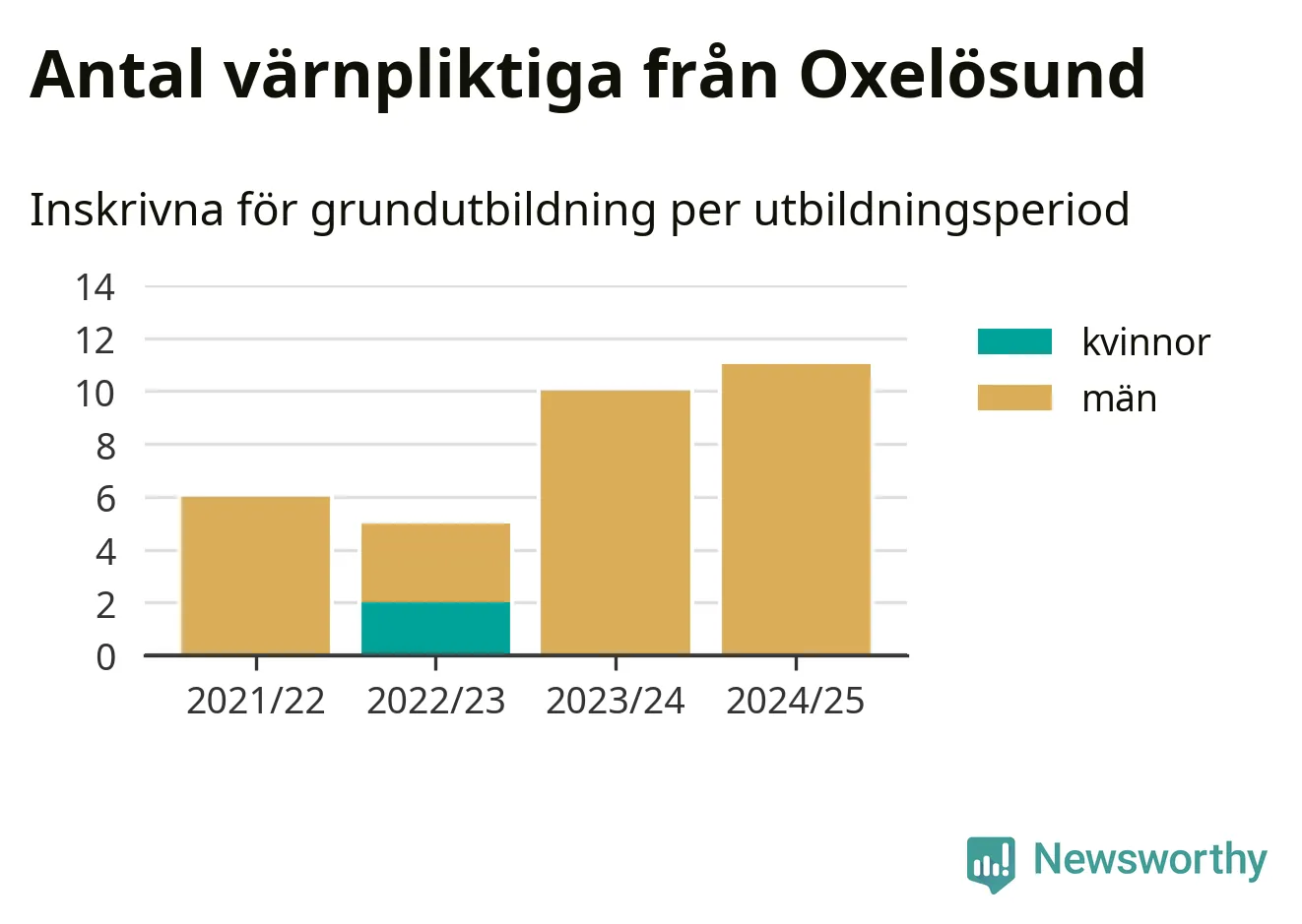 Antalet värnpliktiga från Oxelösund ökar stadigt, visar siffror från Plikt- och prövningsverket. Under det här värnpliktsåret, med utbildningsstart från juni 2024 till början av 2025, är elva värnpliktiga inskrivna för att påbörja sin grundutbildning. Det är den högsta siffran åtminstone sedan 2021/22, vilket är så långt bakåt vi har siffror på kommunnivå. Den allmänna värnplikten återinfördes 2018.