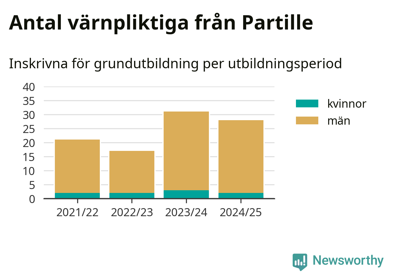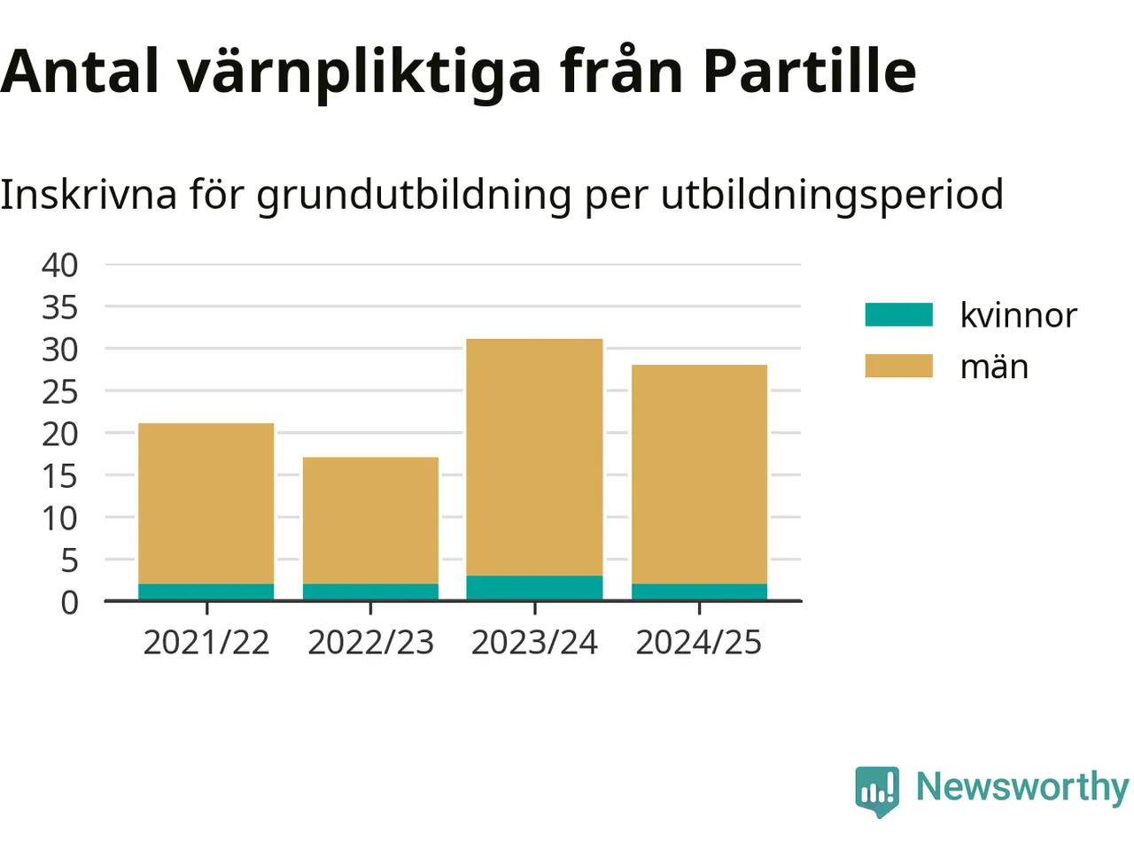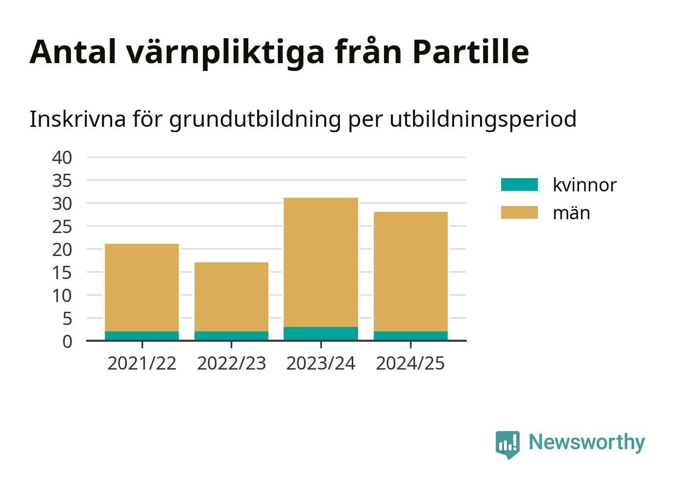 28 värnpliktiga från Partille har skrivits in för att göra lumpen under innevarande utbildningsperiod, som sträcker sig från juni 2024 till och med första halvåret 2025. Det är ett färre än året innan. Den allmänna värnplikten återinfördes 2018 och vi har siffror nedbrutna på kommunnivå sedan 2021/22. Som mest har 31 personer från Partille skrivits in, utbildningsperioden 2023/24.