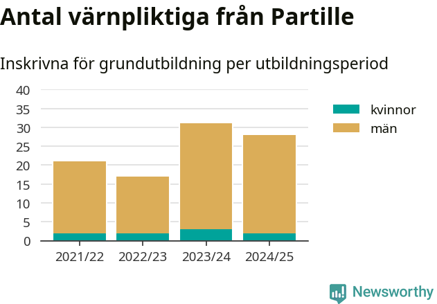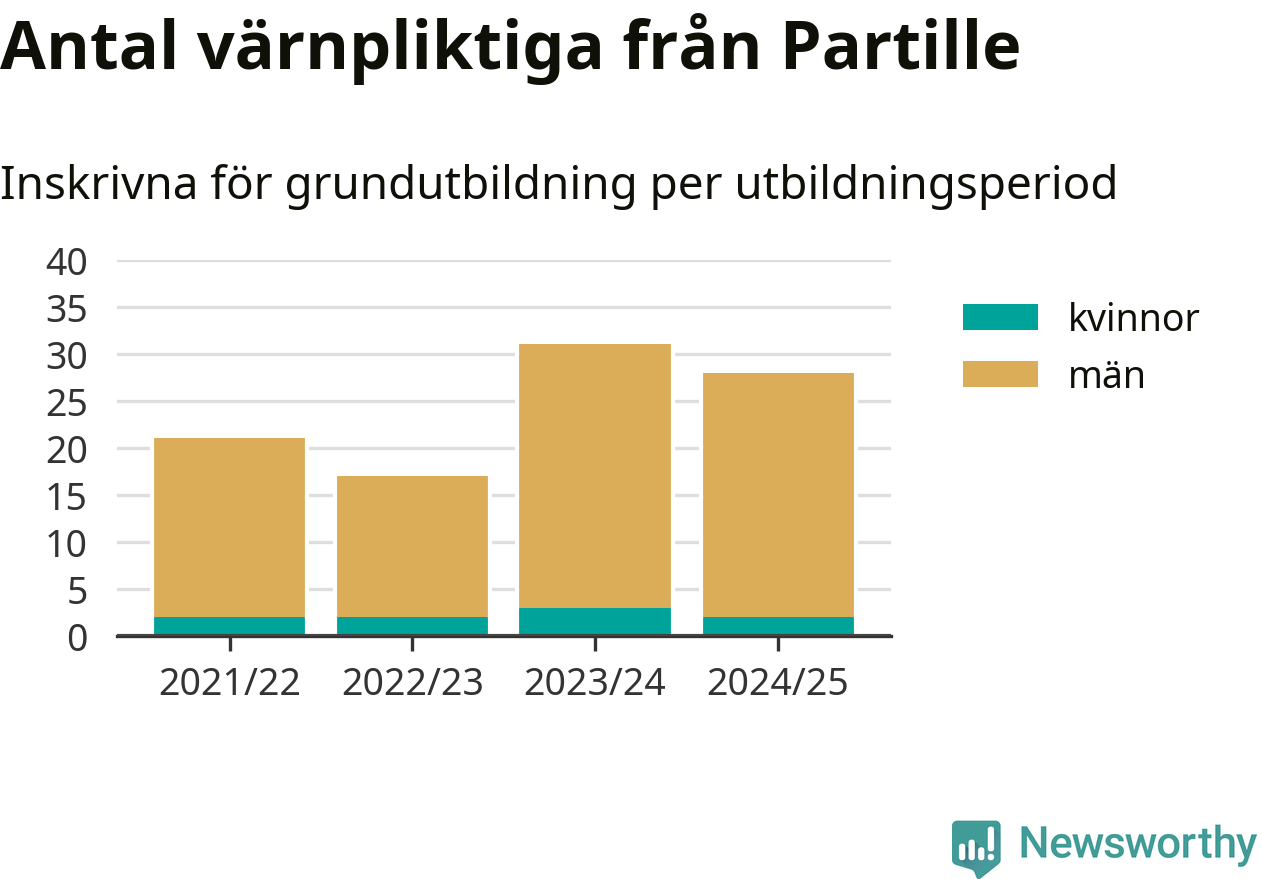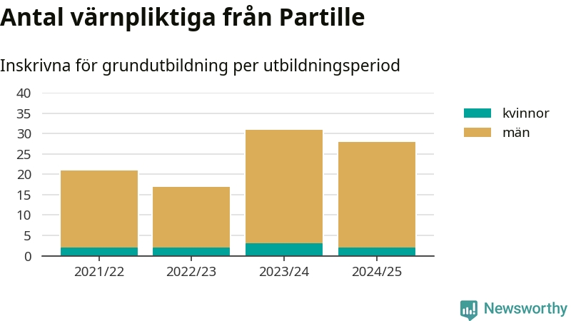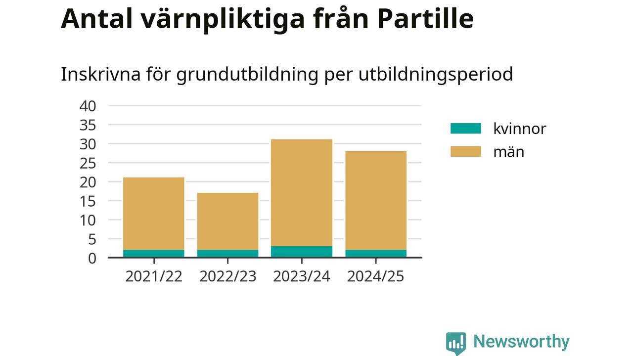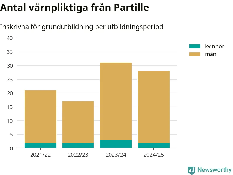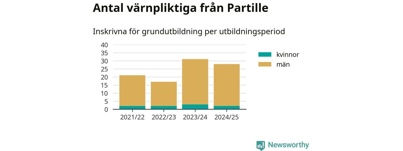 28 värnpliktiga från Partille har skrivits in för att göra lumpen under innevarande utbildningsperiod, som sträcker sig från juni 2024 till och med första halvåret 2025. Det är ett färre än året innan. Den allmänna värnplikten återinfördes 2018 och vi har siffror nedbrutna på kommunnivå sedan 2021/22. Som mest har 31 personer från Partille skrivits in, utbildningsperioden 2023/24.