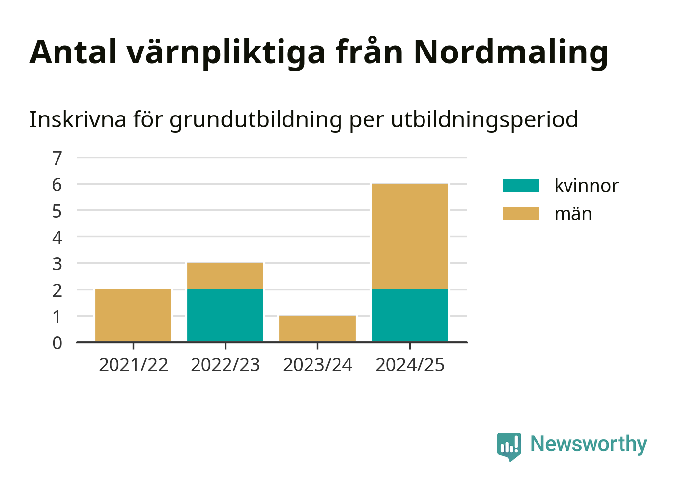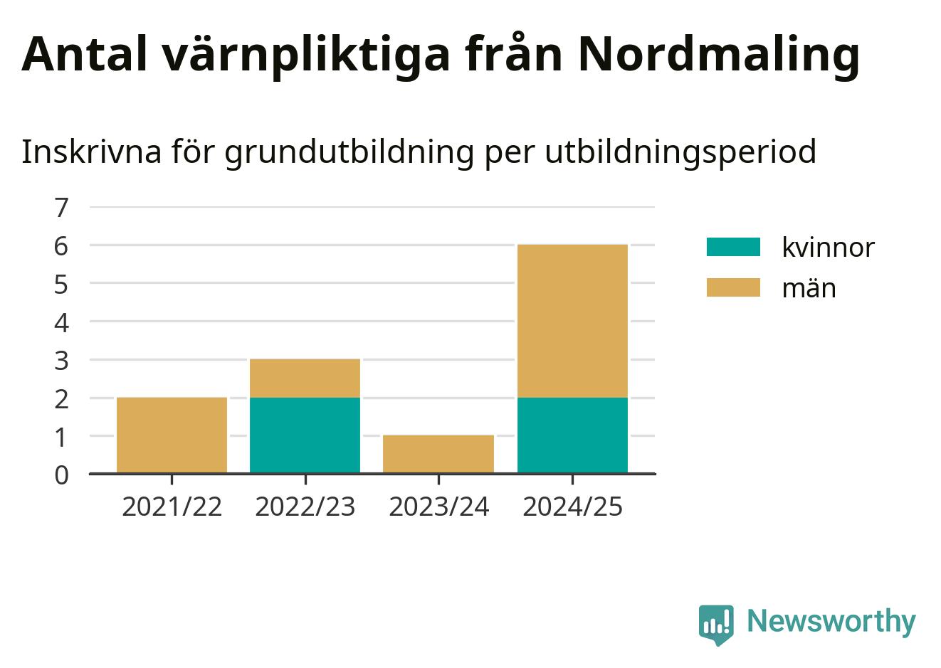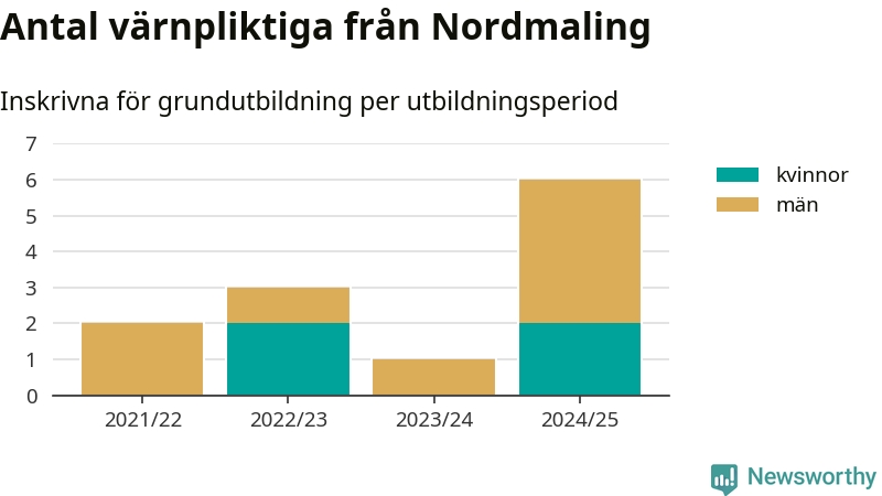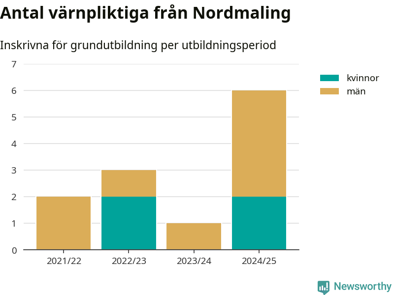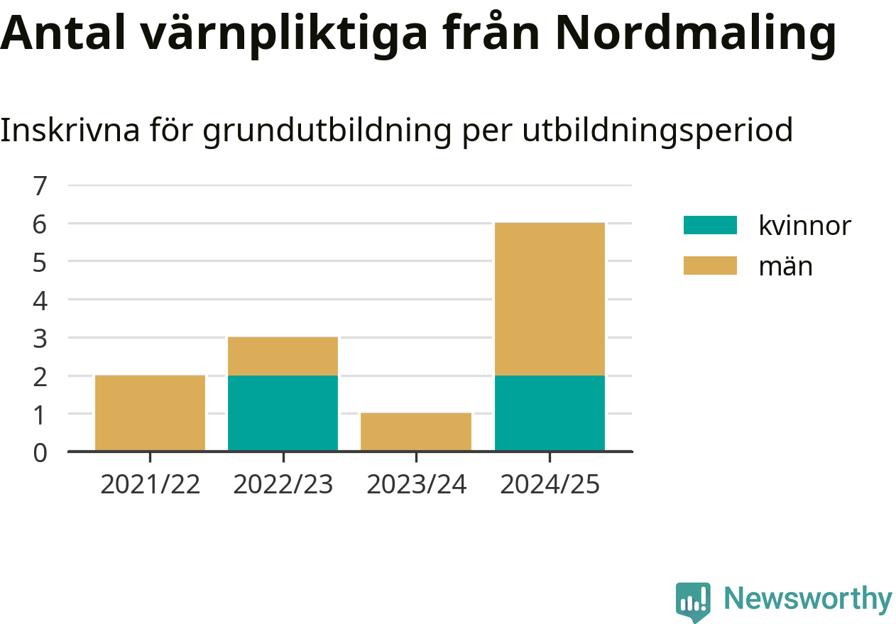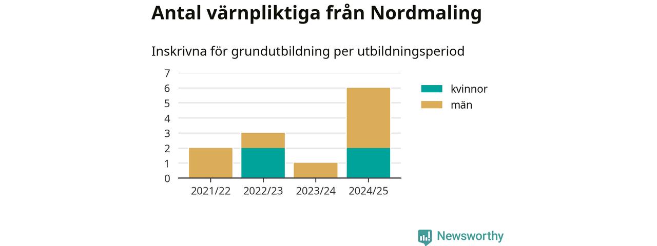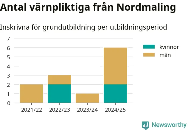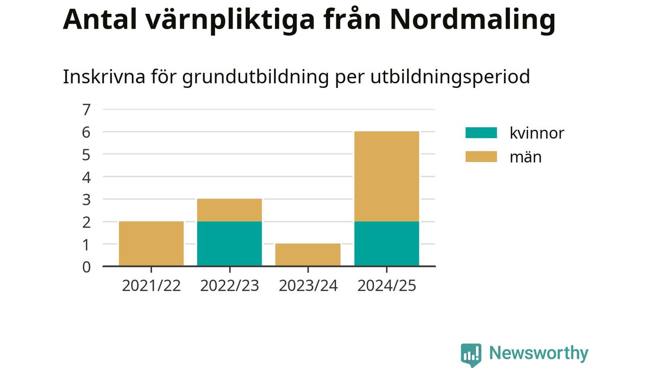 Sex värnpliktiga från Nordmaling har skrivits in för att göra lumpen under innevarande utbildningsperiod, som sträcker sig från juni 2024 till och med första halvåret 2025. Det är den högsta siffran åtminstone sedan 2021/22, vilket är så långt bakåt vi har siffror på kommunnivå. Den allmänna värnplikten återinfördes 2018.