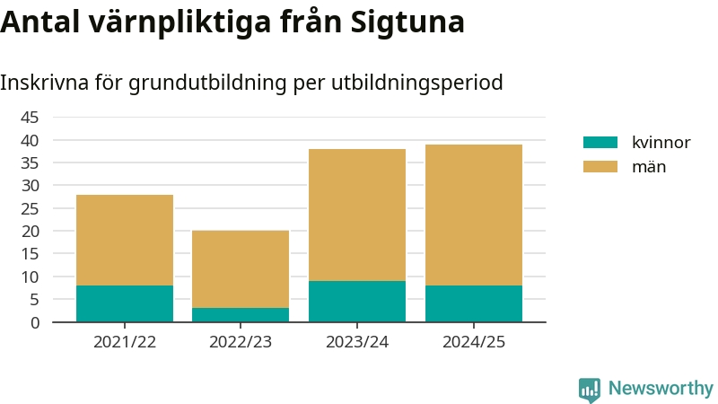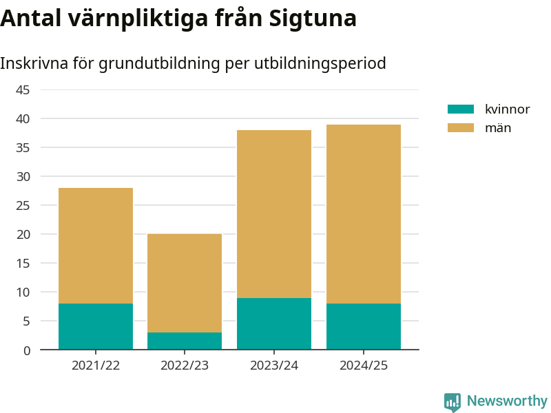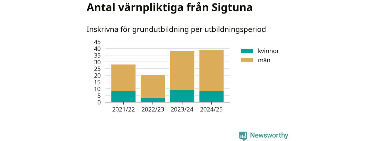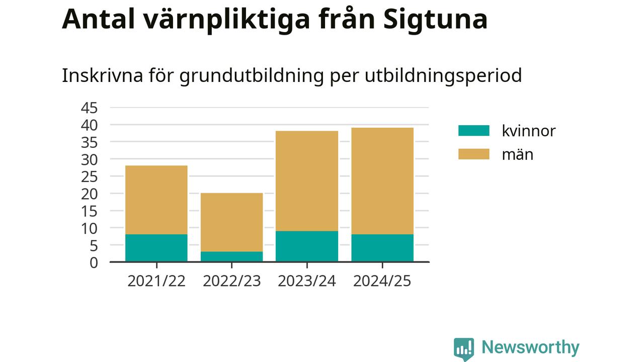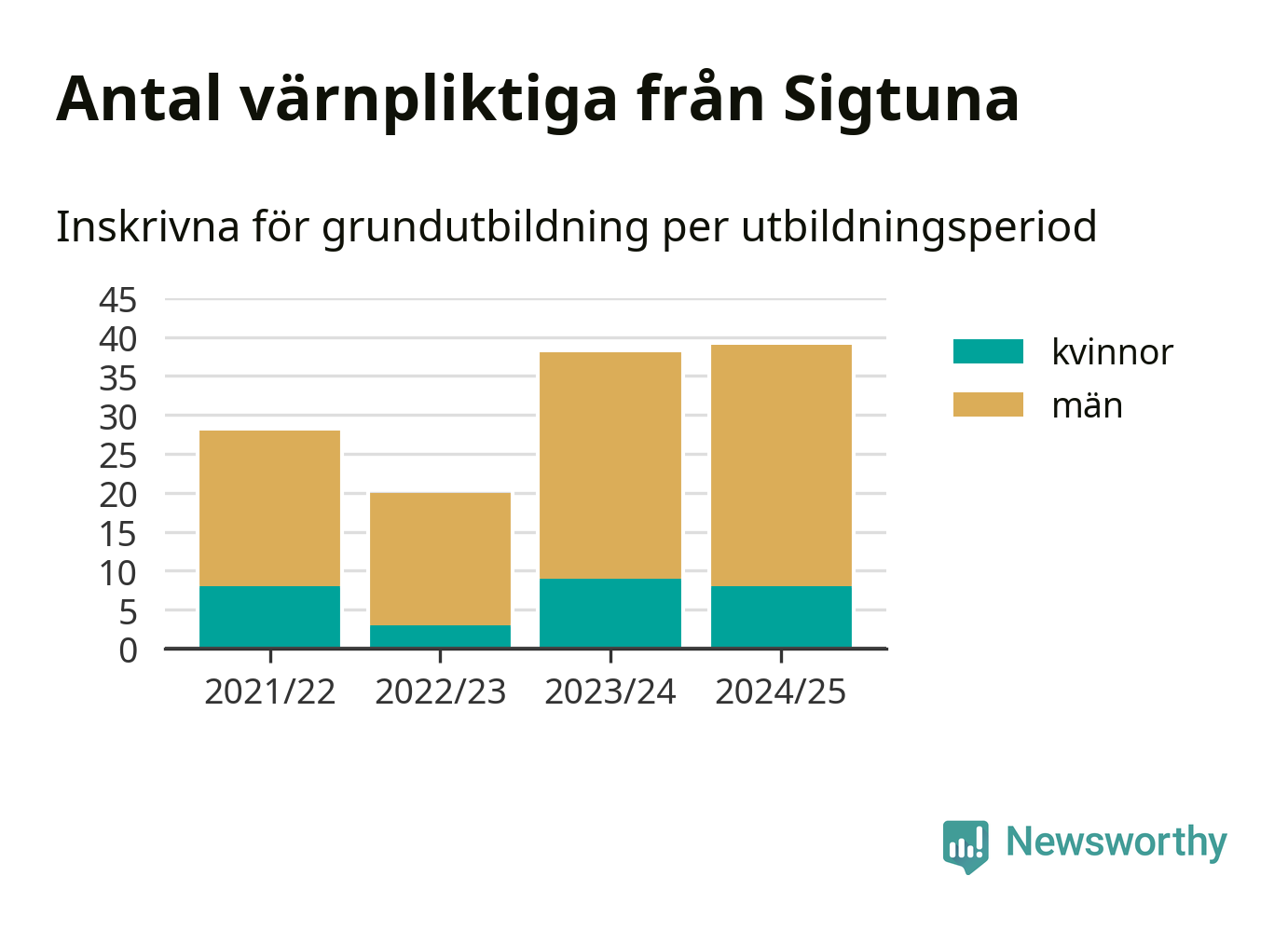 Antalet värnpliktiga från Sigtuna ökar stadigt, visar siffror från Plikt- och prövningsverket. Under det här värnpliktsåret, med utbildningsstart från juni 2024 till början av 2025, är 39 värnpliktiga inskrivna för att påbörja sin grundutbildning. Det är den högsta siffran åtminstone sedan 2021/22, vilket är så långt bakåt vi har siffror på kommunnivå. Den allmänna värnplikten återinfördes 2018.