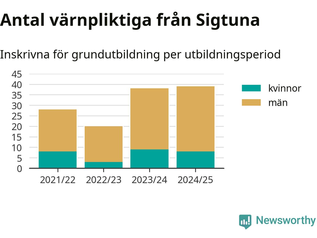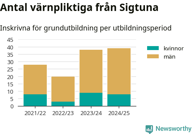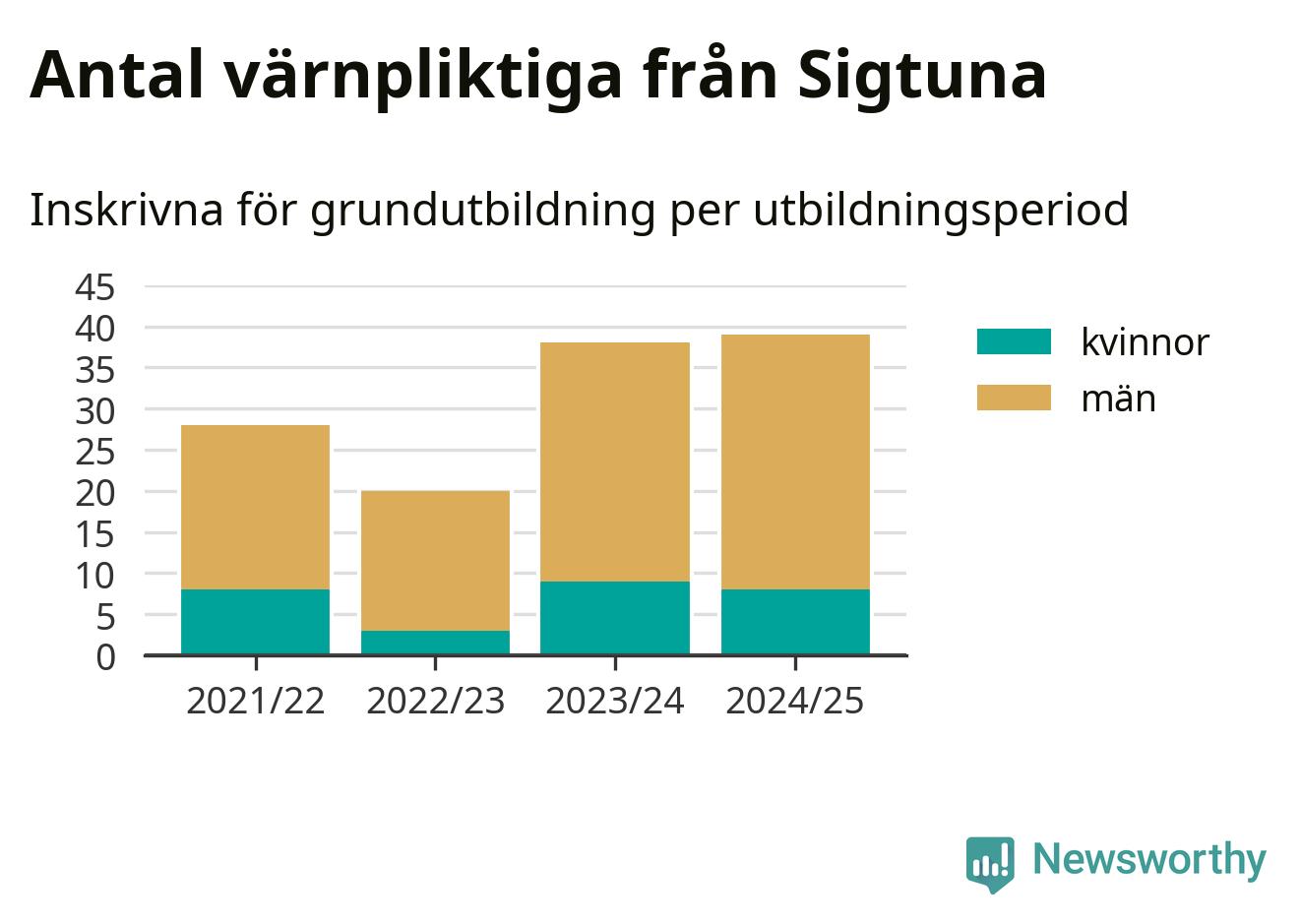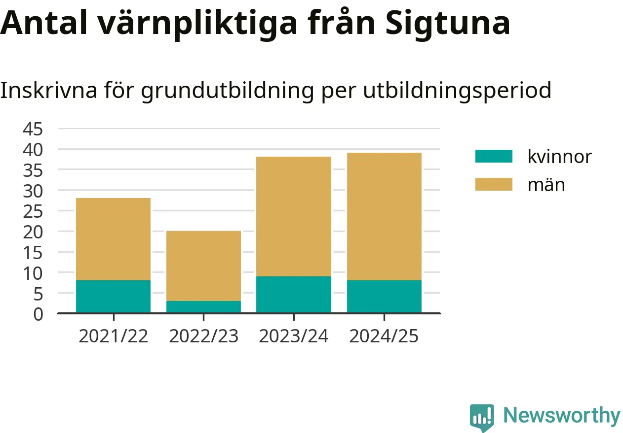 Antalet värnpliktiga från Sigtuna ökar stadigt, visar siffror från Plikt- och prövningsverket. Under det här värnpliktsåret, med utbildningsstart från juni 2024 till början av 2025, är 39 värnpliktiga inskrivna för att påbörja sin grundutbildning. Det är den högsta siffran åtminstone sedan 2021/22, vilket är så långt bakåt vi har siffror på kommunnivå. Den allmänna värnplikten återinfördes 2018.