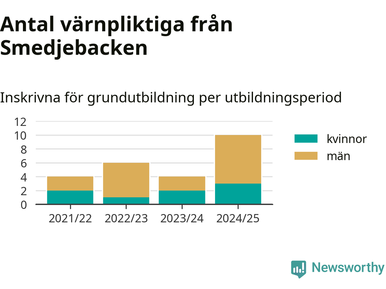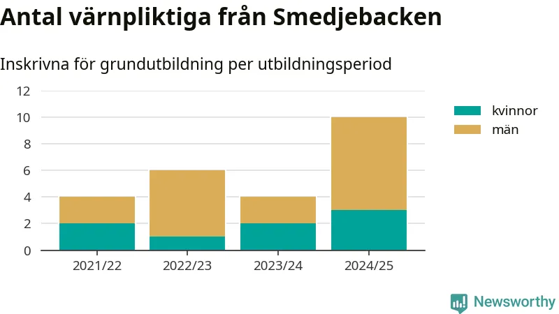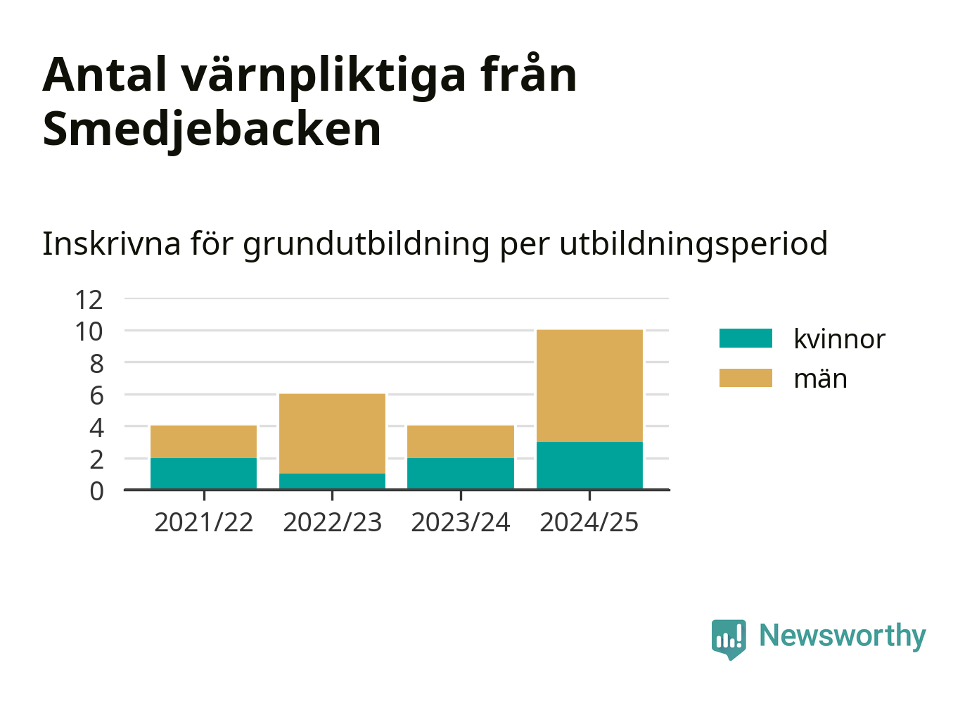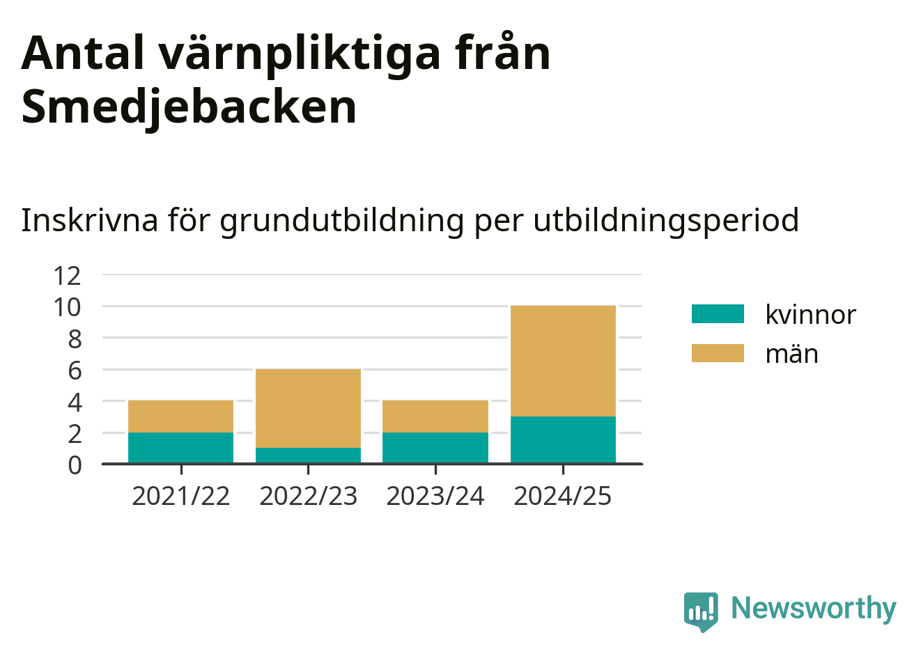 Tio värnpliktiga från Smedjebacken har skrivits in för att göra lumpen under innevarande utbildningsperiod, som sträcker sig från juni 2024 till och med första halvåret 2025. Det är den högsta siffran åtminstone sedan 2021/22, vilket är så långt bakåt vi har siffror på kommunnivå. Den allmänna värnplikten återinfördes 2018.