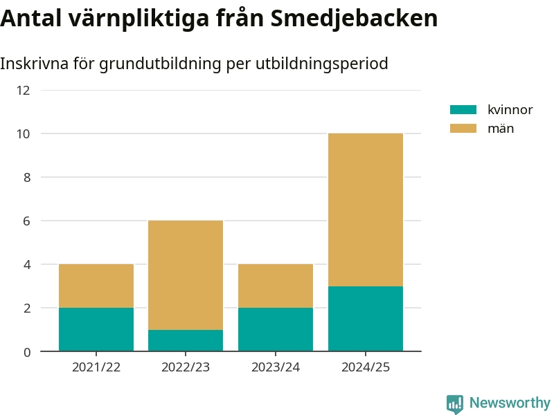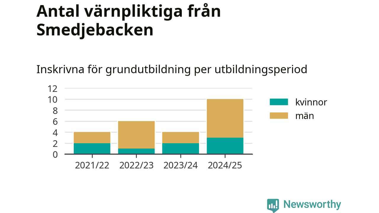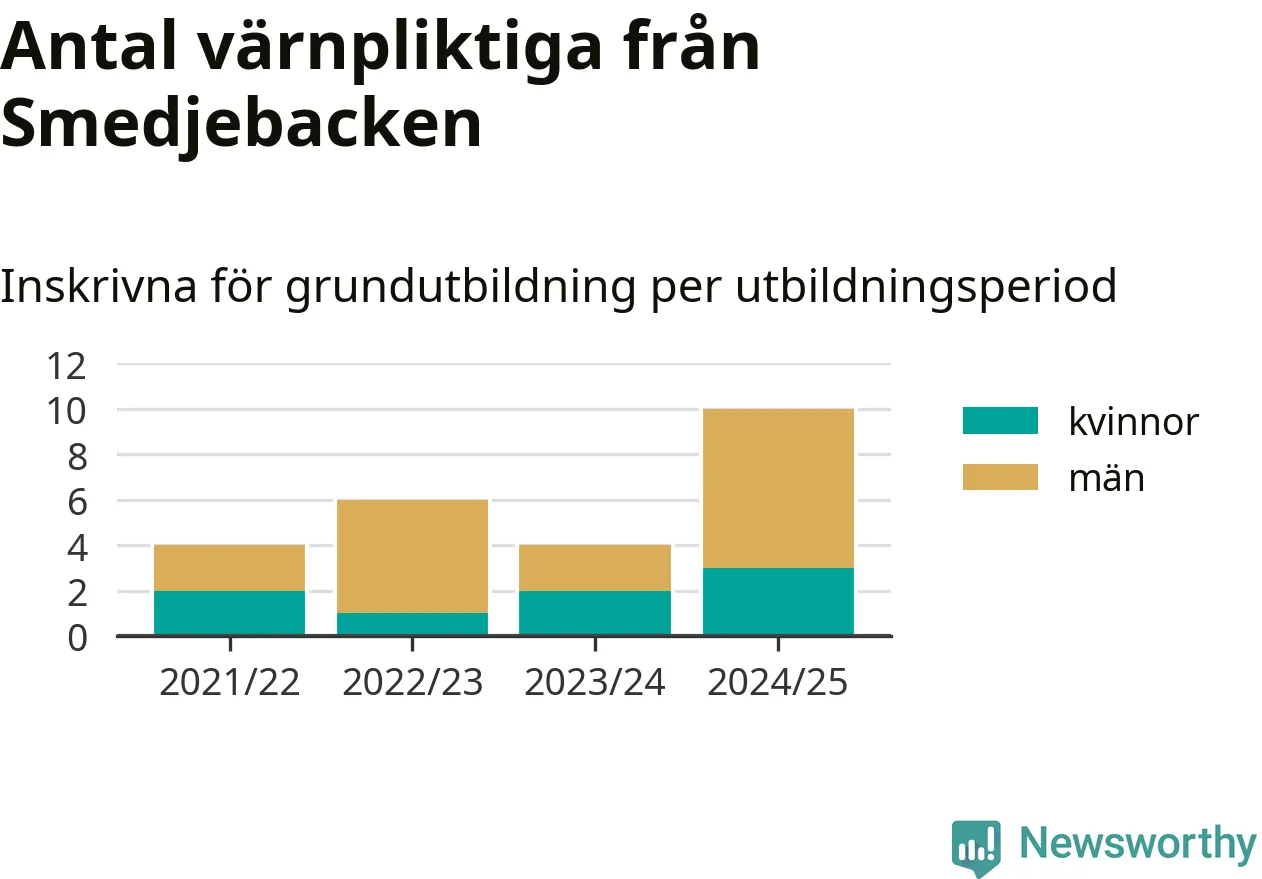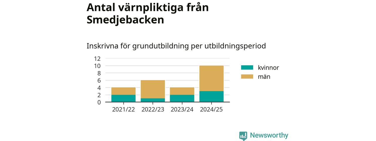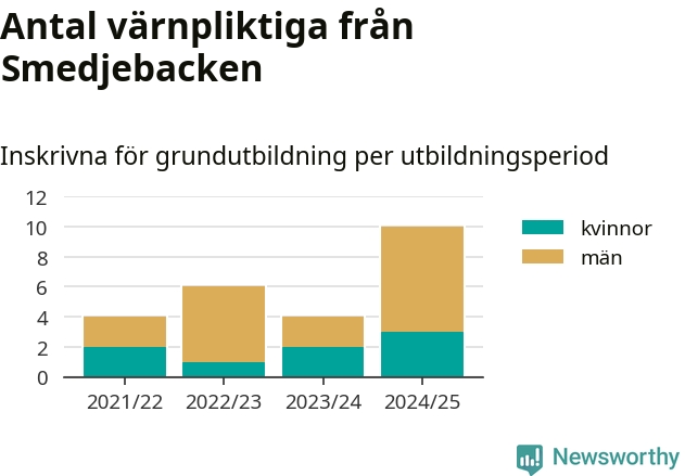 Tio värnpliktiga från Smedjebacken har skrivits in för att göra lumpen under innevarande utbildningsperiod, som sträcker sig från juni 2024 till och med första halvåret 2025. Det är den högsta siffran åtminstone sedan 2021/22, vilket är så långt bakåt vi har siffror på kommunnivå. Den allmänna värnplikten återinfördes 2018.