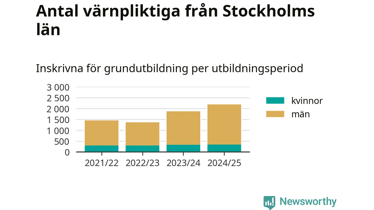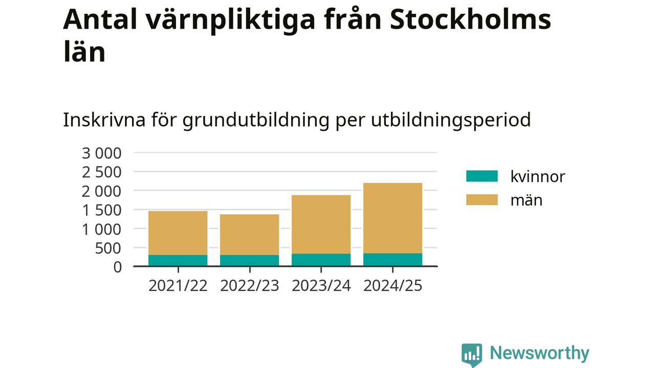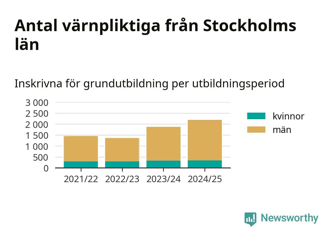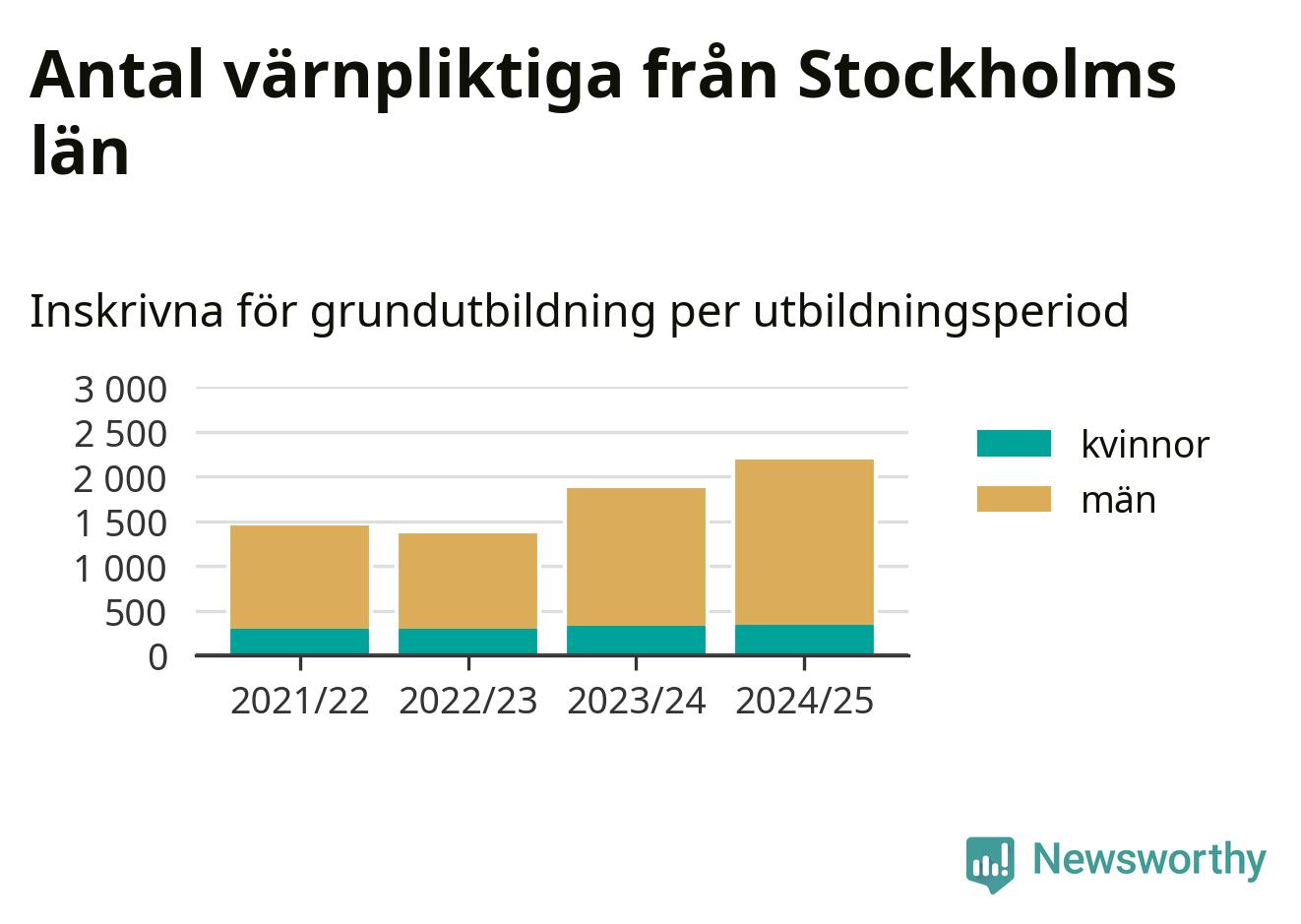 Antalet värnpliktiga från Stockholms län ökar stadigt, visar siffror från Plikt- och prövningsverket. Under det här värnpliktsåret, med utbildningsstart från juni 2024 till början av 2025, är 2 190 värnpliktiga inskrivna för att påbörja sin grundutbildning. Det är den högsta siffran åtminstone sedan 2021/22, vilket är så långt bakåt vi har siffror på länsnivå. Den allmänna värnplikten återinfördes 2018.