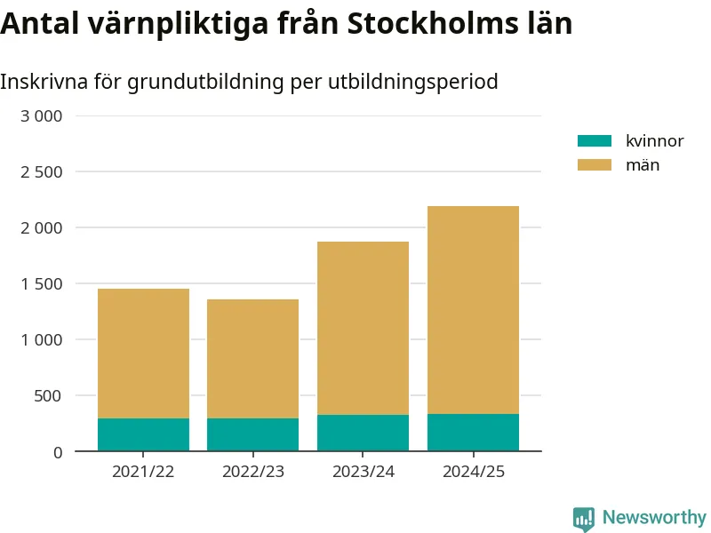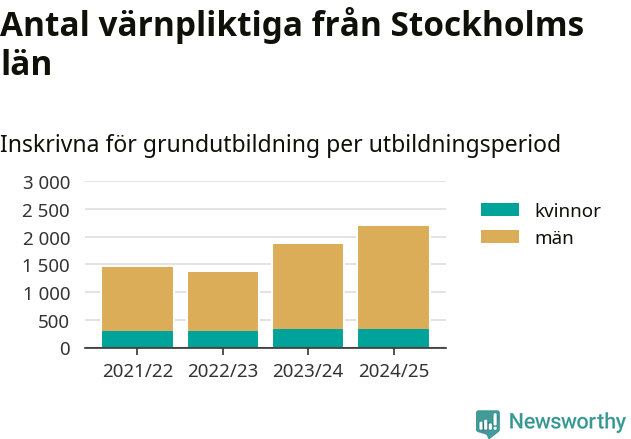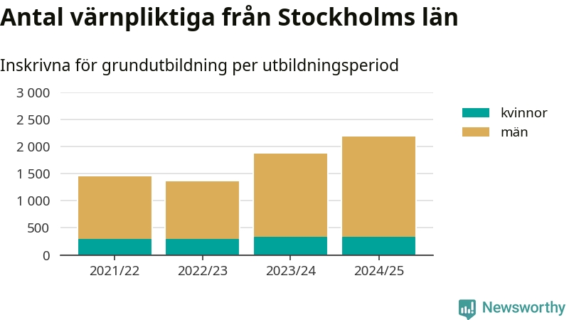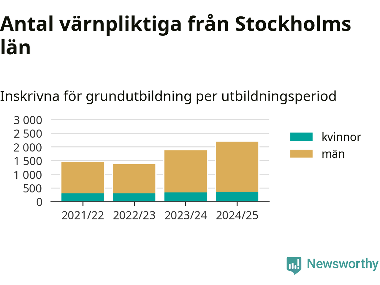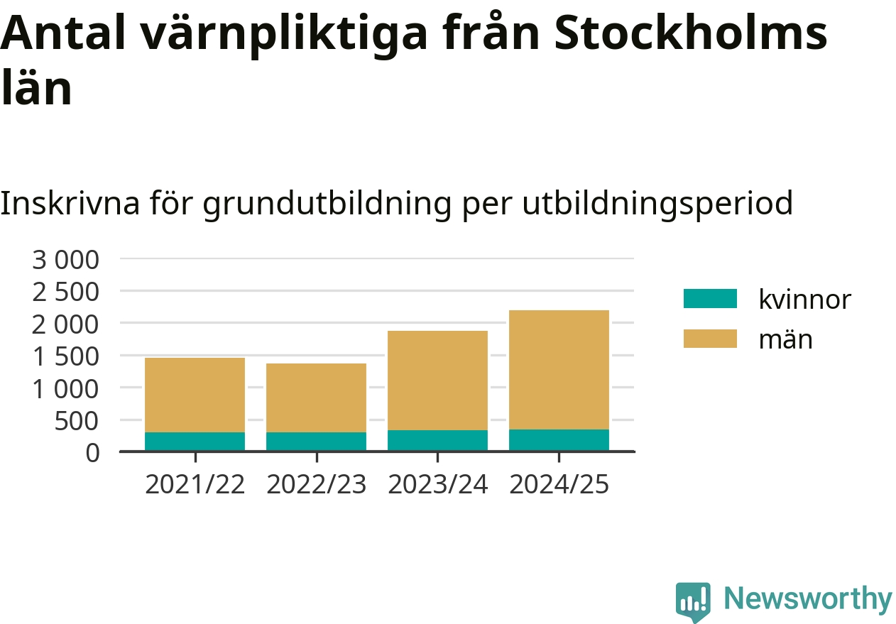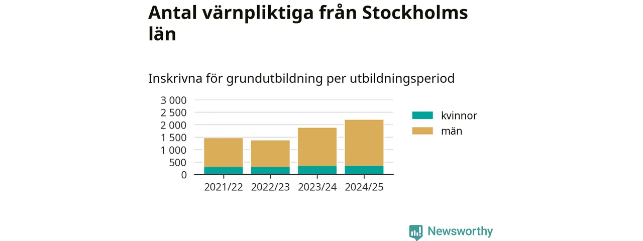 Antalet värnpliktiga från Stockholms län ökar stadigt, visar siffror från Plikt- och prövningsverket. Under det här värnpliktsåret, med utbildningsstart från juni 2024 till början av 2025, är 2 190 värnpliktiga inskrivna för att påbörja sin grundutbildning. Det är den högsta siffran åtminstone sedan 2021/22, vilket är så långt bakåt vi har siffror på länsnivå. Den allmänna värnplikten återinfördes 2018.