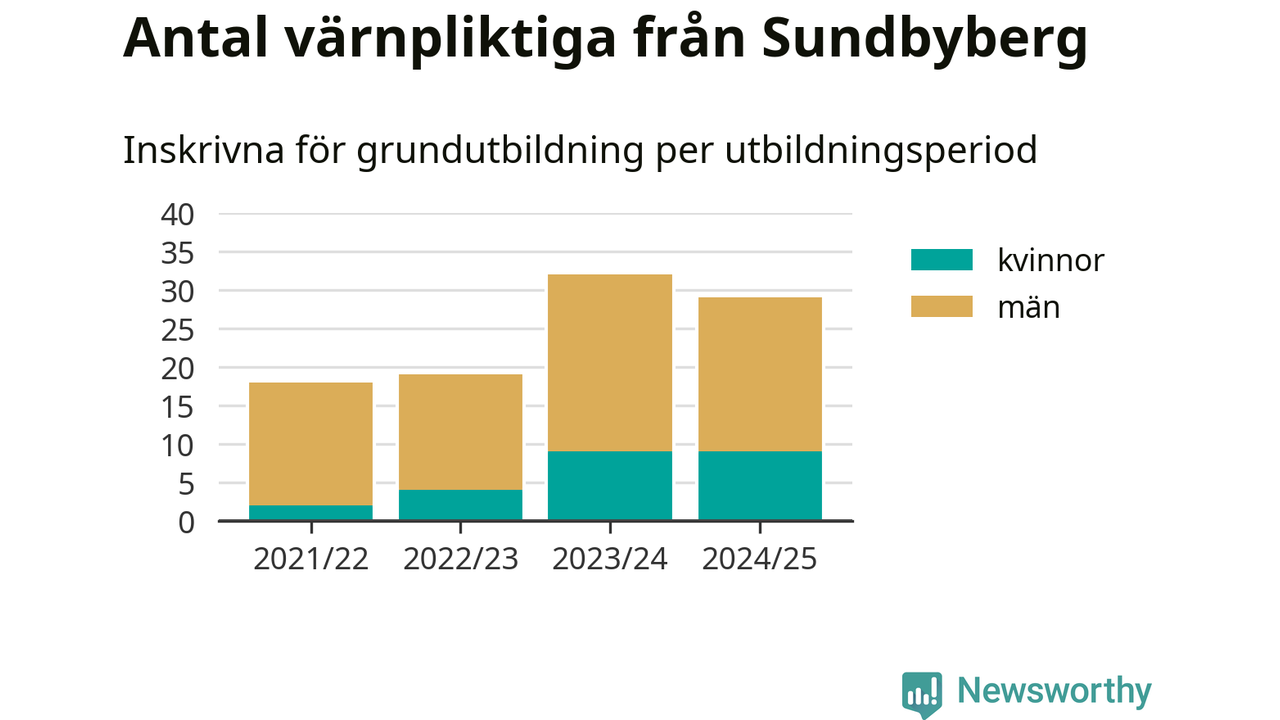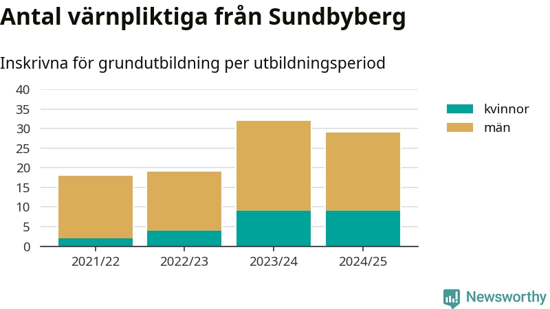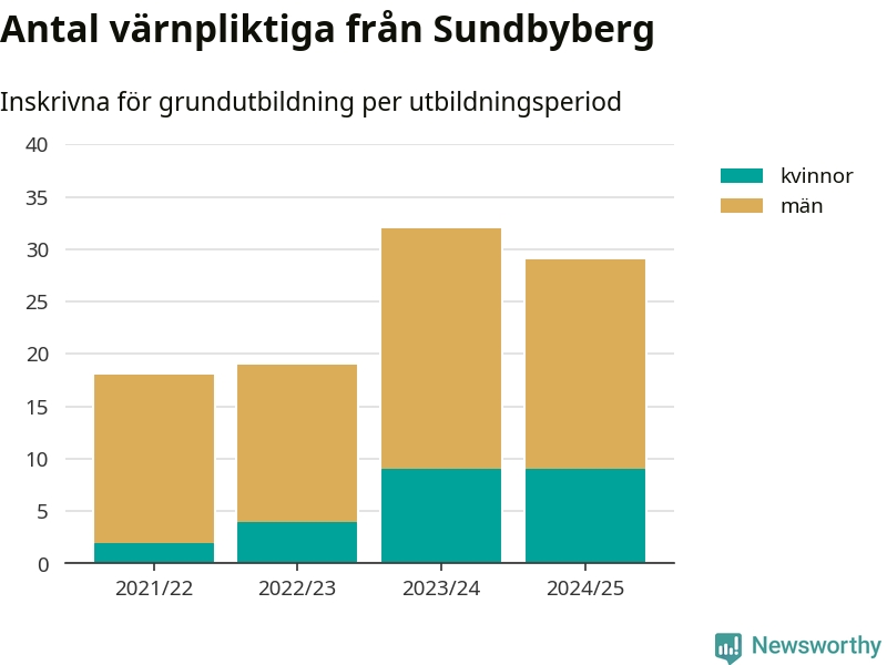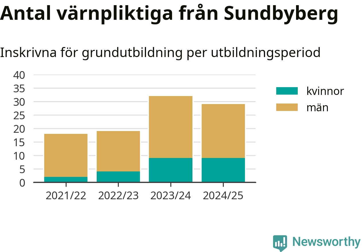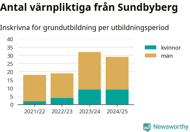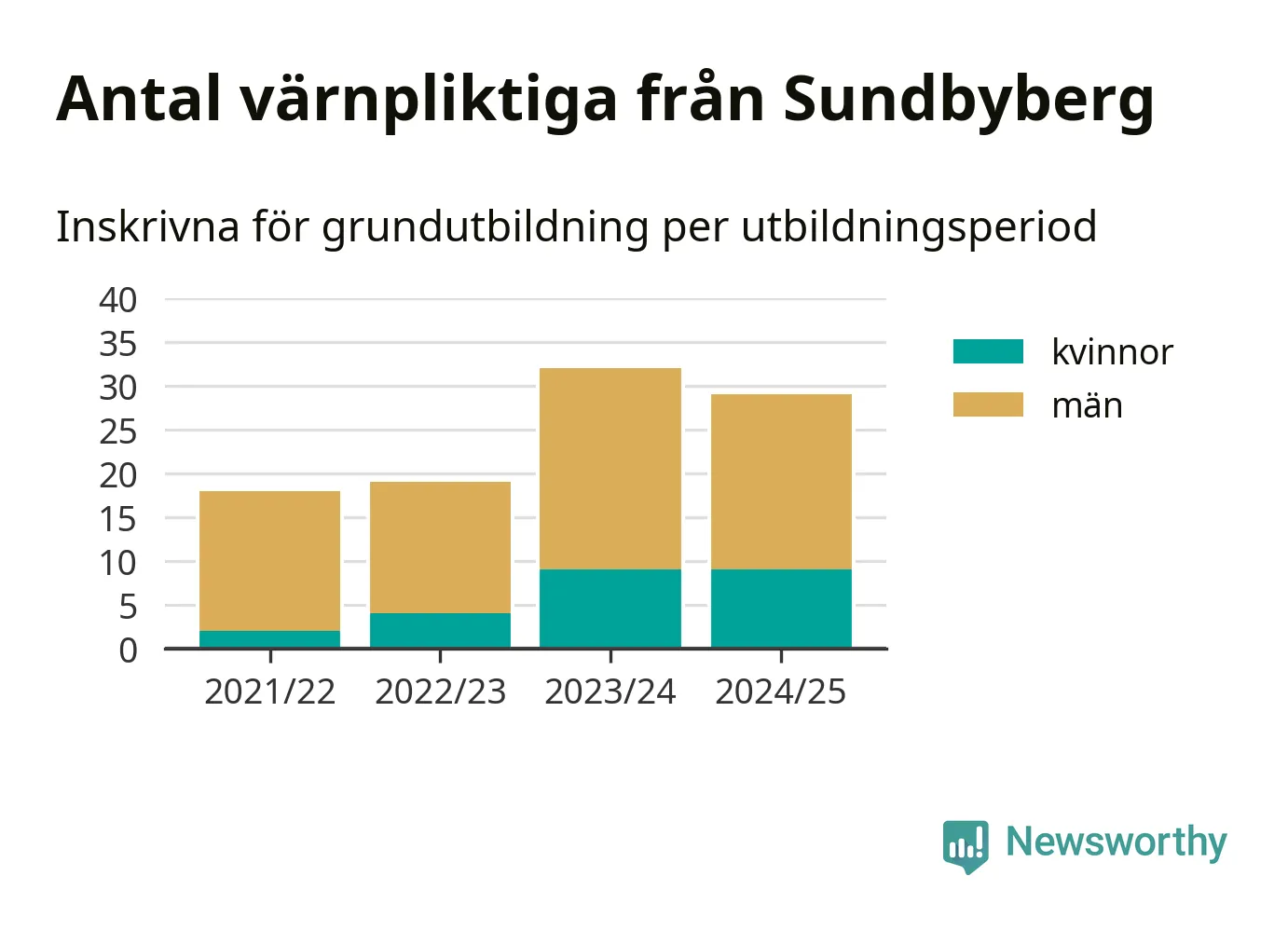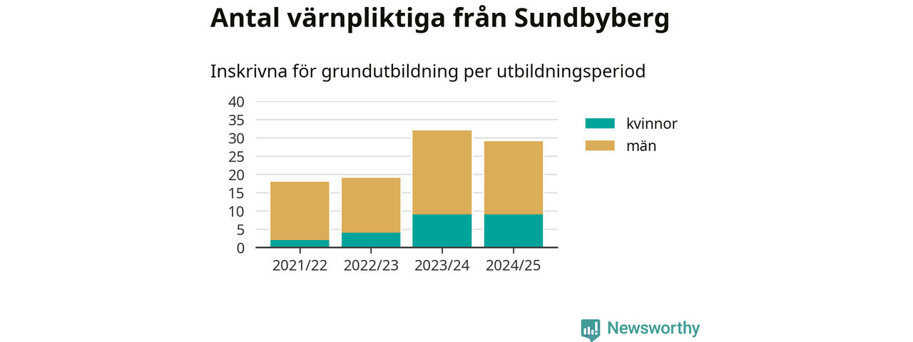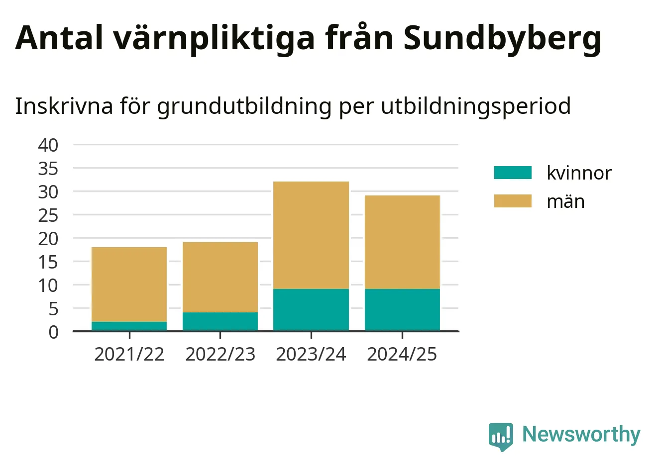 29 värnpliktiga från Sundbyberg har skrivits in för att göra lumpen under innevarande utbildningsperiod, som sträcker sig från juni 2024 till och med första halvåret 2025. Det är lika många som året innan. Den allmänna värnplikten återinfördes 2018 och vi har siffror nedbrutna på kommunnivå sedan 2021/22. Som mest har 32 personer från Sundbyberg skrivits in, utbildningsperioden 2023/24.