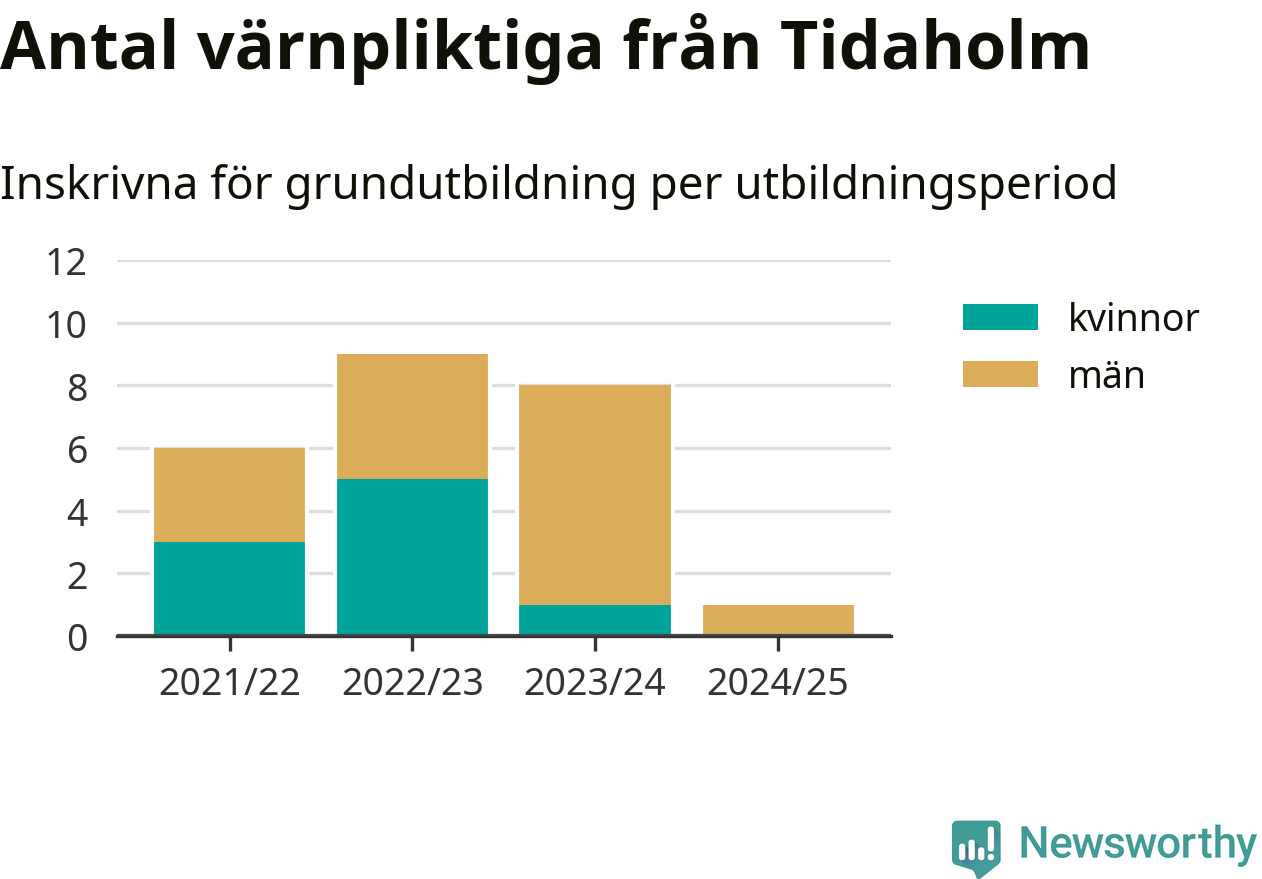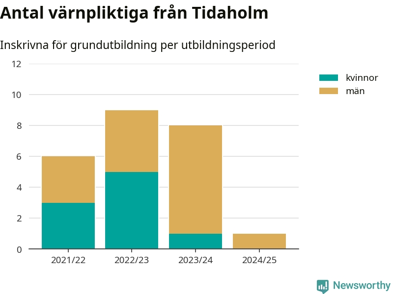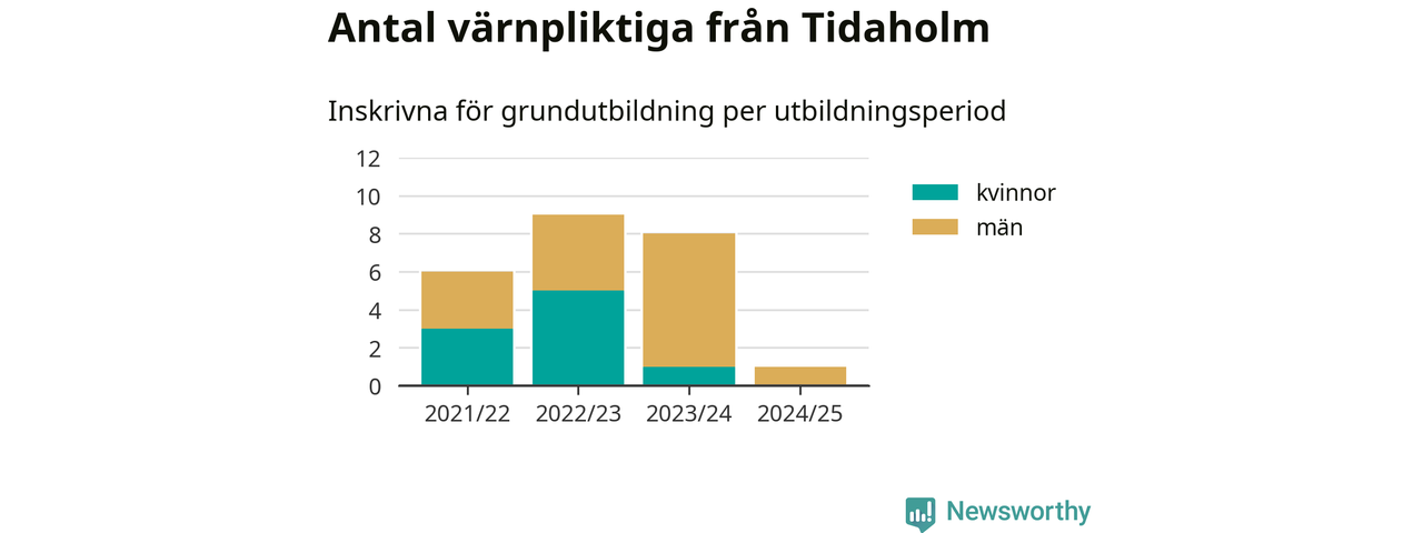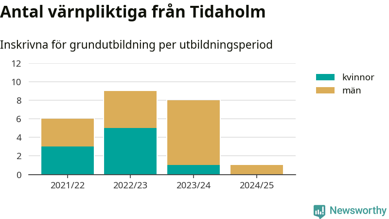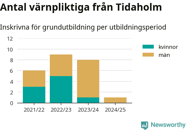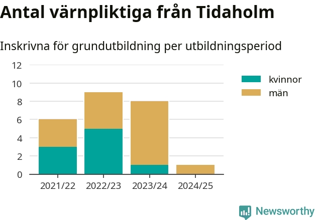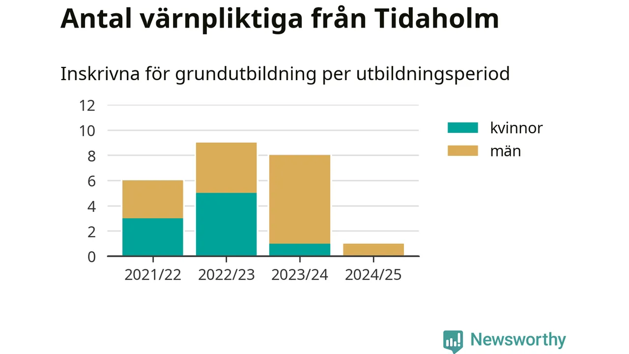 Ett värnpliktig från Tidaholm har skrivits in för att göra lumpen under innevarande utbildningsperiod, som sträcker sig från juni 2024 till och med första halvåret 2025. Det är ett färre än året innan. Den allmänna värnplikten återinfördes 2018 och vi har siffror nedbrutna på kommunnivå sedan 2021/22. Som mest har nio personer från Tidaholm skrivits in, utbildningsperioden 2022/23.