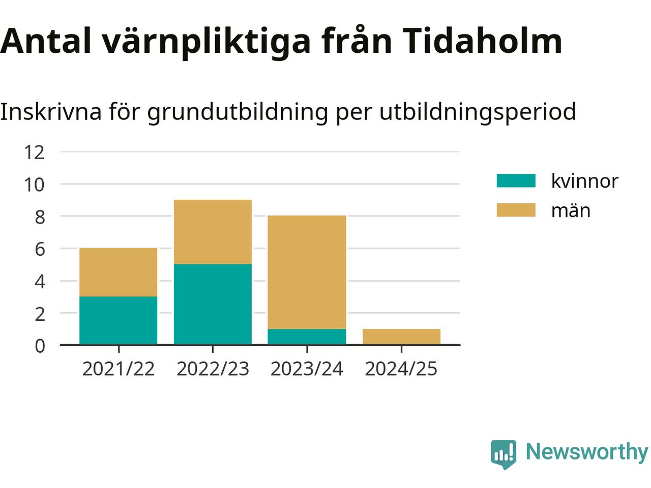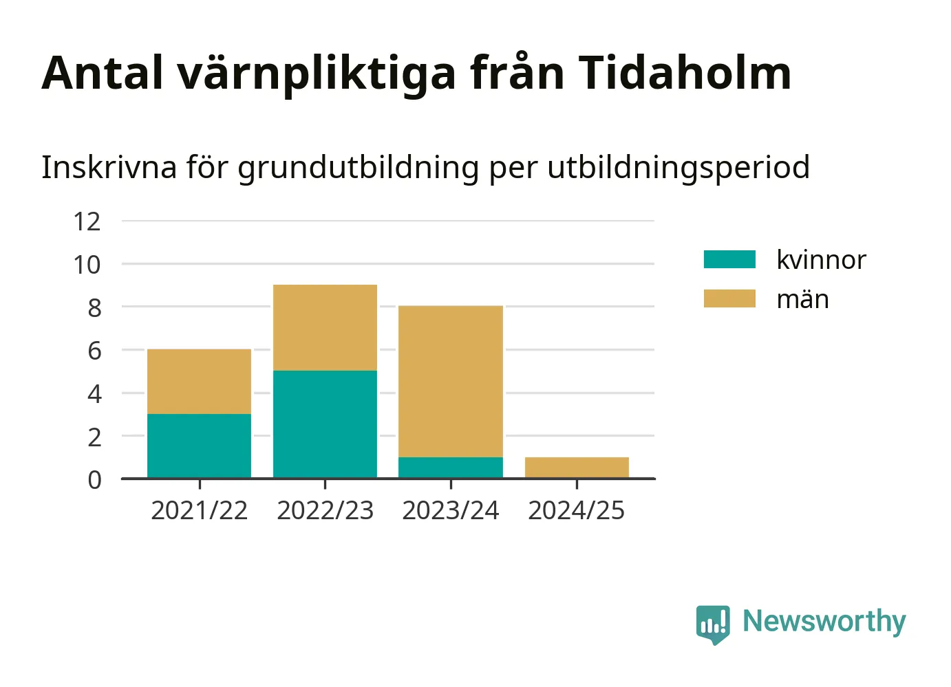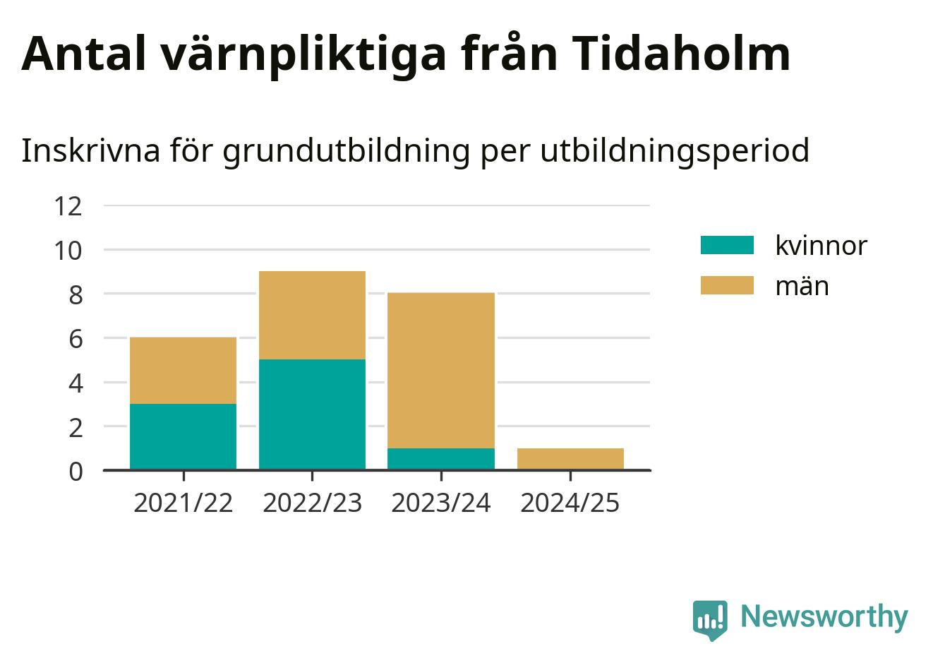 Ett värnpliktig från Tidaholm har skrivits in för att göra lumpen under innevarande utbildningsperiod, som sträcker sig från juni 2024 till och med första halvåret 2025. Det är ett färre än året innan. Den allmänna värnplikten återinfördes 2018 och vi har siffror nedbrutna på kommunnivå sedan 2021/22. Som mest har nio personer från Tidaholm skrivits in, utbildningsperioden 2022/23.