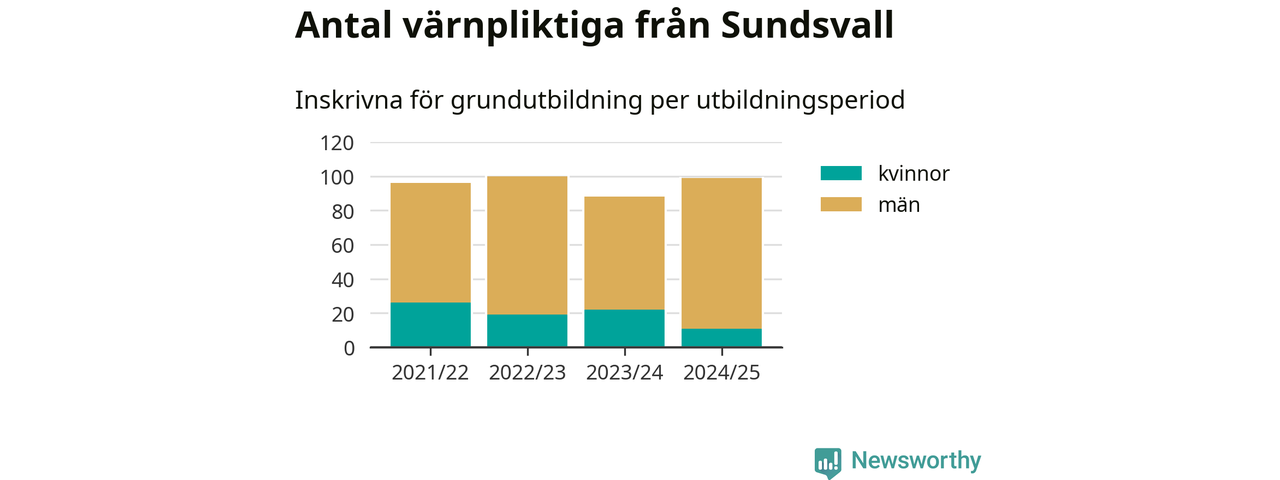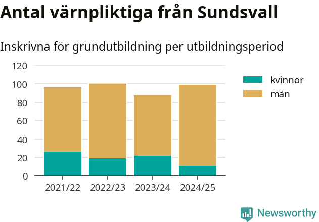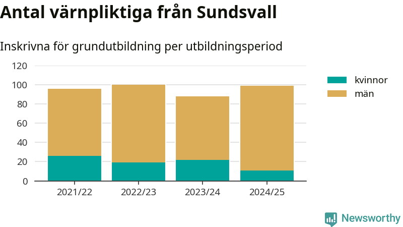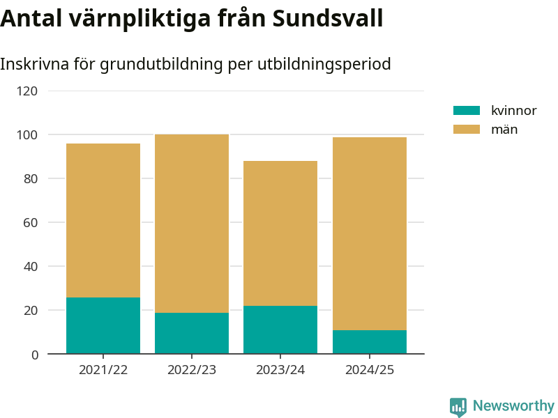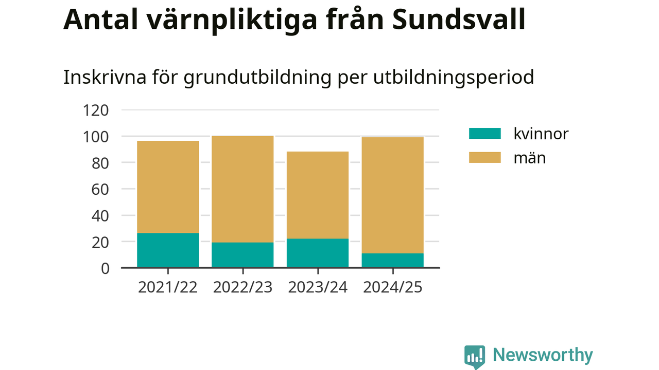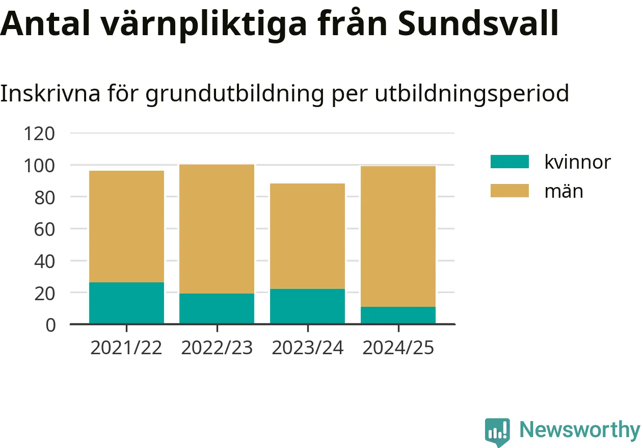 99 värnpliktiga från Sundsvall har skrivits in för att göra lumpen under innevarande utbildningsperiod, som sträcker sig från juni 2024 till och med första halvåret 2025. Det är elva färre än året innan. Den allmänna värnplikten återinfördes 2018 och vi har siffror nedbrutna på kommunnivå sedan 2021/22. Som mest har 100 personer från Sundsvall skrivits in, utbildningsperioden 2022/23.